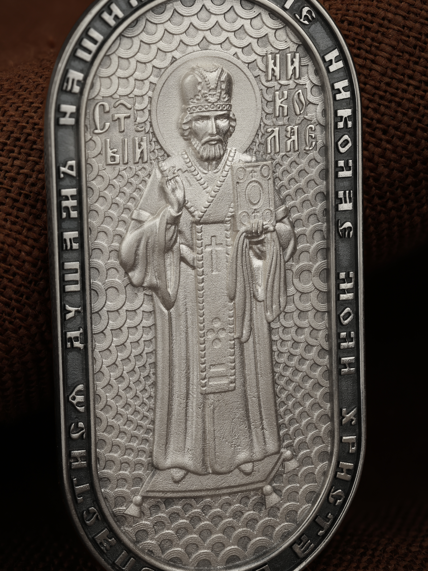 На оборотной стороне изображен Святой Николай Чудотворец, которого еще называют Николай Угодник — помощник в делах, покровитель учащихся, утешитель обиженных и нуждающихся, целитель самых страшных и тяжелых недугов, предстатель и молитвенник за людей перед Богом. Также Святитель Николай Чудотворец известен своими молитвами за путешественников, когда непрестанный ветер и бушующие волны утихают и корабль заходит в спокойную гавань. По контуру написана молитва: «Отче, Николай, моли Христа Бога спастися душам нашим». На кулонном кольце помещено изображение Спаса Нерукотворного.
