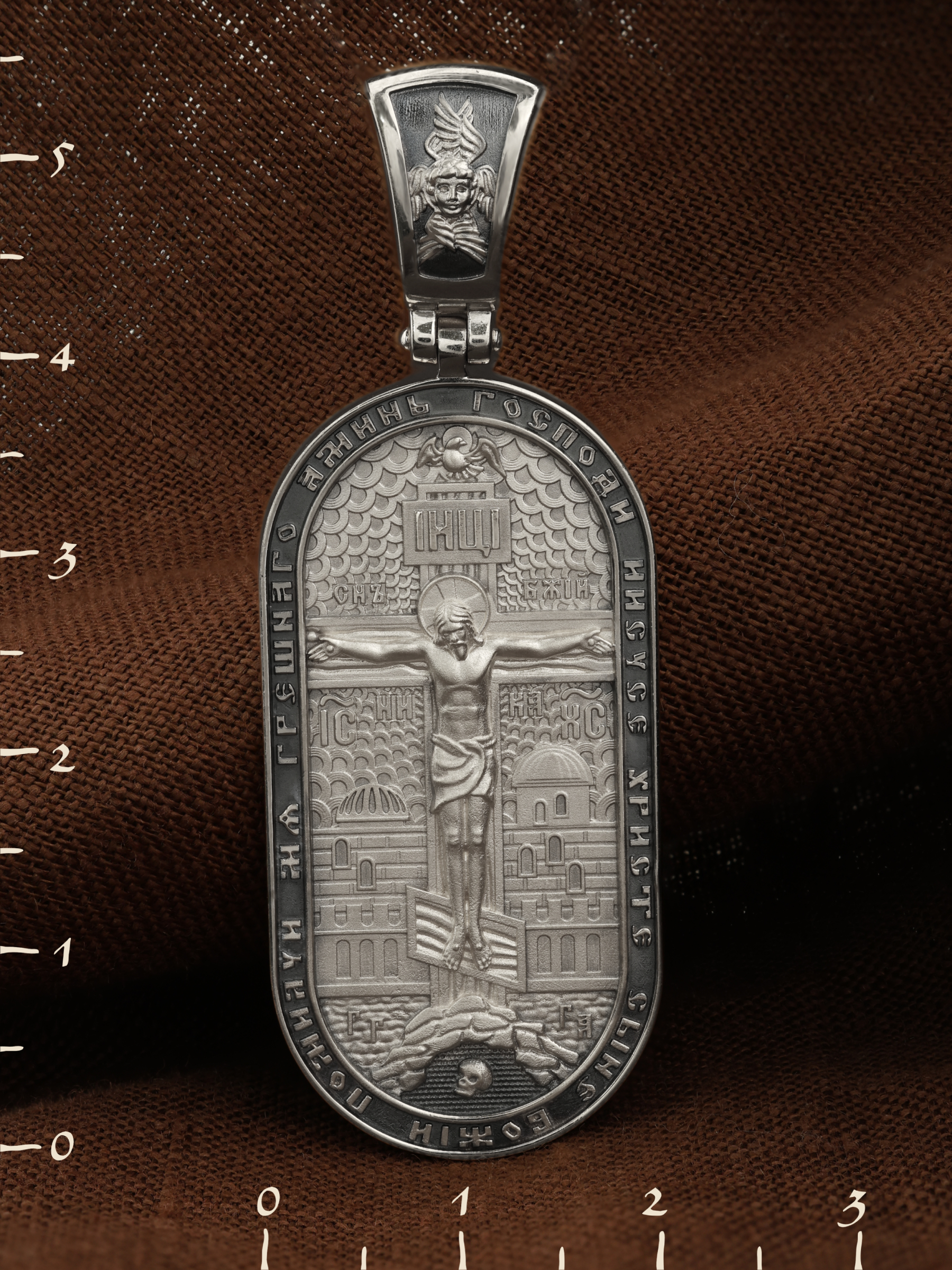 Центральную часть лицевой стороны занимает Распятие Христа — образ жертвы, принесенной Господом за грехи людей. Именно ко Христу, сошедшему на землю ради нашего спасения, возносятся все молитвы. Рядом с Его образом помещены слова — «НИКА» (греч. — Победитель) и «СЫН БОЖИЙ». Эти слова характеризуют Господа как Великого Архиерея, победителя смерти. Также Распятие сопровождается надписями, олицетворяющими Христа — это святое имя Христа «IC» (Иисус) «ХС» (Христос). Верхняя перекладина символизирует собой табличку с надписью «IHЦI» — Иисус Назарянин Царь Иудейский. Возвышение, на котором стоит Крест, символизирует гору Голгофу, на которой произошло Распятие. У подножия Креста изображают прах Адама, обозначенный черепом. На кулонном кольце изображен шестикрылый Серафим — самый приближенный к Господу Ангел. По контуру образка написана молитва: «Господи Иисусе Христе, Сыне Божий, помилуй мя грешного. Аминь»