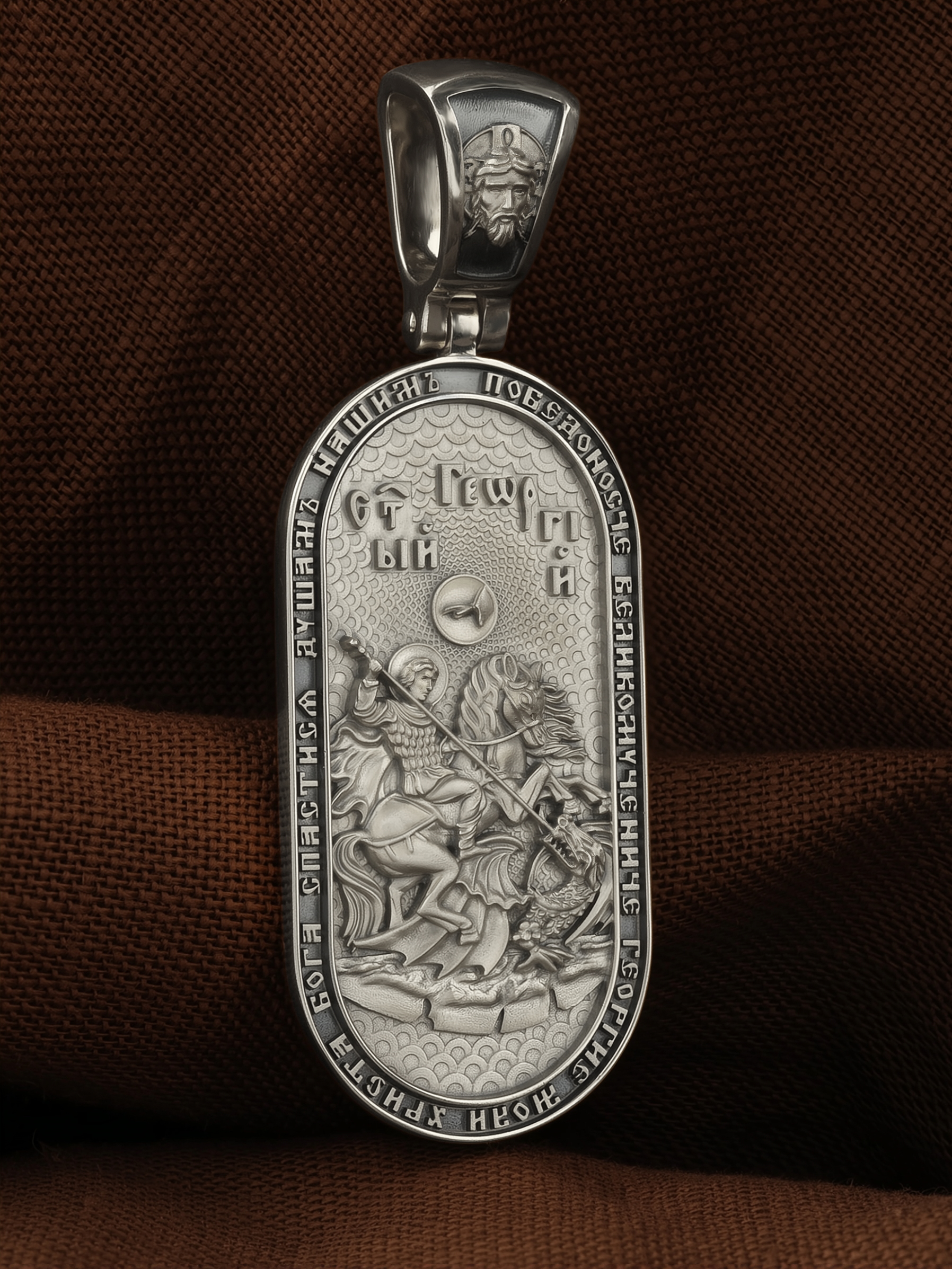 По контуру написана молитва: «Победоносче Великомучениче Георгие, моли Христа Бога спастися душам нашим». На кулонном кольце изображен Спас Нерукотворный — Символ вочеловечившегося Божества.
