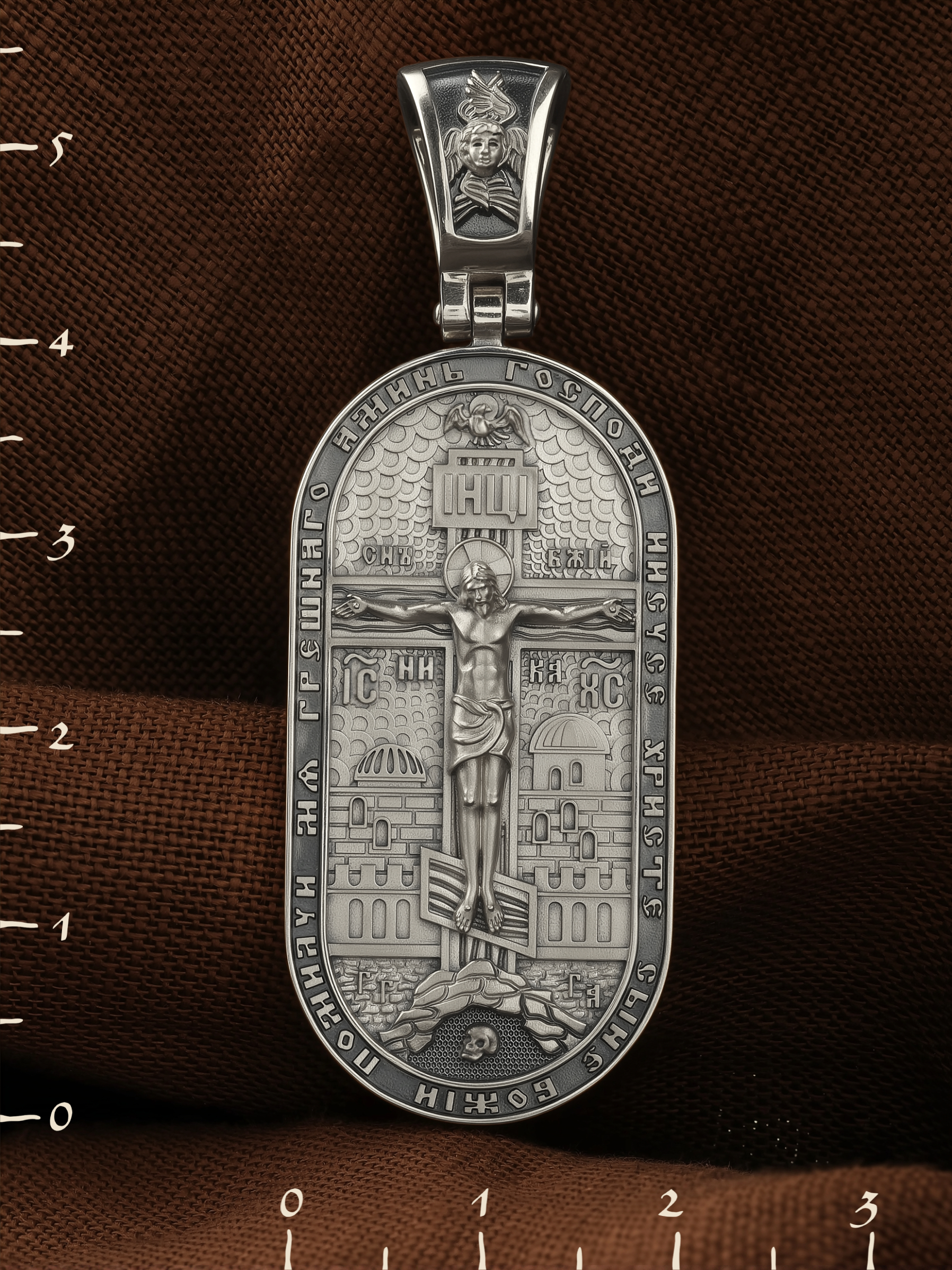 По контуру образка написана молитва: «Господи Иисусе Христе, Сыне Божий, помилуй мя грешного. Аминь». На кулонном кольце изображен шестикрылый Серафим — самый приближенный к Господу Ангел