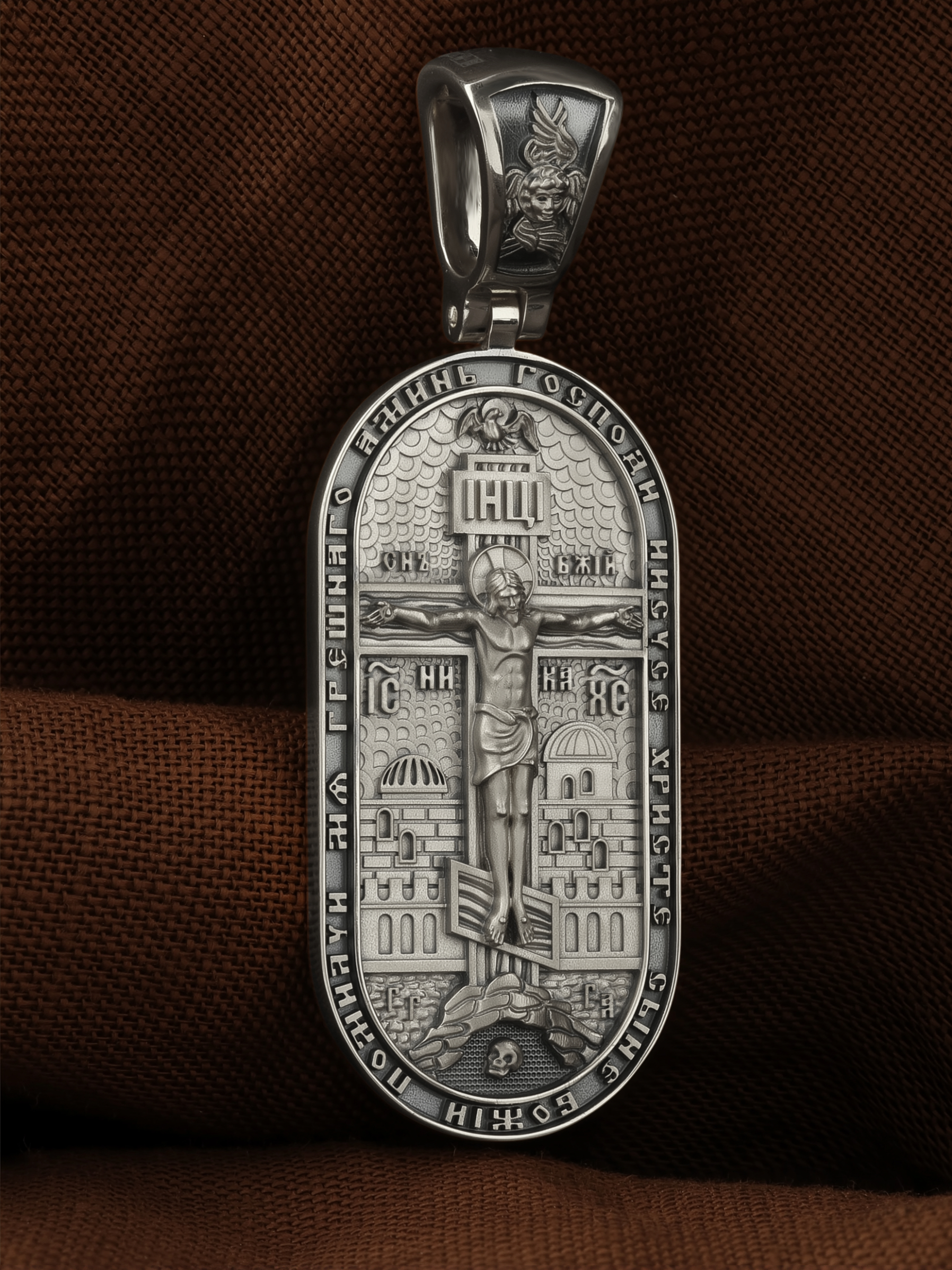 Центральную часть лицевой стороны занимает Распятие, потому что это орудие казни Иисус Христос сделал орудием победы над грехом и смертью. Своими страданиями Он искупил грехи человечества, умерев и сошествовав во ад, победил сатану, освободил души праведников от вечной смерти и открыл им небесные врата рая. Жертва Христа сделала возможным спасение для каждого человека. На православном кресте Христос не умирает, а свободно простирает руки, ладони Иисуса открыты, будто он хочет обнять все человечество, даря им свою любовь и открывая путь к вечной жизни.