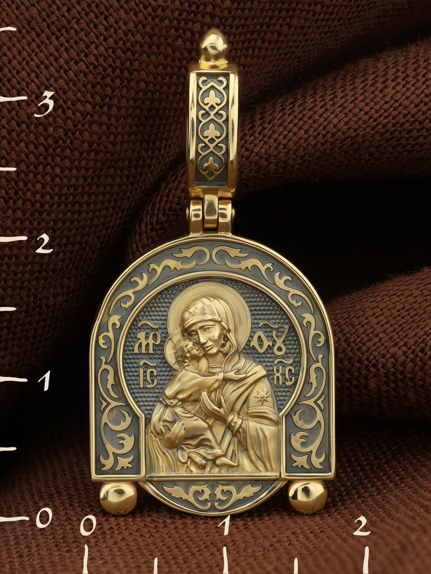 Лицевую сторону возглавляет Владимирская икона Божией Матери — самая Великая русская Святыня, многие века бывшая олицетворением нашей земли. Перед ней венчались на царство государи, избирались патриархи. Пречистой Богородице Владимирской клялись в верности Отечеству солдаты и за нее умирали на поле брани. Именно на ее защиту более всего уповала Россия в самые страшные периоды своей истории. Владимирская икона Божией Матери, по преданию, была написана на доске трапезного стола из дома Иисуса Христа. На Русь она была привезена в начале XII века и с тех пор почитается как главная святыня нашего Отечества. Перед ней молитвенно просят Богородицу об исцелении от телесных недугов, в частности, заболеваний сердца и сердечнососудистой системы. За помощью к ней обращаются во время бедствий, когда нуждаются в защите от врагов.