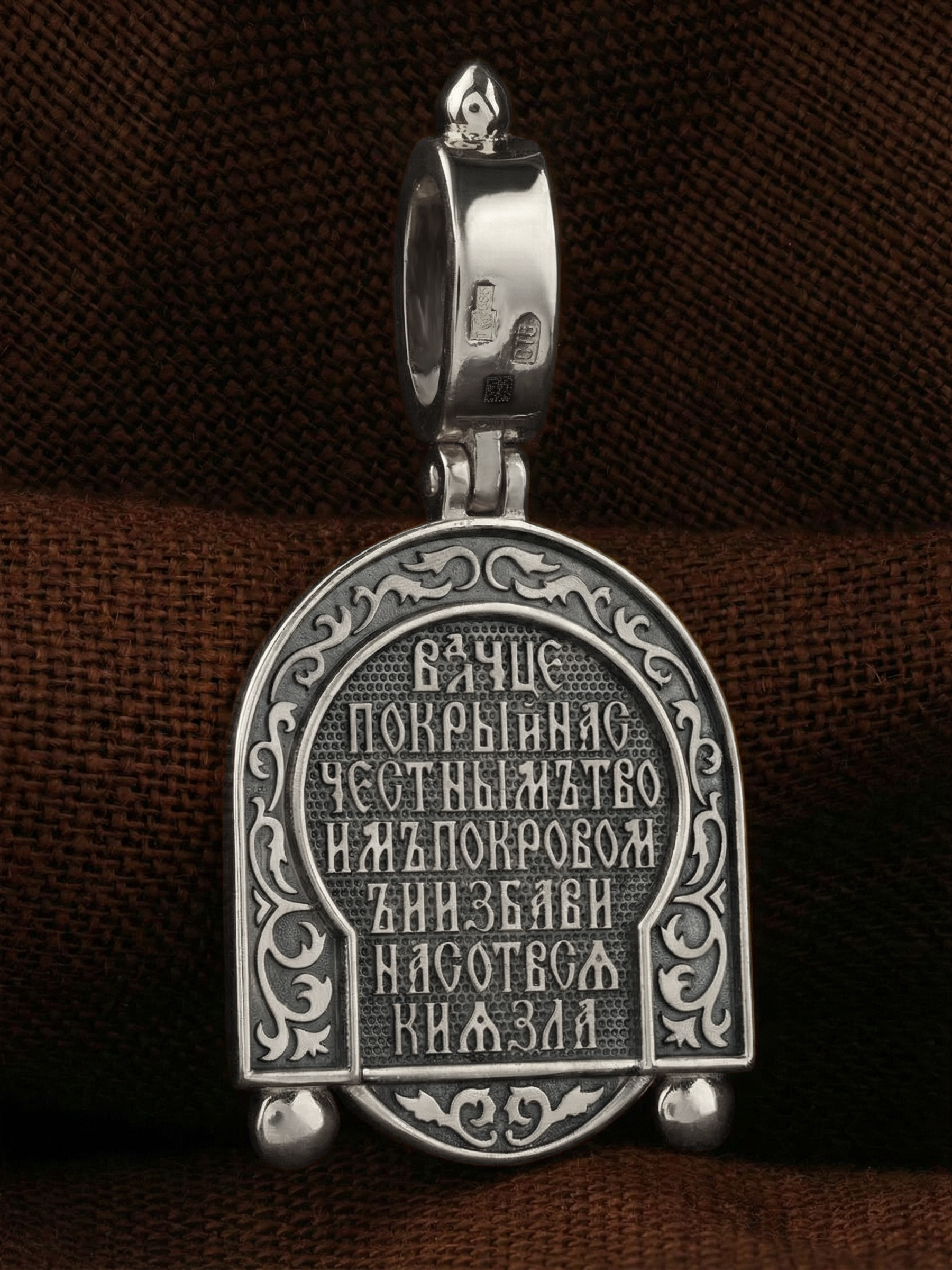 На лицевой части образка изображена икона Покров Пресвятой Богородицы. Праздник Покрова Божией Матери является воспоминанием чуда, которое произошло во Влахнернской церкви 1 (14) октября 910 года: Пресвятая Богородица явилась верующим над алтарем храма и распростерла над ними Свое покрывало. В этот день Божья Матерь открыла людям, что Она является Ходатаицей за них перед Богом. Богородица простирает Свой молитвенный покров над всеми православными христианами и умоляет Сына Своего о даровании вечного спасения каждому человеку.