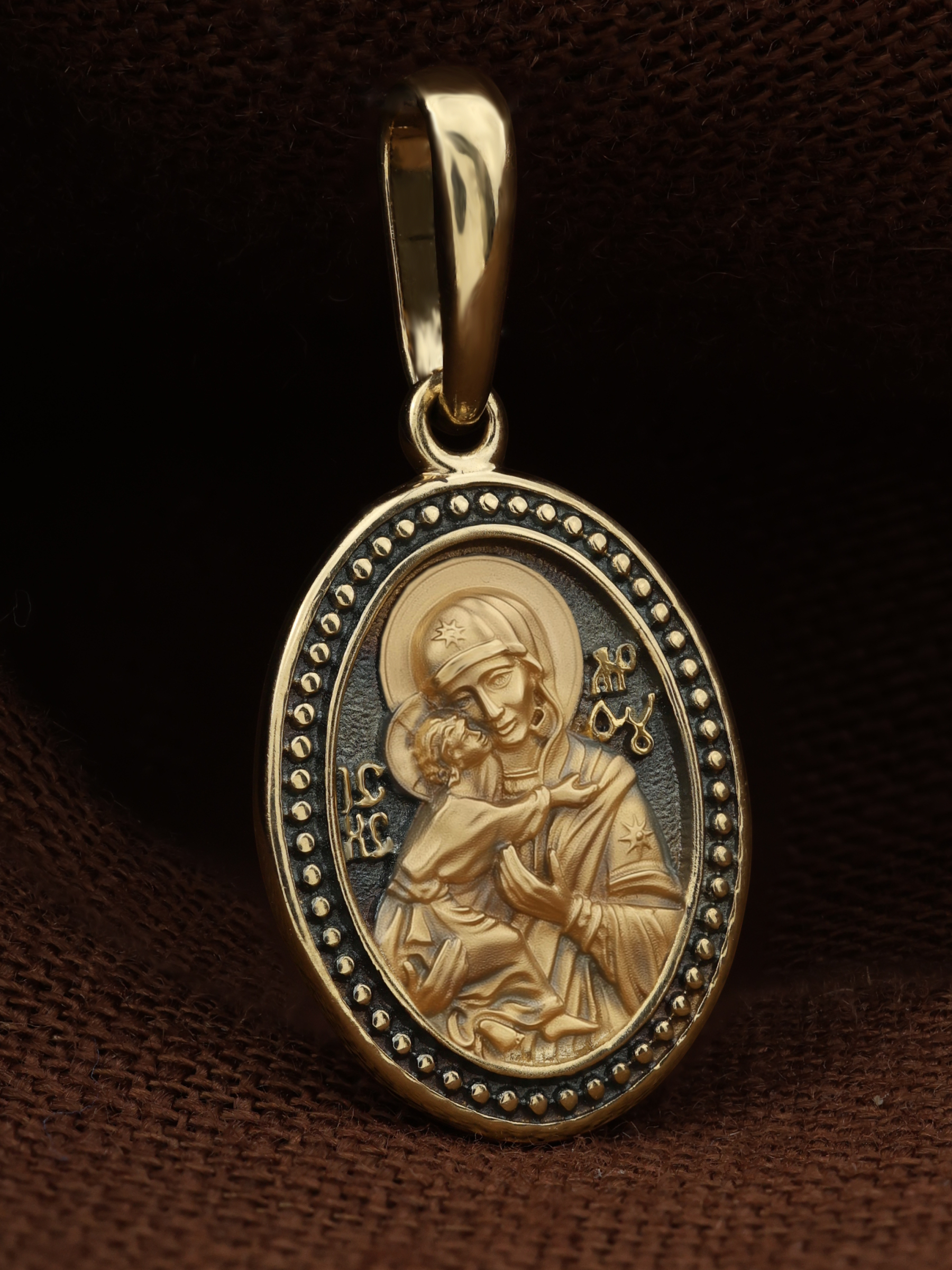 Лицевую сторону возглавляет Владимирская икона Божией Матери. По преданию, она была написана на доске трапезного стола из дома Иисуса Христа. На Русь икона была привезена в начале XII века и с тех пор почитается как главная святыня нашего Отечества. Перед ней молитвенно просят Богородицу об исцелении от телесных недугов, в частности, заболеваний сердца и сердечно-сосудистой системы. За помощью к Владимирской иконе Божией Матери обращаются во время бедствий, когда нуждаются в защите от врагов.