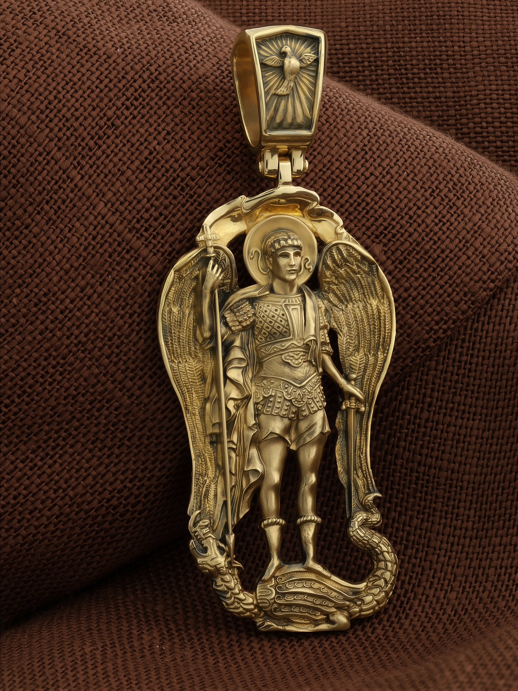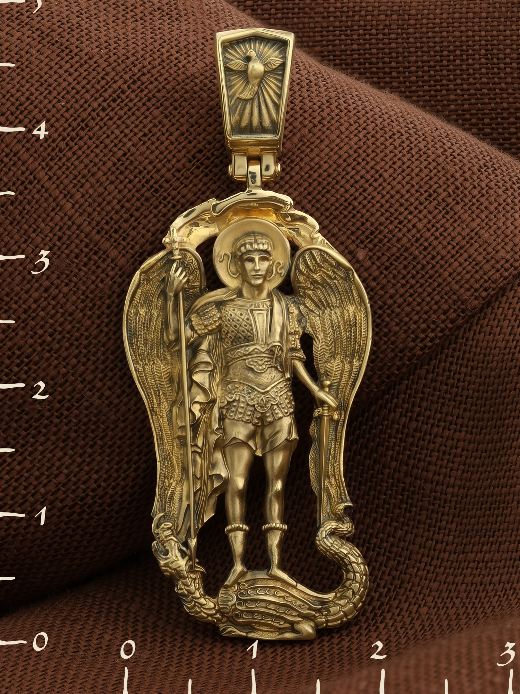 Архангел Михаил первым ополчился на архангела Денницу, когда тот восстал против Бога и низверг его с Неба. В книге «Апокалипсис» апостол Иоанн Богослов рассказывает, что Архангел Михаил — предвечный вождь в войне против дракона-диавола и восставших вместе с ним на Бога ангелов тьмы. «И произошла война на Небе: Михаил и ангелы его воевали против дракона, и дракон, и ангелы его воевали против них, но не устояли, и не нашлось им места на Небе. И низвержен был великий дракон, древний змий, называемый диаволом и сатаною». На иконах дьявол часто изображается в виде змея или дракона. Михаил побивает его и связывает, сокрушая на дно ада. Архангел Михаил на таких иконах изображается в виде воина, в доспехах и с огненным мечом. За спиной у него большие крылья, у висков вьются тороки (или слухи) — ленточки, символизирующие чуткий слух и внимание к Богу. Над головой развевается стяг, потому что Архангел Михаил — «знаменосец Христа».