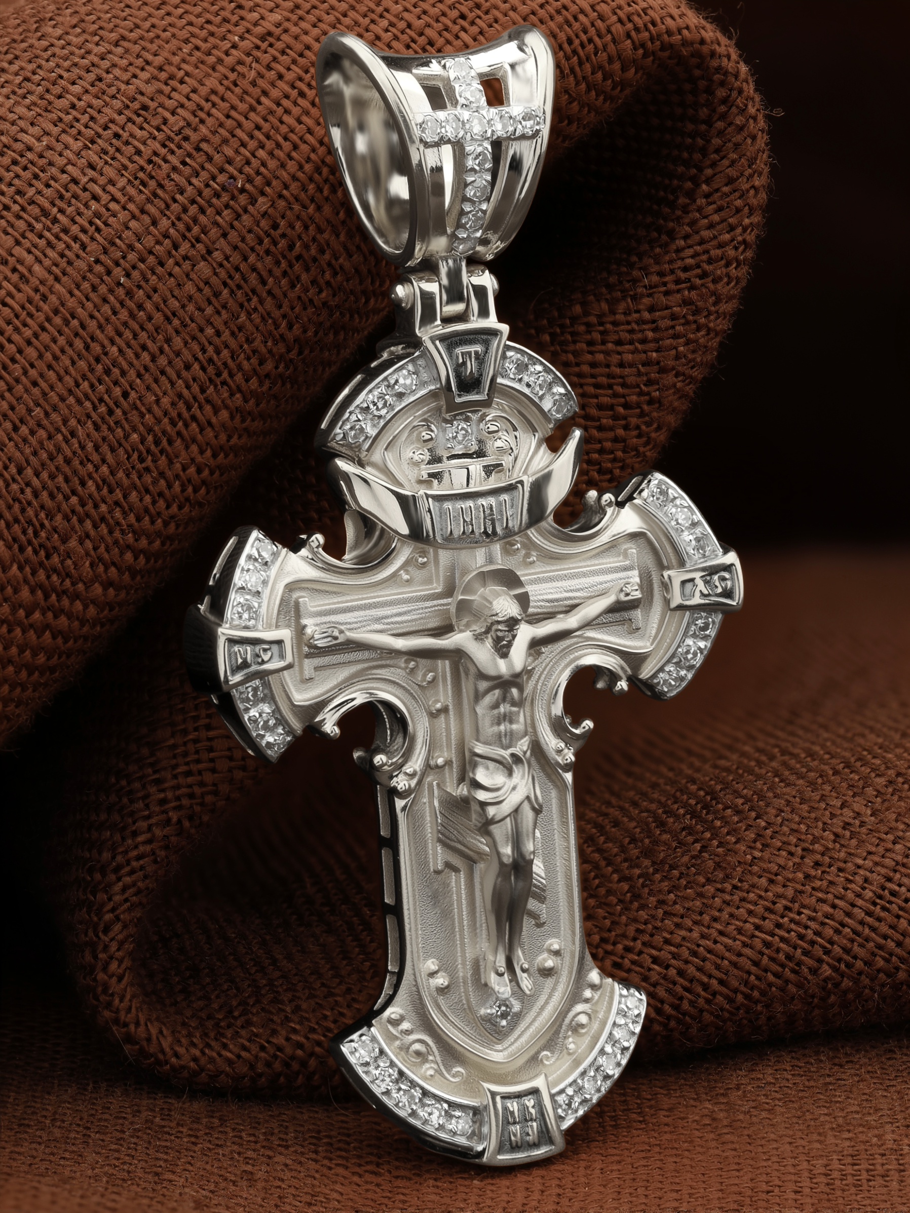На лицевой стороне креста изображено Распятие Иисуса Христа на Голгофском Кресте, верхняя перекладина которого символизирует титло — табличку, на которой, согласно Евангелию, было начертано: Иисус Назорей Царь Иудейский (IНЦI). Справа и слева от Распятия изображены символы «IС ХС» — святое имя Христа. Внизу креста написано слово «НИКА», что значит «победитель». В верхней части креста обозначена буква «Т», которая символизирует одно из орудий страданий Господа — трость.