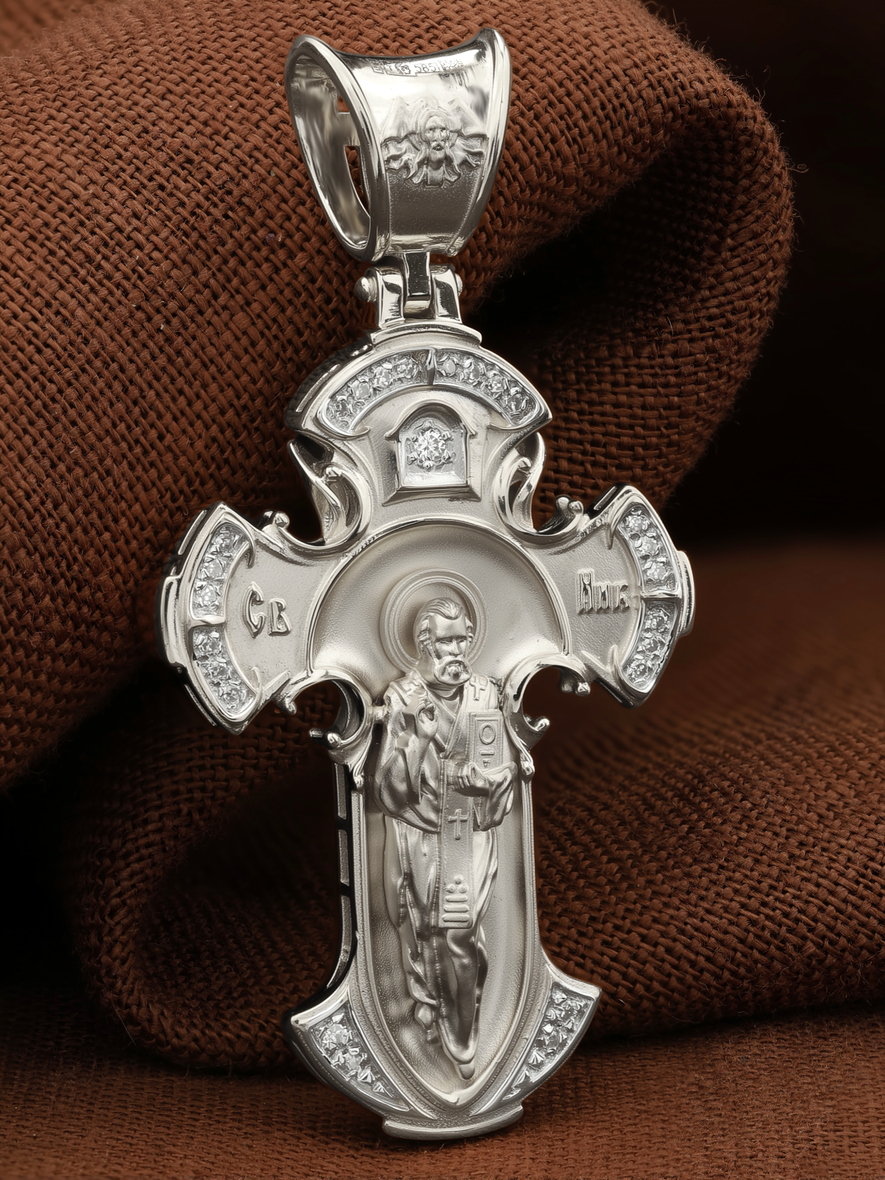 Оборотную сторону креста возглавляет икона святителя Николая Чудотворца. На кулонном кольце помещено изображение Спаса Нерукотворного — образ Спасителя, который Он запечатлел на плате и передал для исцеления больному проказой царю Эдессы. ему придается победное и защитное значение.