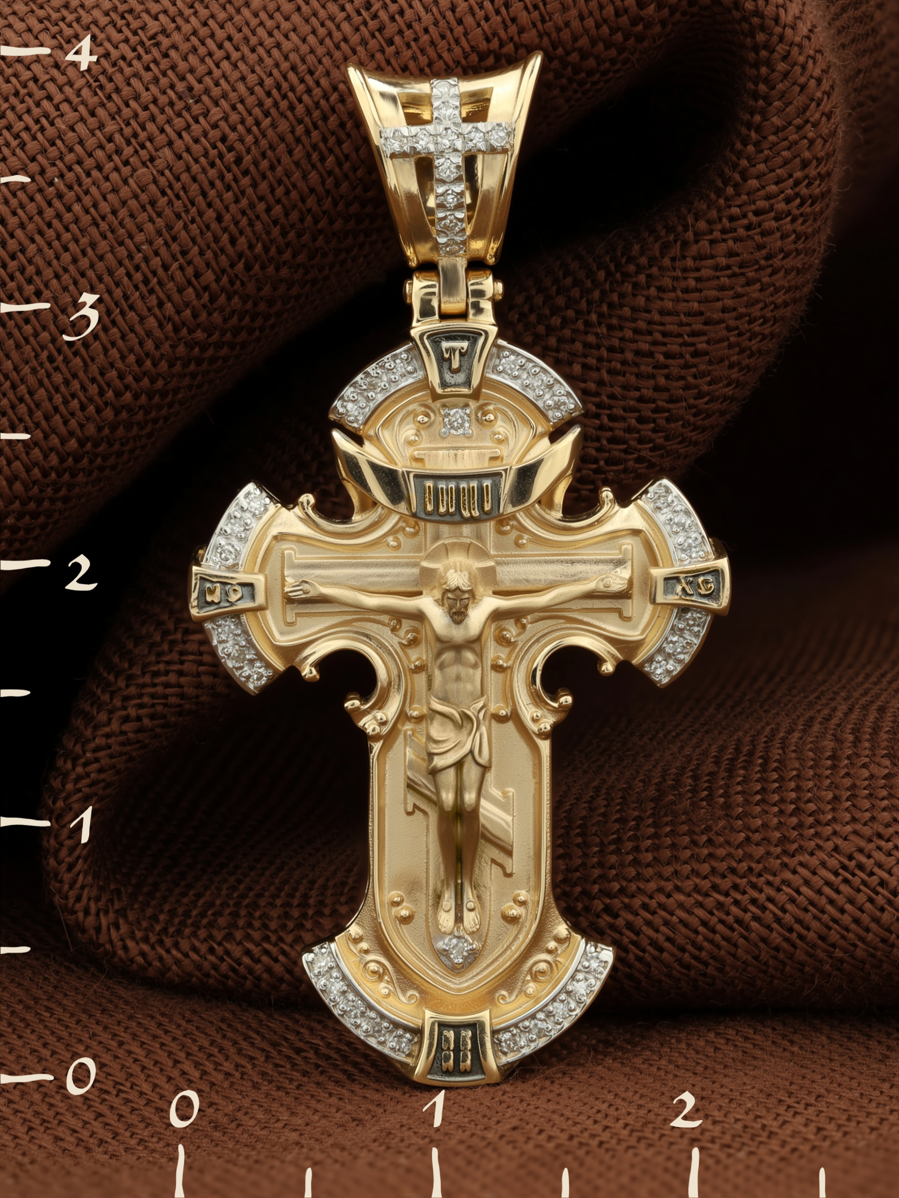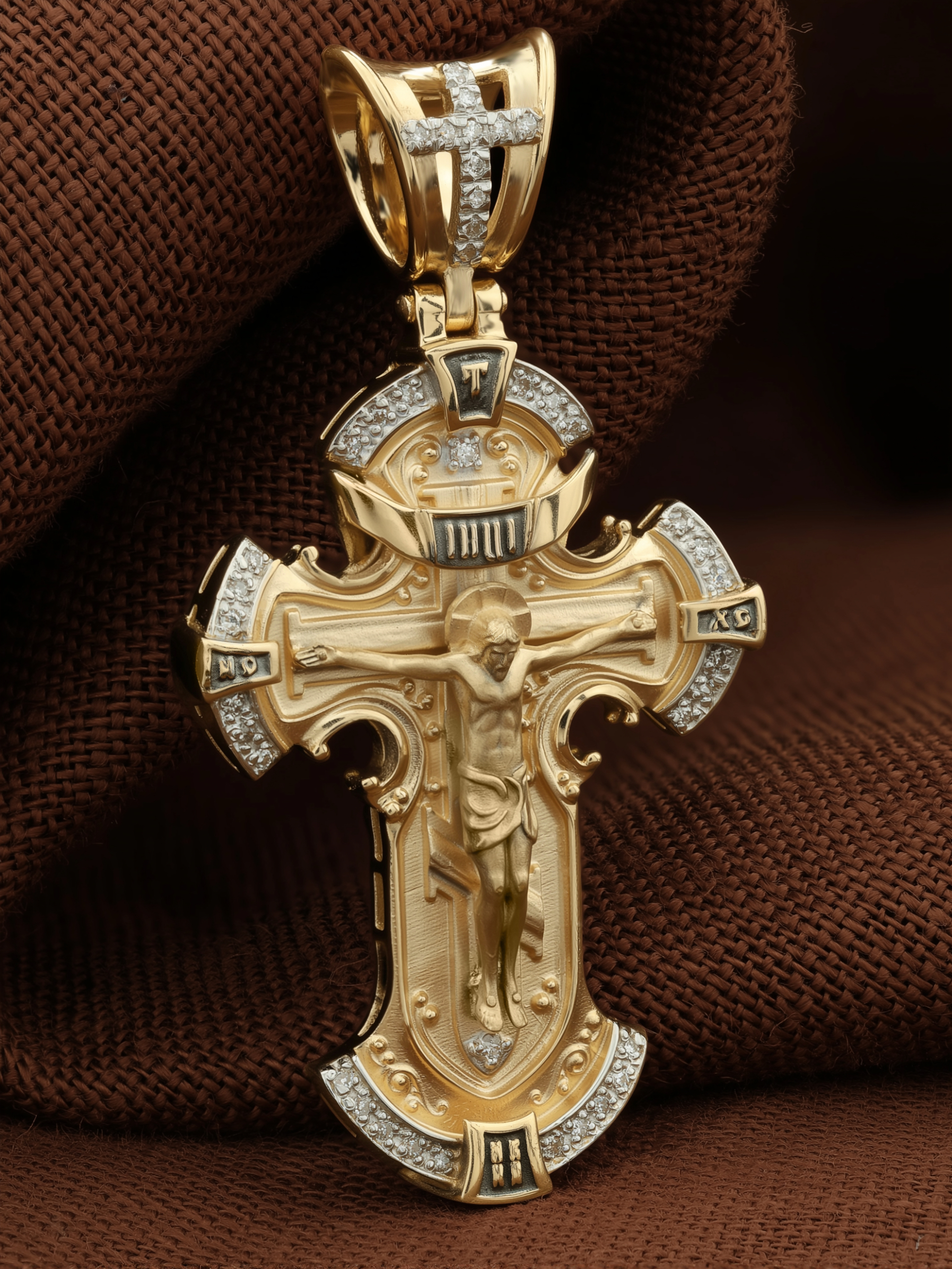 На лицевой стороне креста изображено Распятие Иисуса Христа на Голгофском Кресте, верхняя перекладина которого символизирует титло — табличку, на которой, согласно Евангелию, было начертано: Иисус Назорей Царь Иудейский (IНЦI). Справа и слева от Распятия изображены символы «IС ХС» — святое имя Христа. Внизу креста написано слово «НИКА», что значит «победитель». В верхней части креста обозначена буква «Т», которая символизирует одно из орудий страданий Господа — трость.