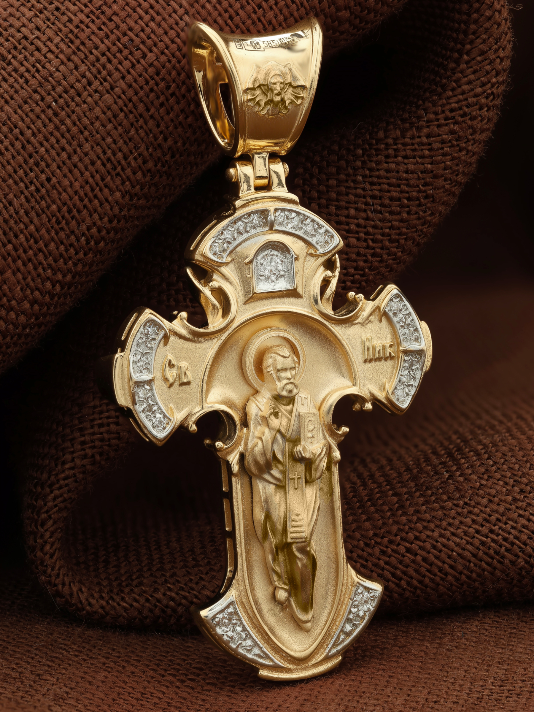 Оборотную сторону креста возглавляет икона святителя Николая Чудотворца. На кулонном кольце помещено изображение Спаса Нерукотворного — образ Спасителя, который Он запечатлел на плате и передал для исцеления больному проказой царю Эдессы. ему придается победное и защитное значение.