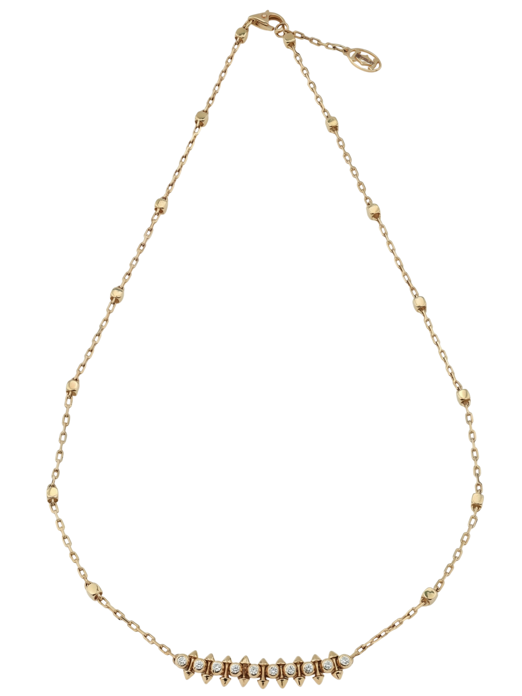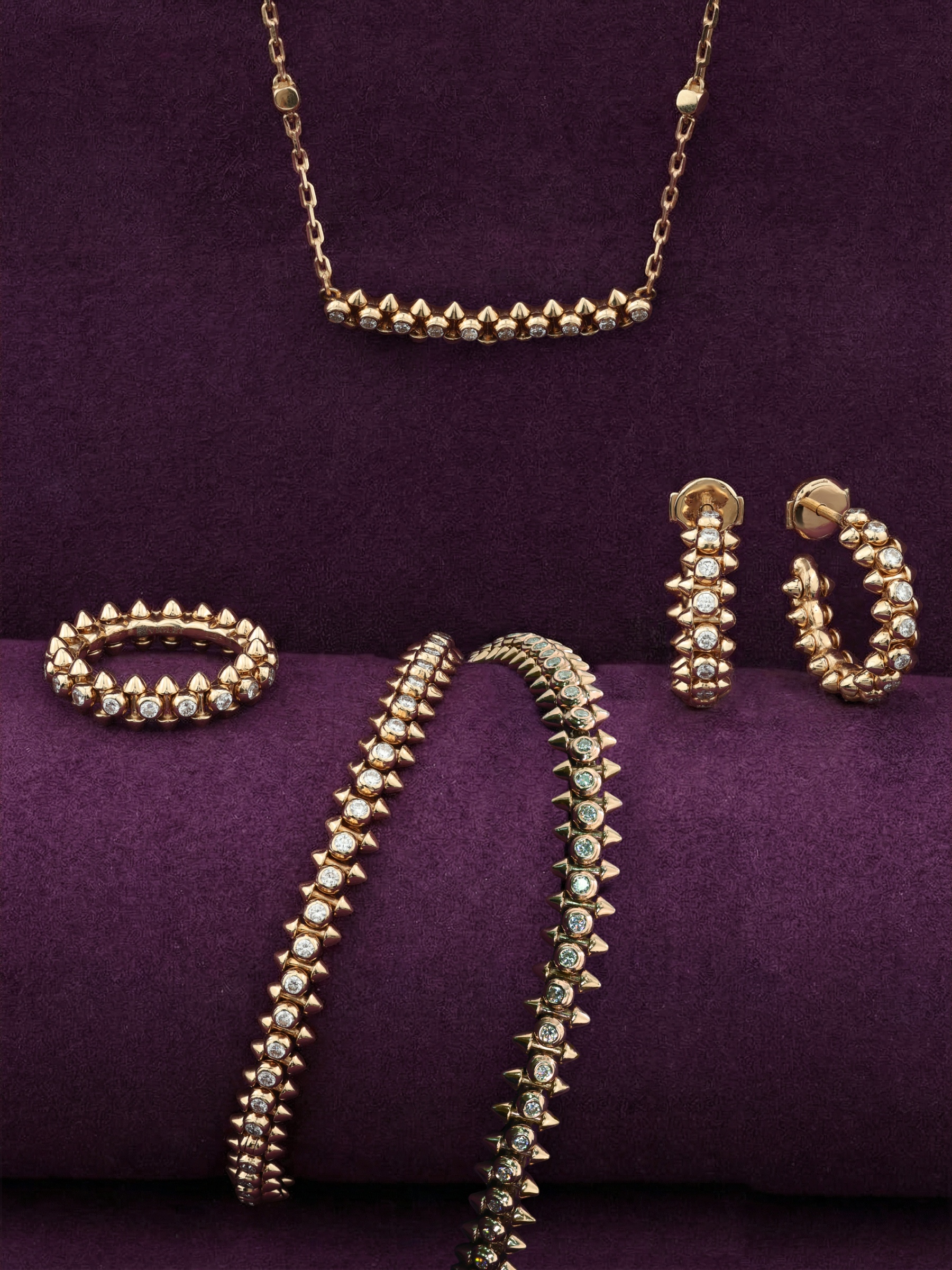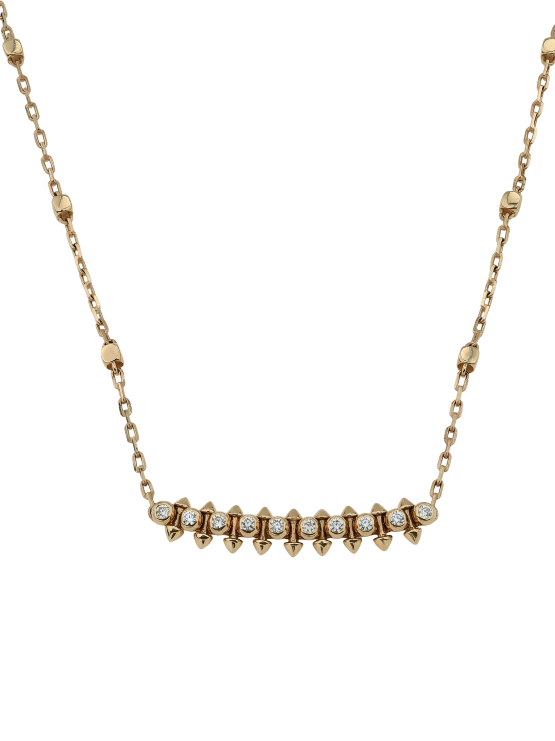 Центральная часть украшения украшена 20 бриллиантами круглой формы. Белый цвет вставок эффектно контрастирует с теплым оттенком красного золота, создавая игру света при каждом движении. Продуманное сочетание дерзкой формы шипов и сияния бриллиантов делает это колье универсальным украшением, которое одинаково выигрышно смотрится как на женщинах, так и на мужчинах.