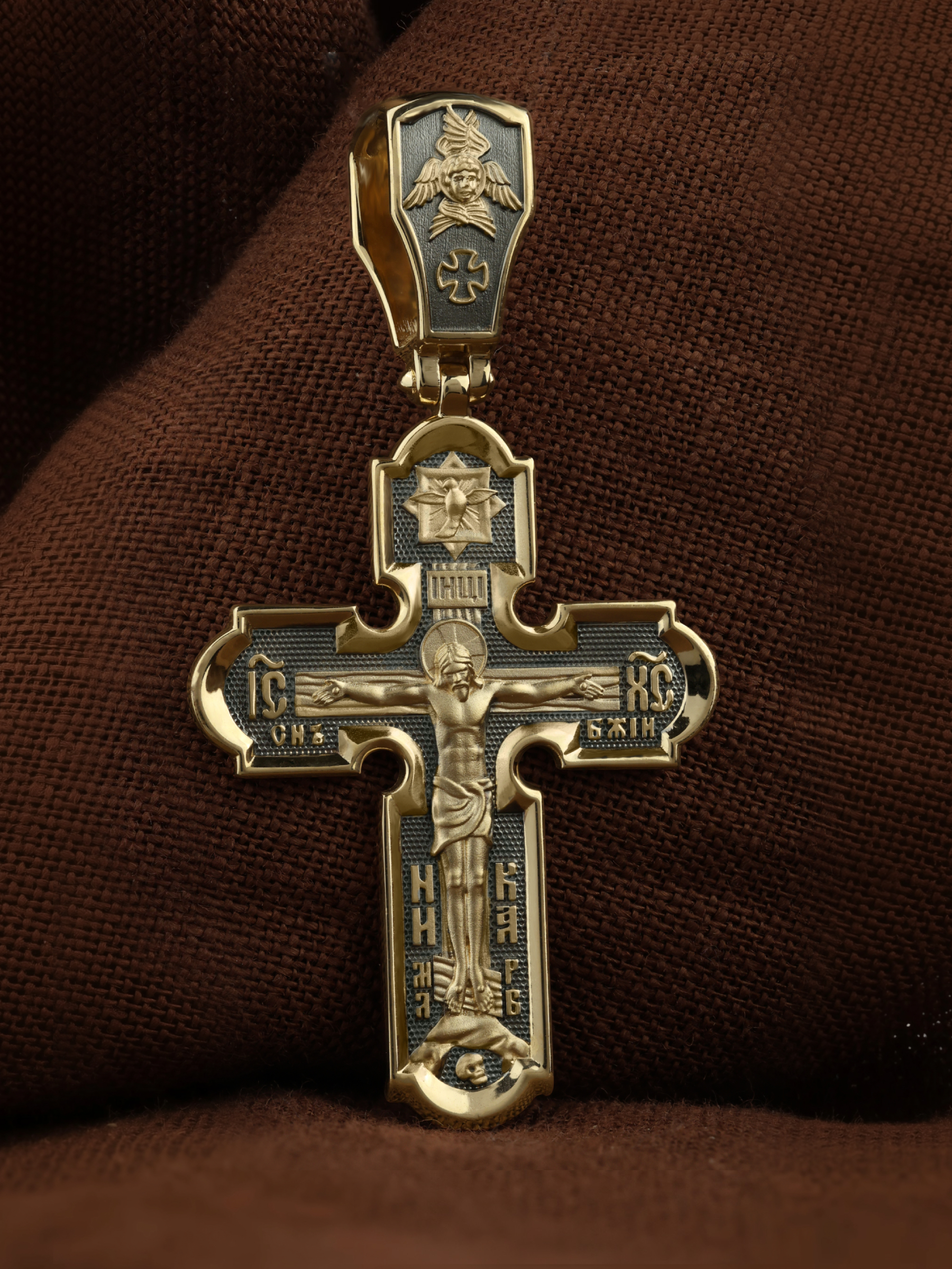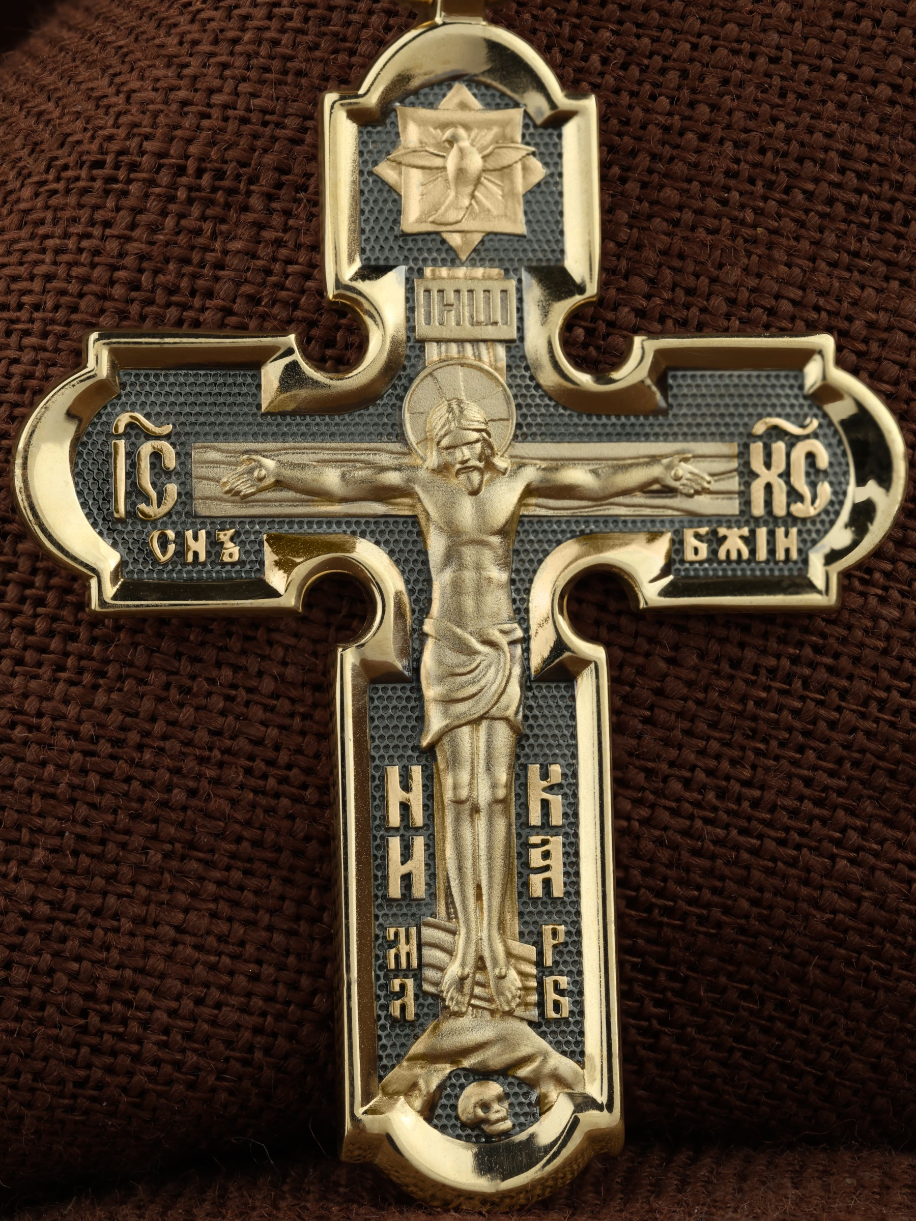 На лицевой стороне креста изображено Распятие Иисуса Христа. Господь представлен свободно покоящимся на кресте с простертыми руками и как бы обнимающим всю Вселенную. Он — Спаситель, искупивший грехи мира, «поправший смертию смерть» и призывающий к Себе «все концы земли». Поэтому рядом с Его образом помещены слова «НИКА» и «Царь Славы». Эти слова характеризуют Господа как Великого Архиерея, победителя смерти. Верхняя перекладина символизирует титло — табличку, на которой, согласно Евангелию, было начертано: Иисус Назорей Царь Иудейский (IНЦI). Также Распятие сопровождается надписями, олицетворяющими Христа. Это святое имя Христа «IC» (Иисус) «ХС» (Христос) и словосочетание «СЫН БОЖИЙ». Крест стоит на горе камней, символизирующих Голгофу, в основании которой различается череп. Это голова Адама. На кулонном кольце помещено изображение серафима.