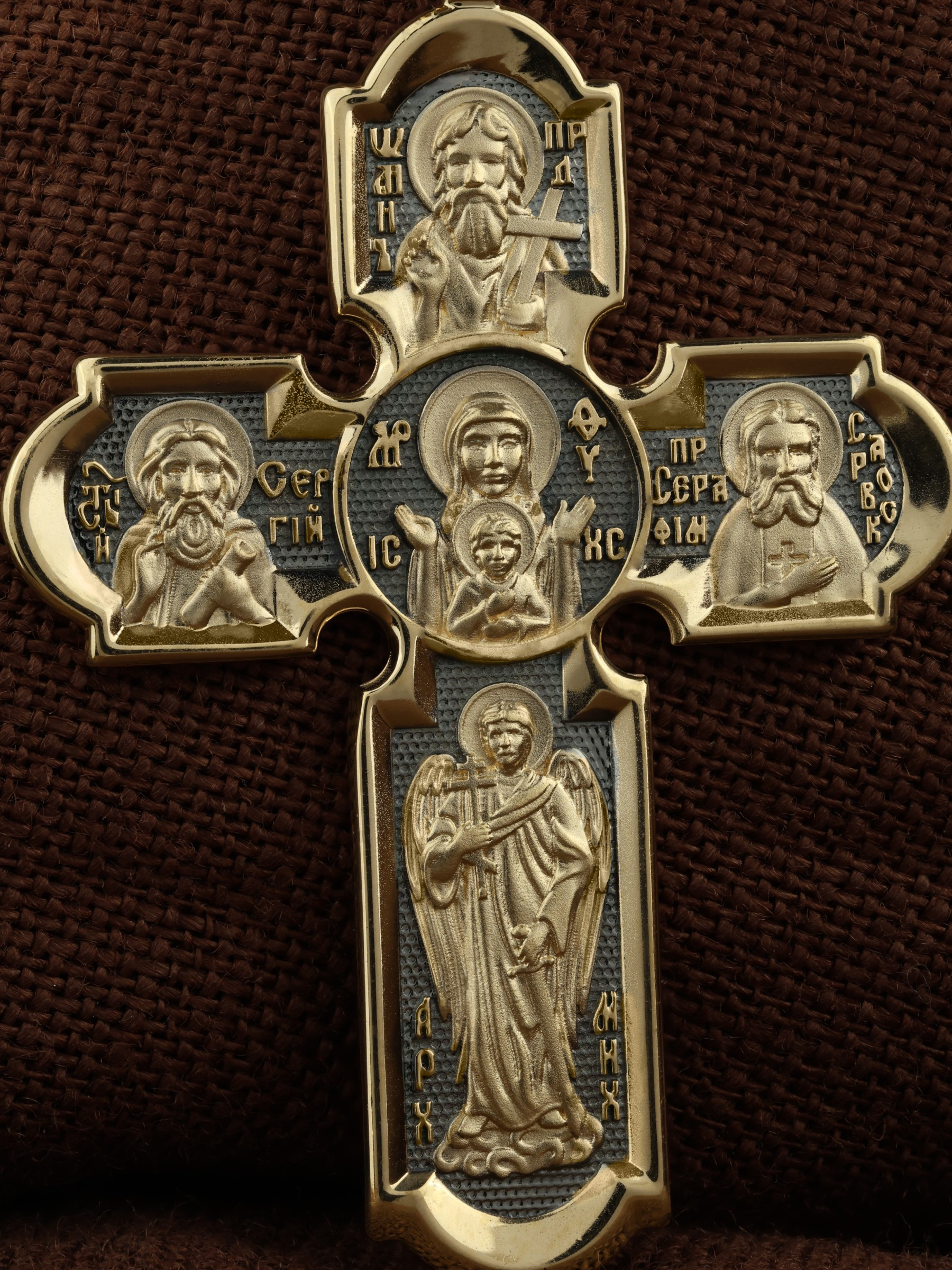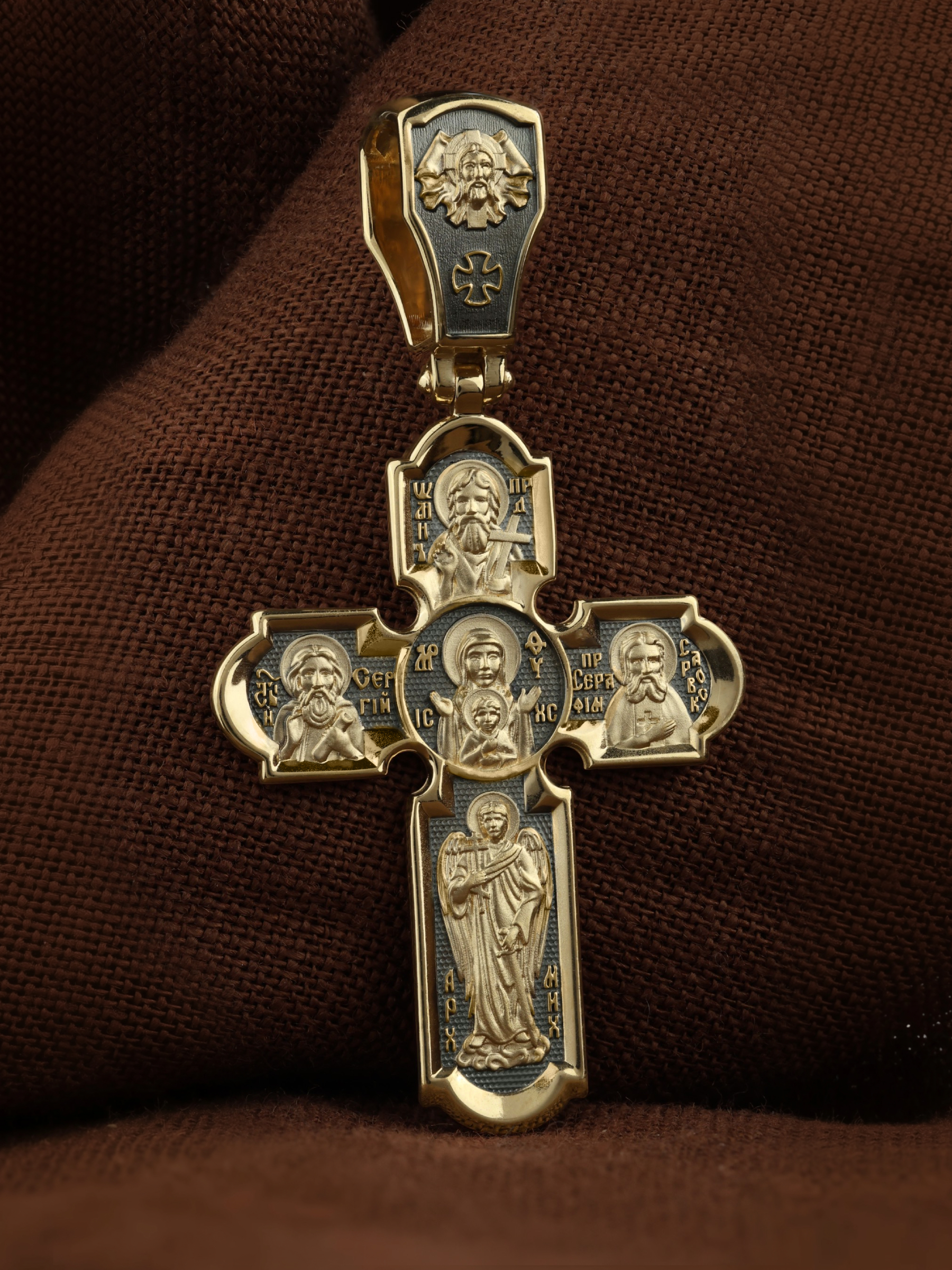 На кресте внизу изображен Ангел Хранитель, слева — Святая Блаженная Ксения, справа — Святая Блаженная Матрона, вверху — пророк, почитающийся в христианстве, Предтеча Господень Иоанн Креститель. На кулонном кольце помещено изображение Спаса Нерукотворного — образ Спасителя, который Он запечатлел на плате и передал для исцеления больному проказой царю Эдессы. Ему придается победное и защитное значение.