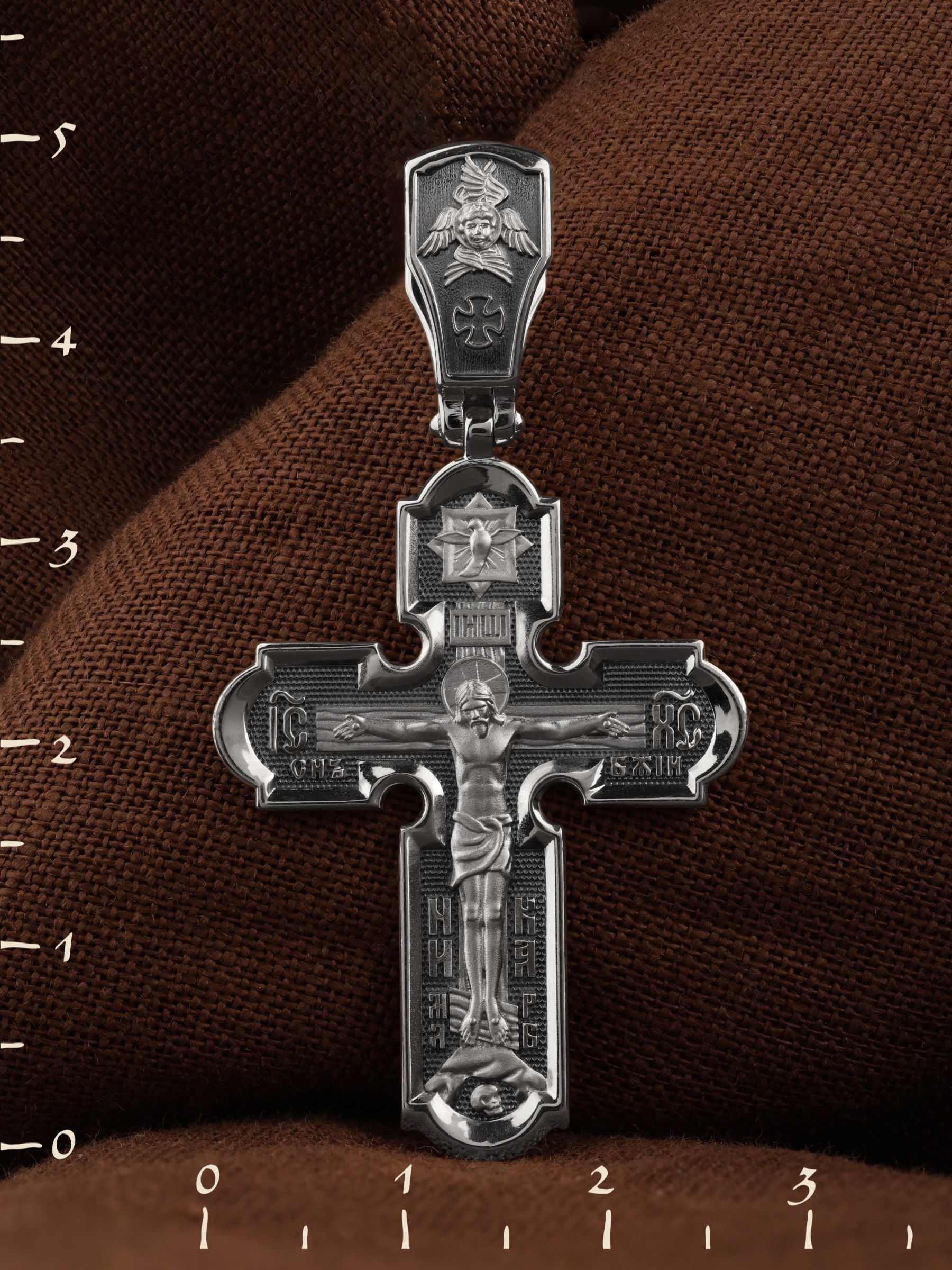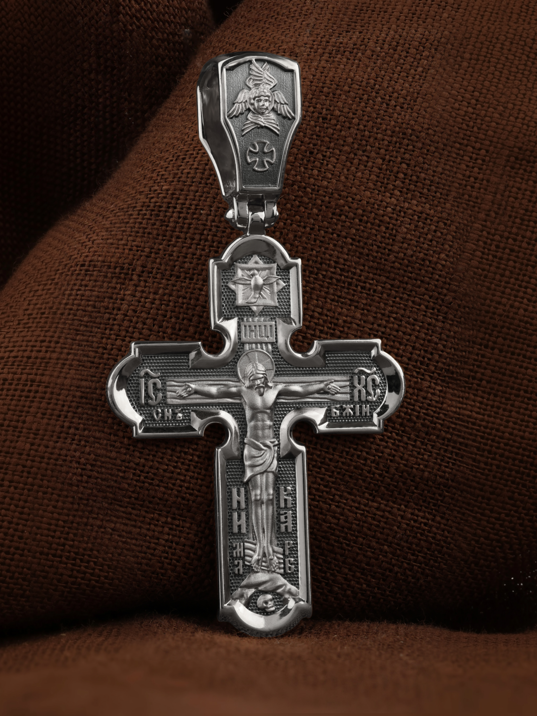 На лицевой стороне креста изображено Распятие Господа и Спасителя нашего Иисуса Христа. Христос, подвергнутый на кресте мучительной казни, своими страданиями искупил нас от древнего греха и даровал нам жизнь вечную. На верхней табличке, выше головы Иисуса, расположена надпись, составленная Понтием Пилатом — «IНЦI». Она означает «Иисус Назорей, Царь Иудейский». Надпись «IС» « ХС» означает Иисус Христос и словосочетание «СЫН БОЖИЙ», что означает божественную природу Иисуса Христа. В нижней части креста находятся надписи «НИКА» и «МЛРБ». В переводе с греческого, слово «НИКА» означает «победитель». Надпись «МЛРБ» — «место лобное рай бысть» — означает, что место лобное стало раем. Крест стоит на горе камней, символизирующих Голгофу. Под подножием Креста изображена покоящаяся голова (череп) Адама.