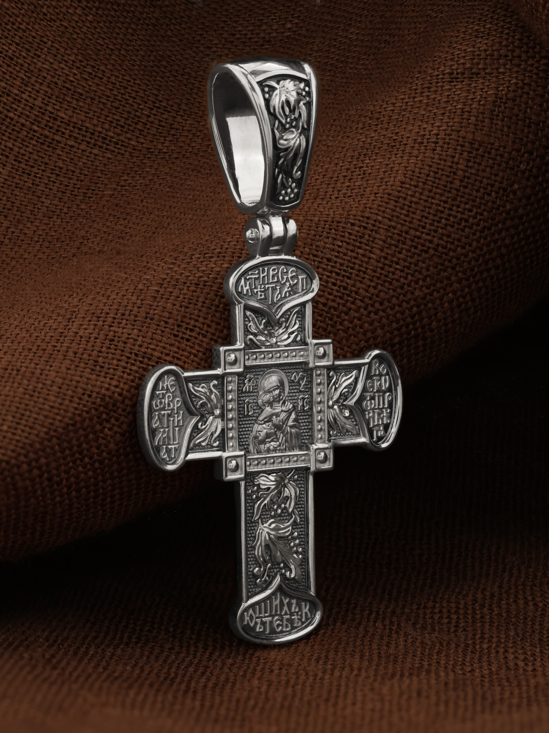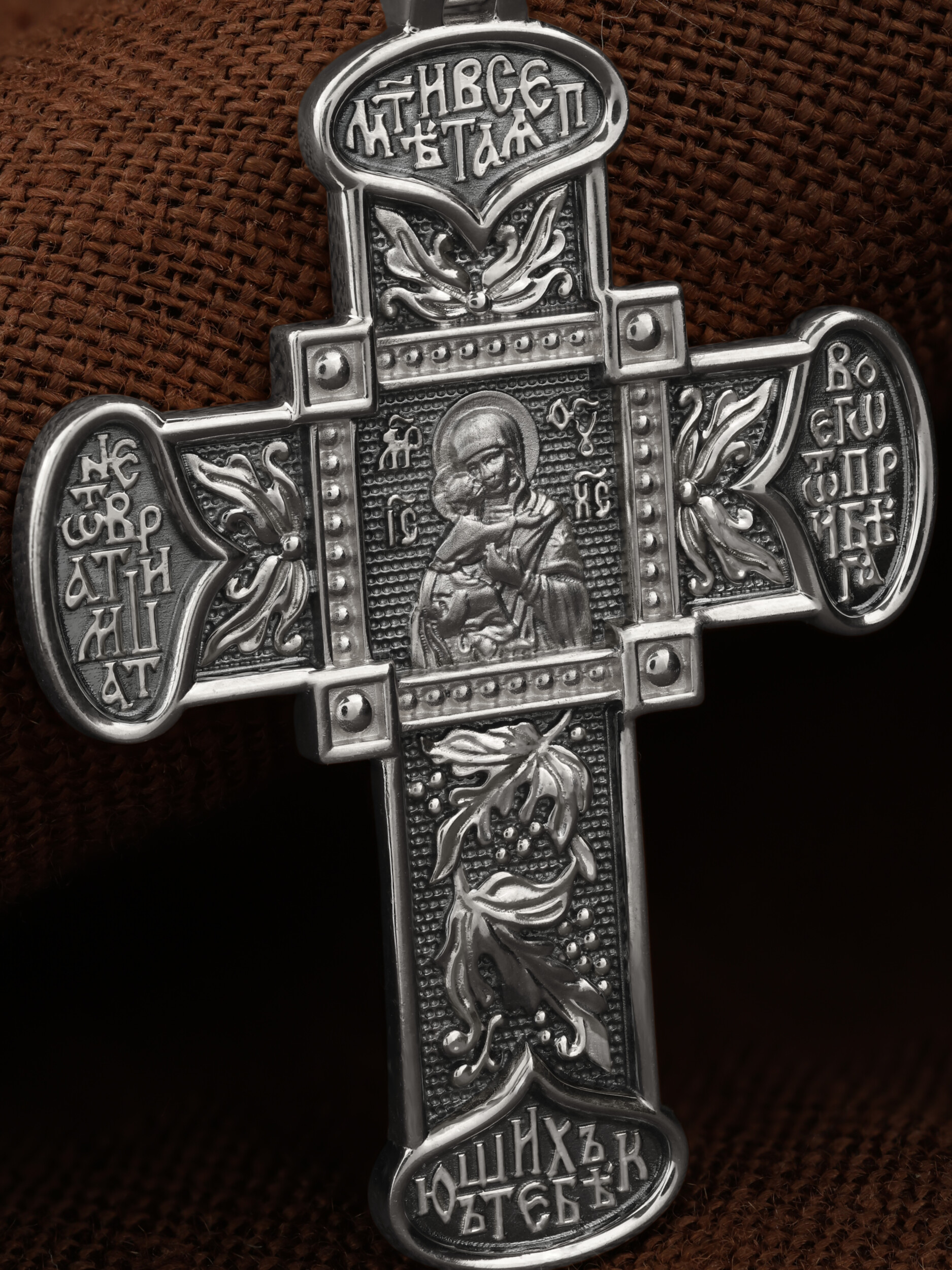 В центре оборотной стороне креста помещен образ Владимирской иконы Божией Матери — один из самых чтимых святынь Русской православной церкви. По преданию, икона была написана Святым апостолом и евангелистом Лукой во время земной жизни Богородицы. Дева Мария, увидев Свое изображение, молвила: «Отныне ублажат Мя вси роди. Благодать Рождшегося от Меня и Моя с сим образом да будет». Образ написан в лирическом иконографическом типе «Умиление». Младенец припал щекой к щеке Матери и тянется к ней правой рукой, другой нежно обнимая за шею. Икона Владимирской Божией Матери вплоть до V века находилась в Иерусалиме, затем была перевезена в Византию. На Русь икона была привезена в 1131 г. За прошедшие столетия святыня неоднократно переезжала из Владимира в Москву и обратно, не раз спасая страну от захватчиков. Русская Православная Церковь установила троекратное празднование Владимирской иконе Божией Матери. Каждый из дней празднования связан с избавлением русского народа от порабощения иноплеменниками по молитвам ко Пресвятой Богородице. В последующие века у иконы происходили многие важные исторические события: подписание актов, принятие присяги значимых государственных деятелей и возведение на престол. Вокруг образа, по сторонам Креста, написана молитва: «Мати Всепетая, не отврати лица Твоего от прибегающих к Тебе». Оборотная сторона креста украшена растительным орнаментом.