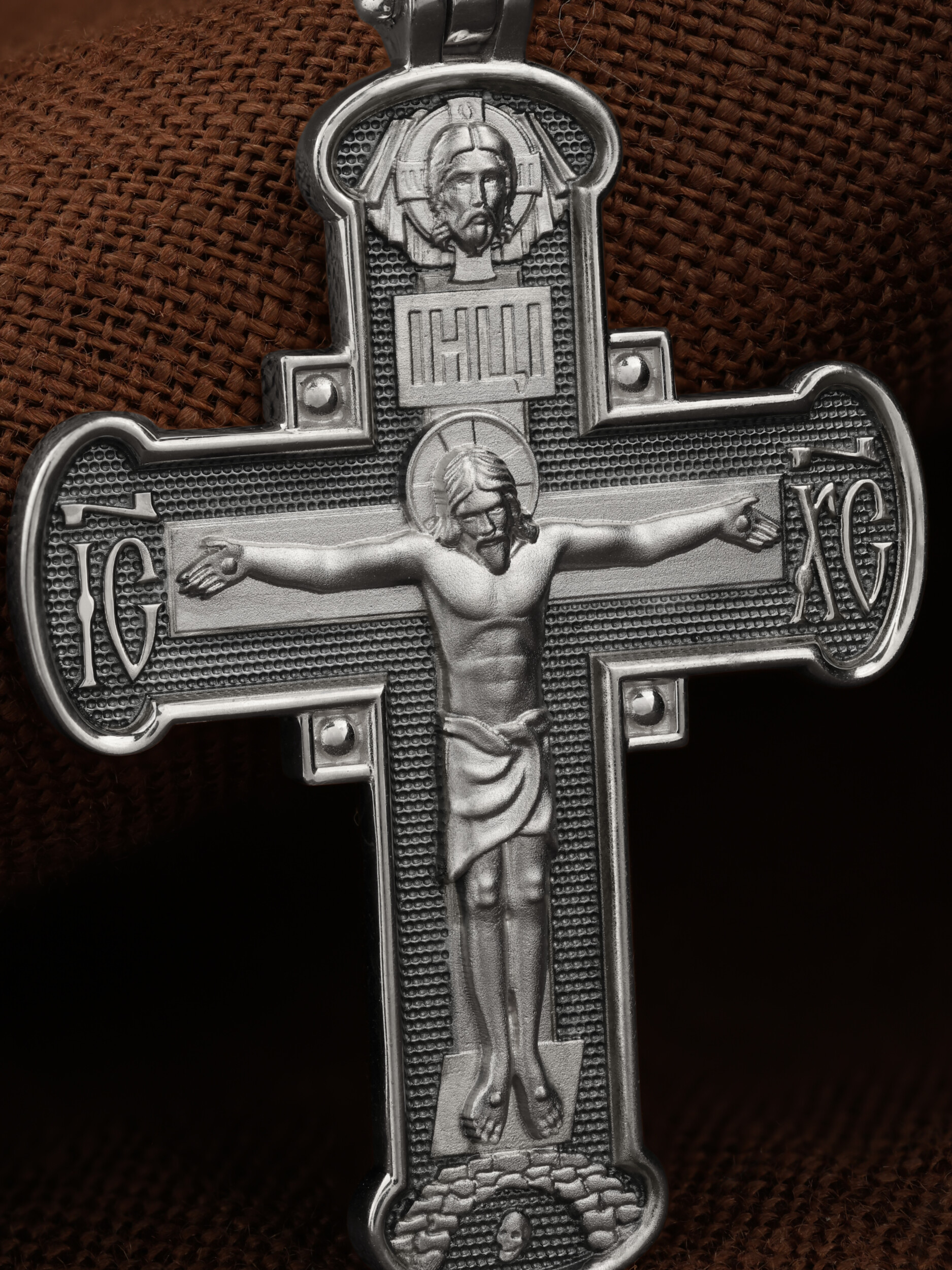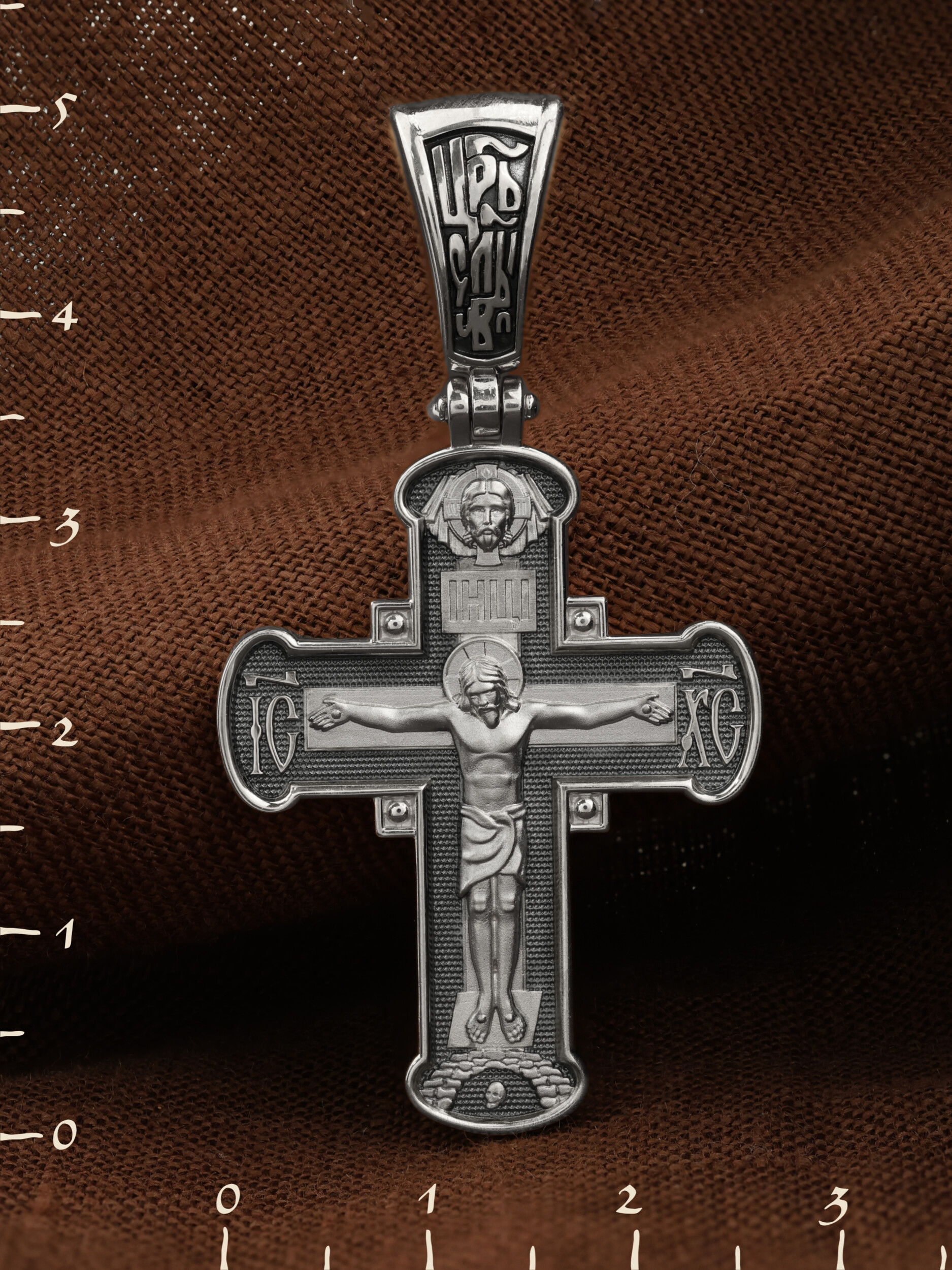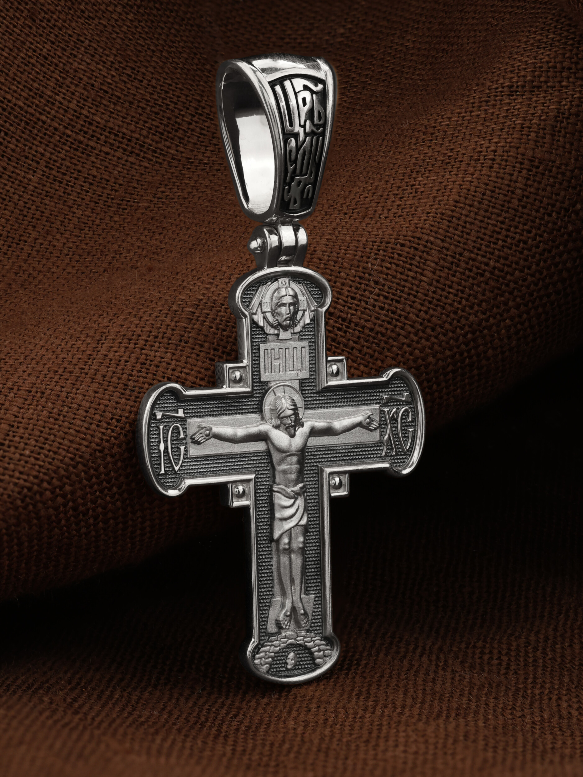 На лицевой стороне креста изображено Распятие Господа и Спасителя нашего Иисуса Христа, отдавшего Себя на смерть, для искупления грехов мира. Крест является символом жертвенной любви Всеблагого Бога к падшим людям, всепобеждающим духовным оружием христиан, основанием и средоточием церковной жизни. Господь сказал: «кто хочет идти за Мною, отвергнись себя, и возьми крест свой, и следуй за Мною». (Мк. 8: 34). На кулонном кольце помещена надпись «Царь Славы». На верхней табличке, выше головы Иисуса, расположена надпись, составленная Понтием Пилатом — «IНЦI». Она означает «Иисус Назорей, Царь Иудейский». Над ней — Нерукотворный образ Господа и Спасителя нашего Иисуса Христа, чудесно отпечатавшийся на плате, котором Христос вытер свой лик. Надпись «IC» «ХC», означает Иисус Христос, помещается на разных сторонах поперечной перекладины креста. Крест стоит на горе камней, символизирующих Голгофу. В ее основании различается череп– это голова Адама.