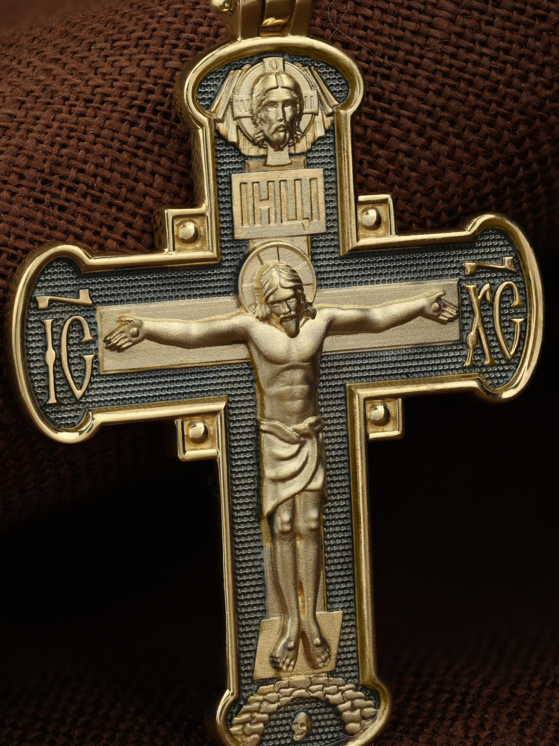 На лицевой стороне креста изображено Распятие Господа и Спасителя нашего Иисуса Христа, отдавшего Себя на смерть, для искупления грехов мира. Крест является символом жертвенной любви Всеблагого Бога к падшим людям, всепобеждающим духовным оружием христиан, основанием и средоточием церковной жизни. Господь сказал: «кто хочет идти за Мною, отвергнись себя, и возьми крест свой, и следуй за Мною». (Мк. 8: 34). На кулонном кольце помещена надпись «Царь Славы». На верхней табличке, выше головы Иисуса, расположена надпись, составленная Понтием Пилатом — «IНЦI». Она означает «Иисус Назорей, Царь Иудейский». Над ней — Нерукотворный образ Господа и Спасителя нашего Иисуса Христа, чудесно отпечатавшийся на плате, котором Христос вытер свой лик. Надпись «IC» «ХC», означает Иисус Христос, помещается на разных сторонах поперечной перекладины креста. Крест стоит на горе камней, символизирующих Голгофу. В ее основании различается череп– это голова Адама.