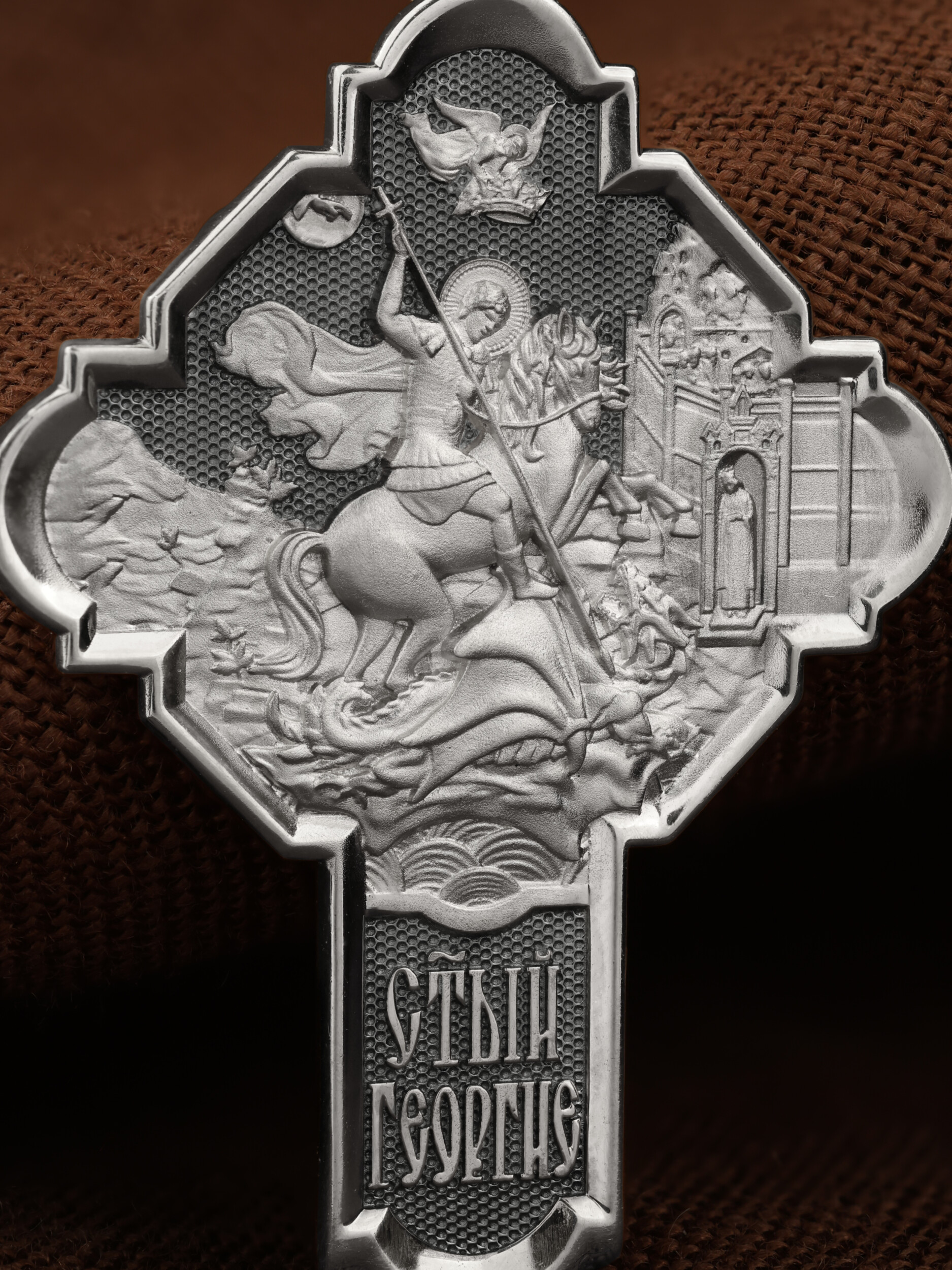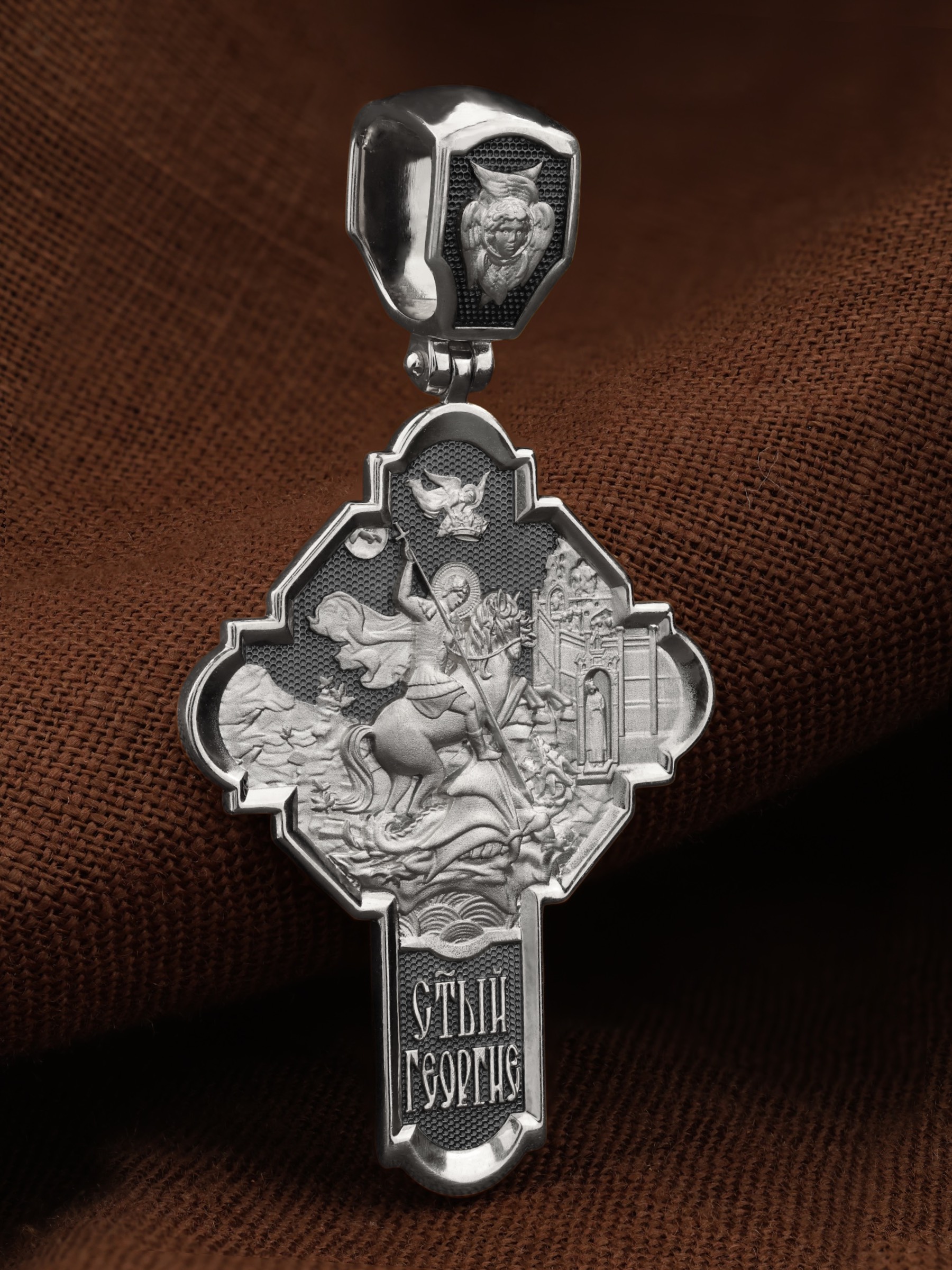 На оборотной стороне креста помещено изображение Святого Великомученика Георгия Победоносца — одного из самых почитаемых и удивительных святых. Георгий родился в Каппадокии (Малая Азия) в семье богатых и знатных горожан. Юношей поступил на службу к римскому императору Диоклетиану, за отличное знание военного дела и проявленную в боях и походах храбрость был приближен к императору и удостоен высокого воинского звания. Во время начавшихся гонений на христиан, перешел на сторону гонимых и, отвергнув человеческий страх, стал ярым проповедником учения Христа. Мучители подвергли опального воеводу жесточайшим восьмидневным пыткам и казнили его (обезглавили) в возрасте около тридцати лет в 303 году. Георгий изображен как воитель, сидящий на вздыбленном коне и поражающий копьем огнедышащего змея. Слева над образом изображена благословляющая Божия десница. Над святым изображен ангел возлагающий на него венец мученика. Змей символизирует собою сатанинские силы. Молитвами вознесенными к Всевышнему и своей непреклонной верой он смог одолеть чудовище. Святой убил змея, спас царскую дочь, принесенную в жертву, и жителей города, их души от влияния дьявола, породив в них надежду и веру в Господа, призывая людей принять христианскую веру. На кулонном кольце изображен шестикрылый Ангел — Серафим.