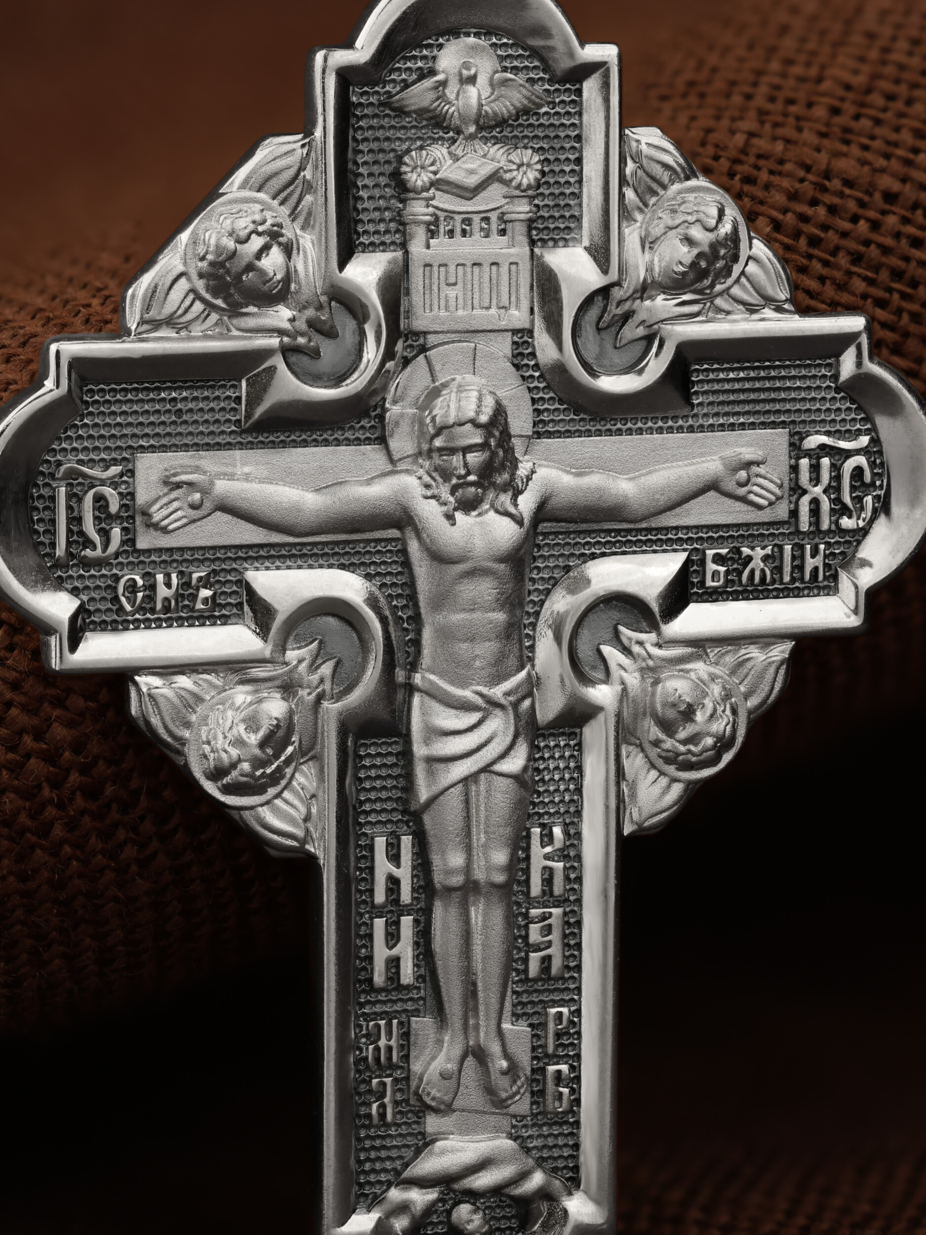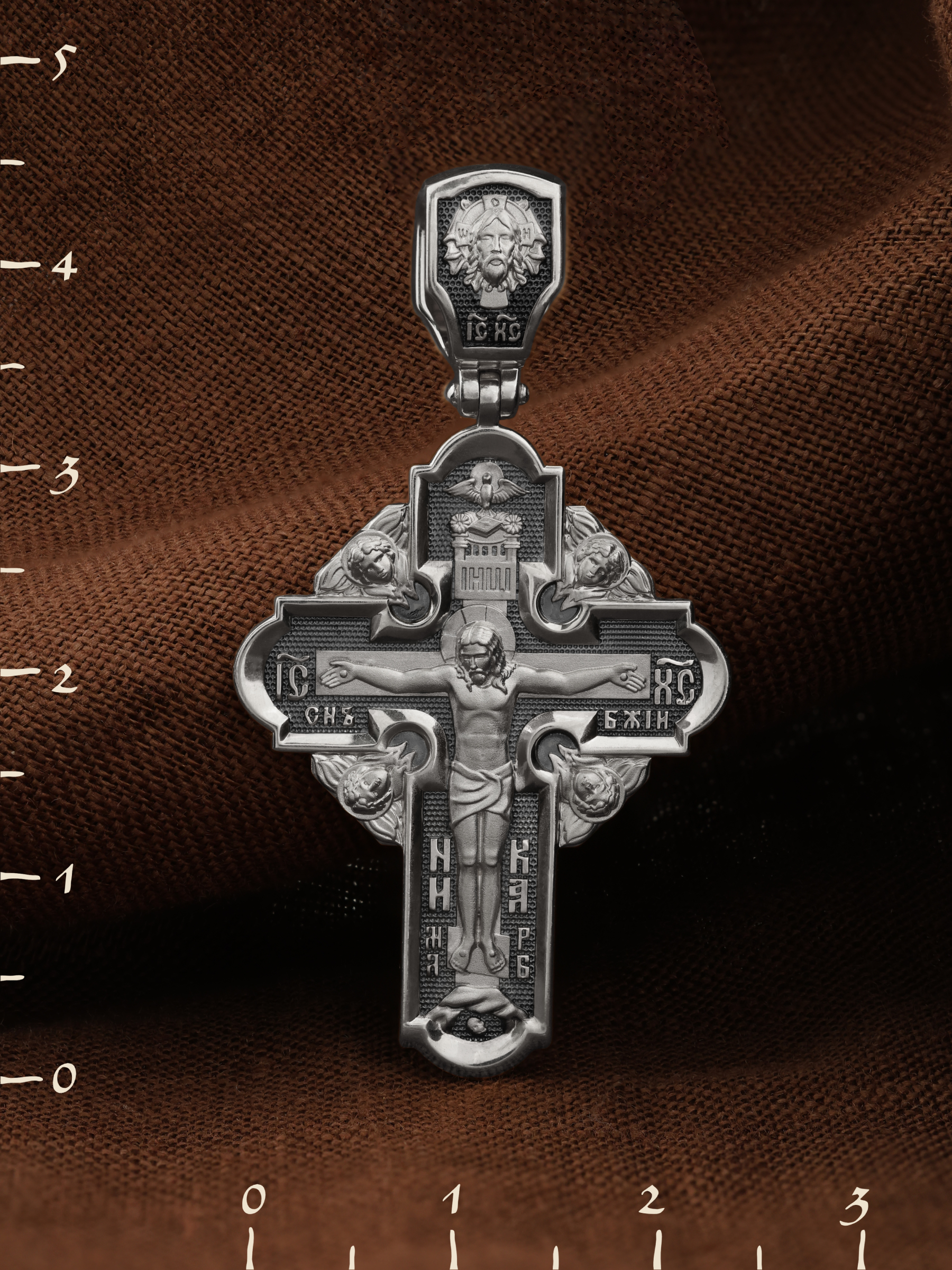 На лицевой стороне креста изображено Распятие Господа и Спасителя нашего Иисуса Христа. Крест- символ спасения и искупления рода человеческого, знамение победы над смертью и адом. Верхняя перекладина символизирует титло — табличку, на которой, согласно Евангелию, было начертано: Иисус Назорей Царь Иудейский (IНЦI). Надпись «IC» «ХC», означает Иисус Христос, помещается на разных сторонах поперечной перекладины креста. Ниже перекладины расположено словосочетание «СЫН БОЖИЙ», что означает божественную природу Иисуса Христа. Надпись «МЛРБ» — «место лобное рай бысть» означает, что место лобное стало раем и помещаются в нижней части креста. Рядом — слово «НИКА», что означает «победитель». Возвышение, на котором стоит Крест, символизирует гору Голгофу, на которой произошло Распятие. Под подножием Креста изображена покоящаяся голова (череп) Адама. На кулонном кольце изображен Нерукотворный образ Господа и Спасителя нашего Иисуса Христа, чудесно отпечатавшийся на плате, которым Христос вытер свой лик.