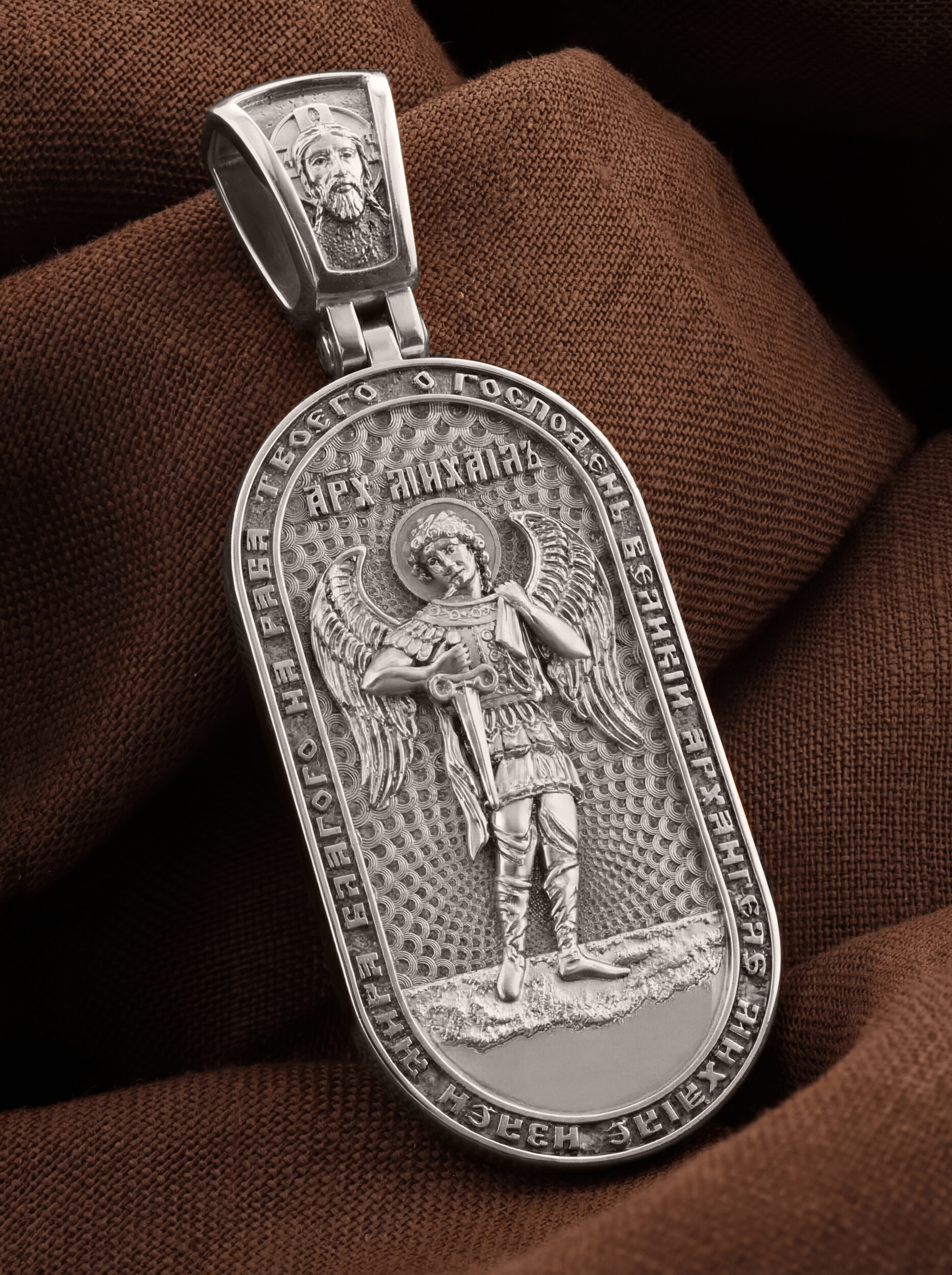 Основой композиции оборотной стороны является ростовое изображение Архангела Михаила — Архистратига всех Небесных Воинств. Он ведет непримиримую войну против сил зла, охраняет райские врата и защищает души людей. По контуру написана молитва: «О, Господень Великий Архангеле Михаиле, излей мира благого на раба Твоего». На кулонном кольце изображен Спас Нерукотворный — Символ вочеловечившегося Божества.