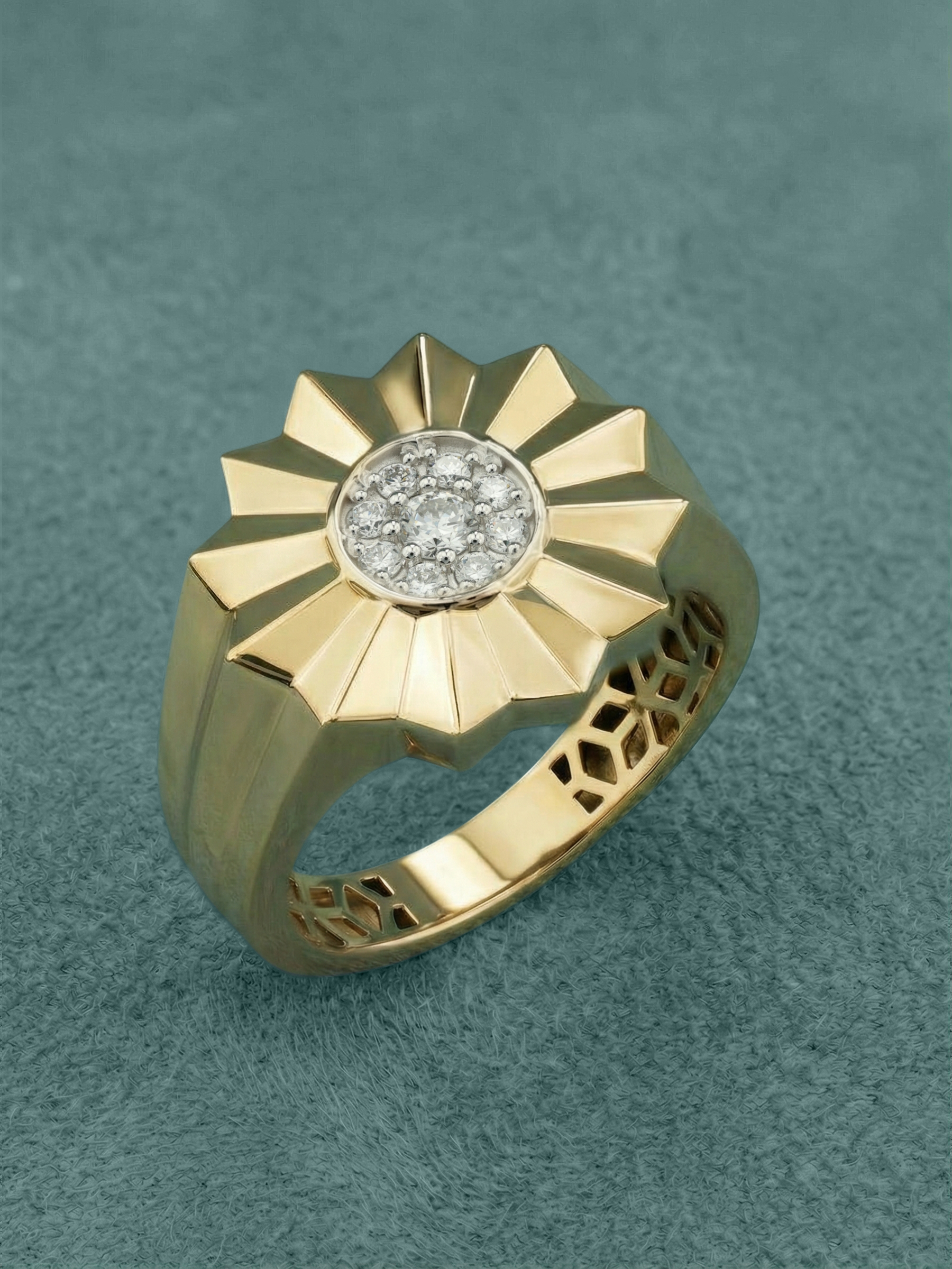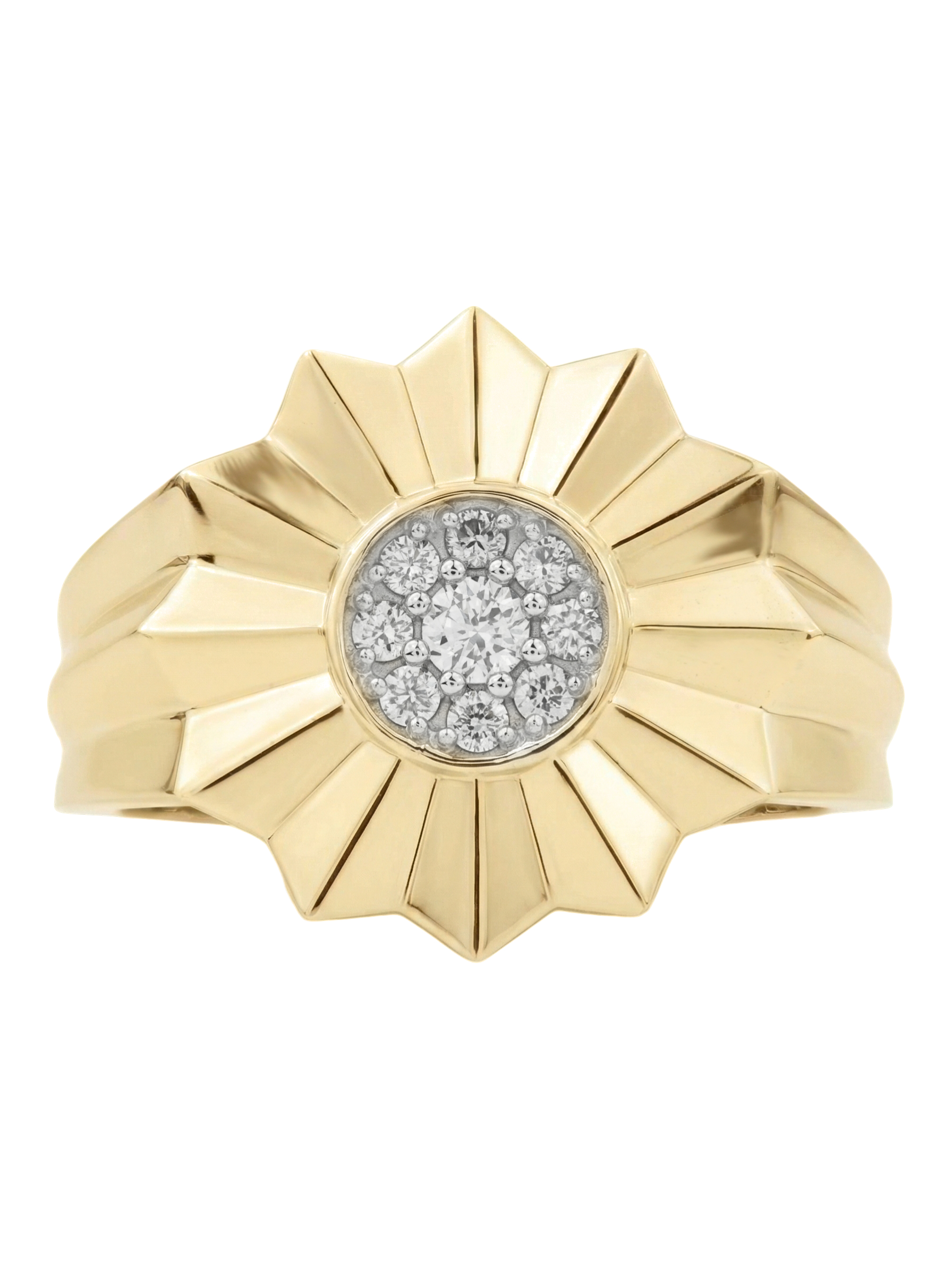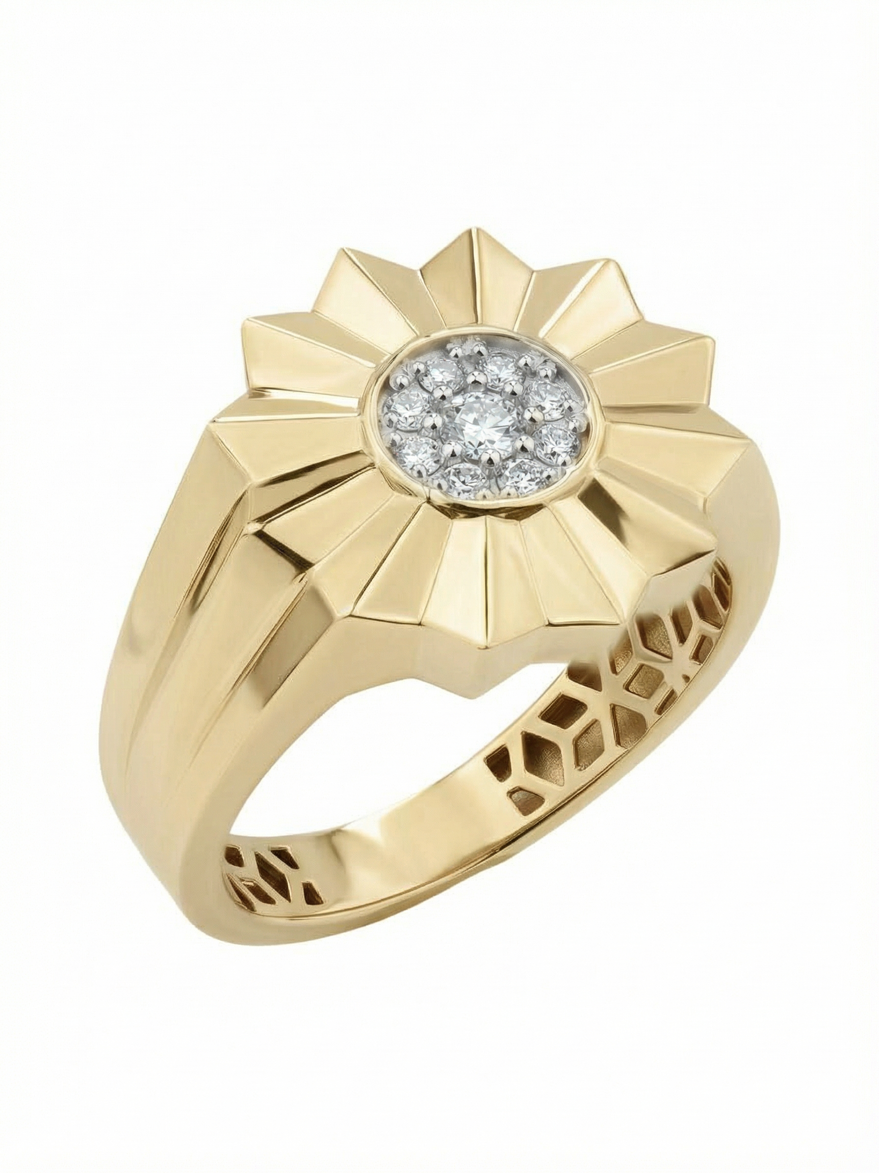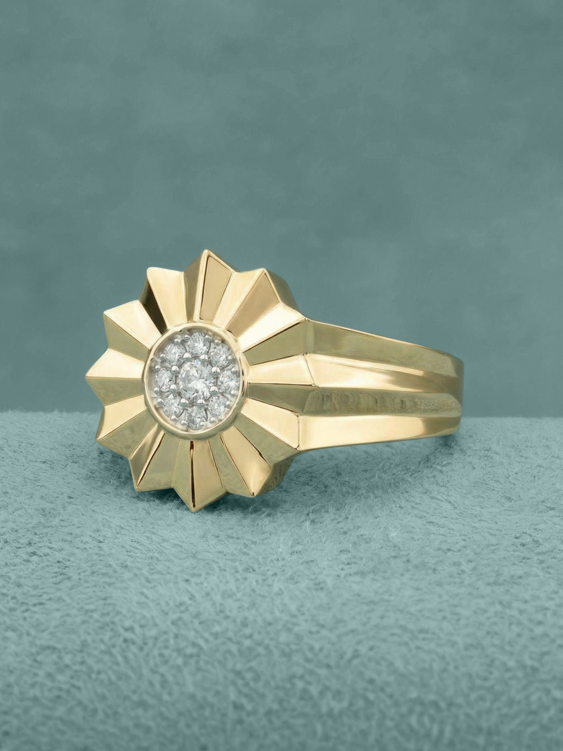 В сердце цветочного мотива расположена инкрустация из 9 сверкающих бриллиантов. Белые вставки круглой формы создают яркий контраст с лимонным золотом и притягивают взгляд своим блеском. Тщательная огранка подчеркивает чистоту каждого камня. Массивность и геометрическая строгость линий делают это кольцо универсальным аксессуаром: оно гармонично дополнит как женский, так и мужской образ.
