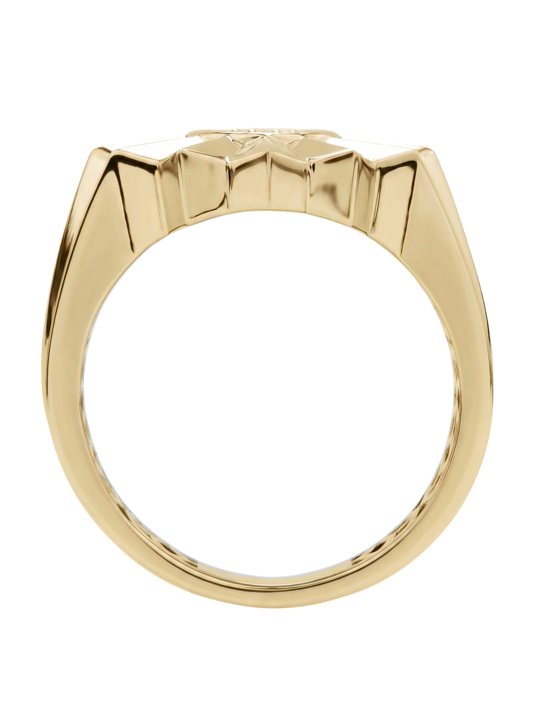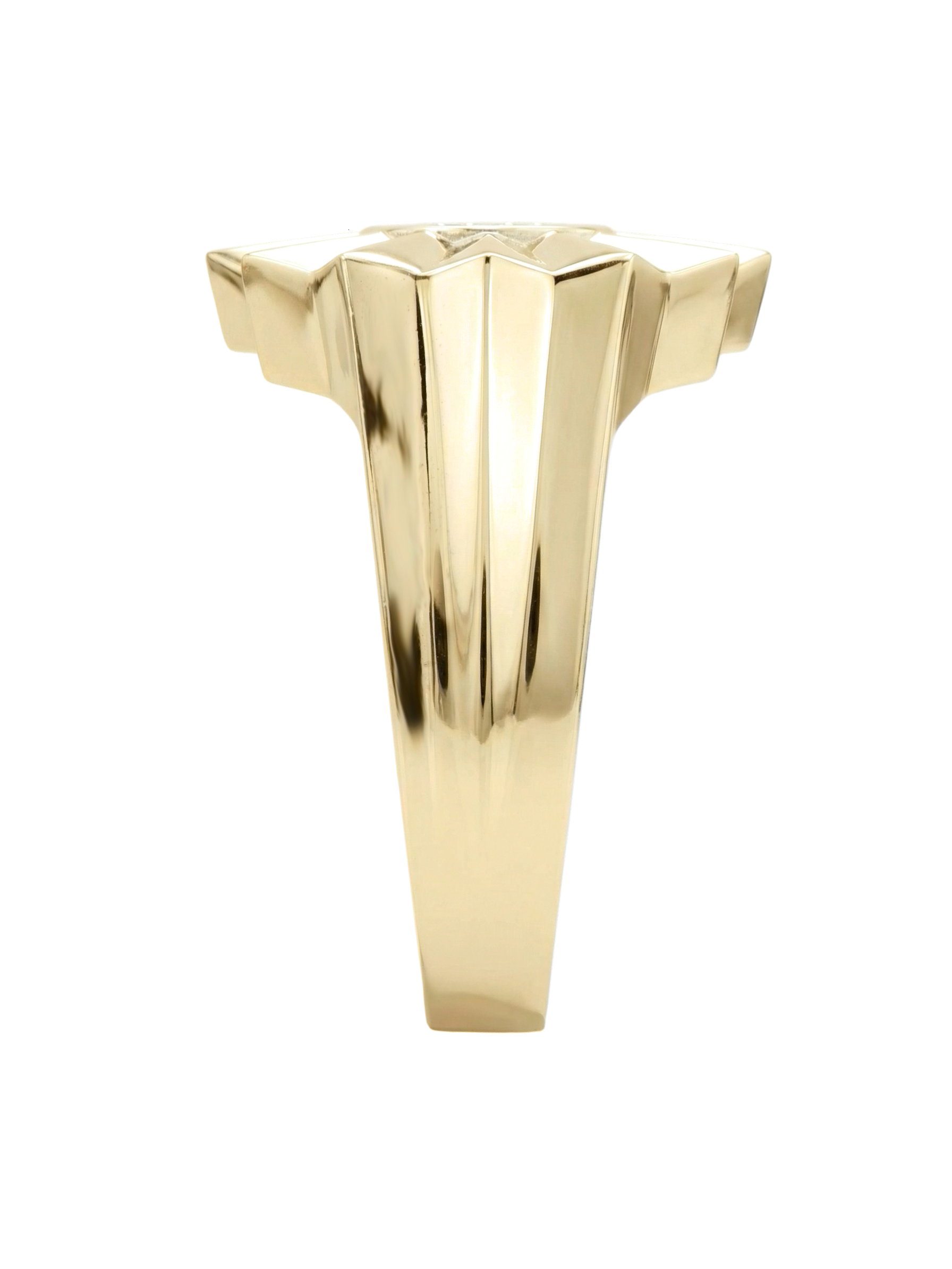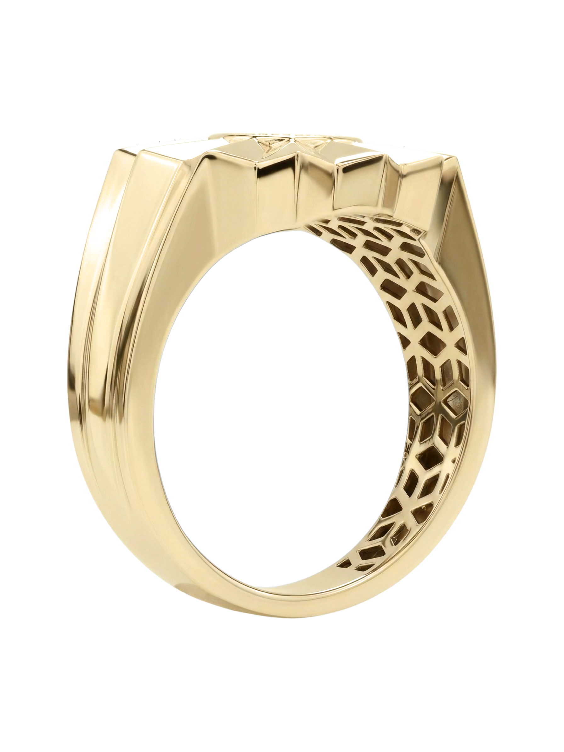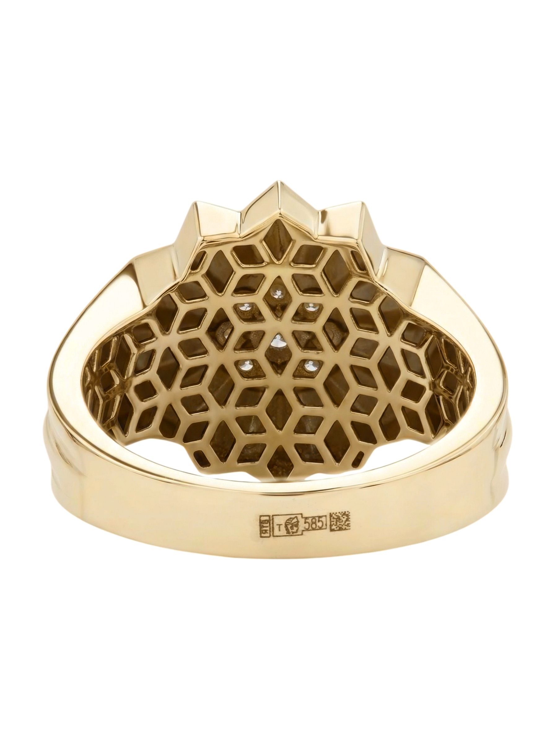 В сердце цветочного мотива расположена инкрустация из 9 сверкающих бриллиантов. Белые вставки круглой формы создают яркий контраст с лимонным золотом и притягивают взгляд своим блеском. Тщательная огранка подчеркивает чистоту каждого камня. Массивность и геометрическая строгость линий делают это кольцо универсальным аксессуаром: оно гармонично дополнит как женский, так и мужской образ.