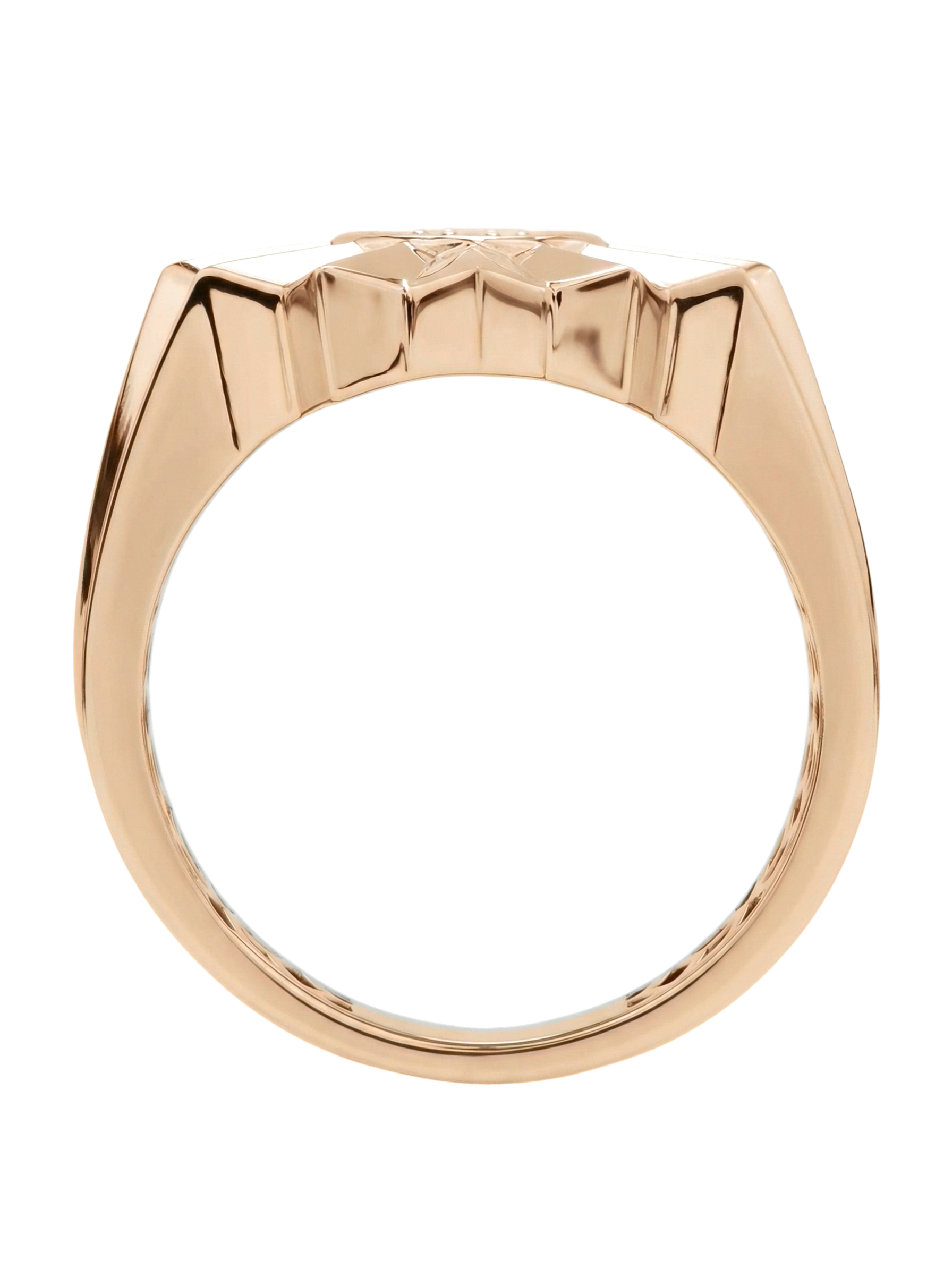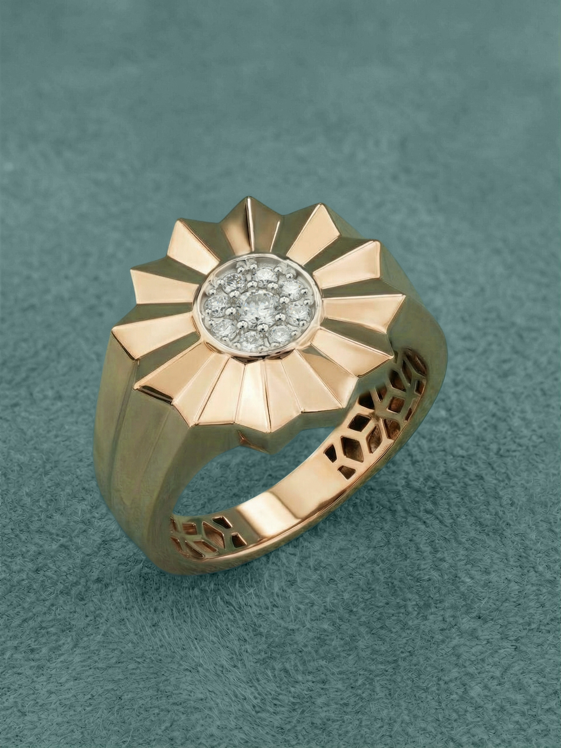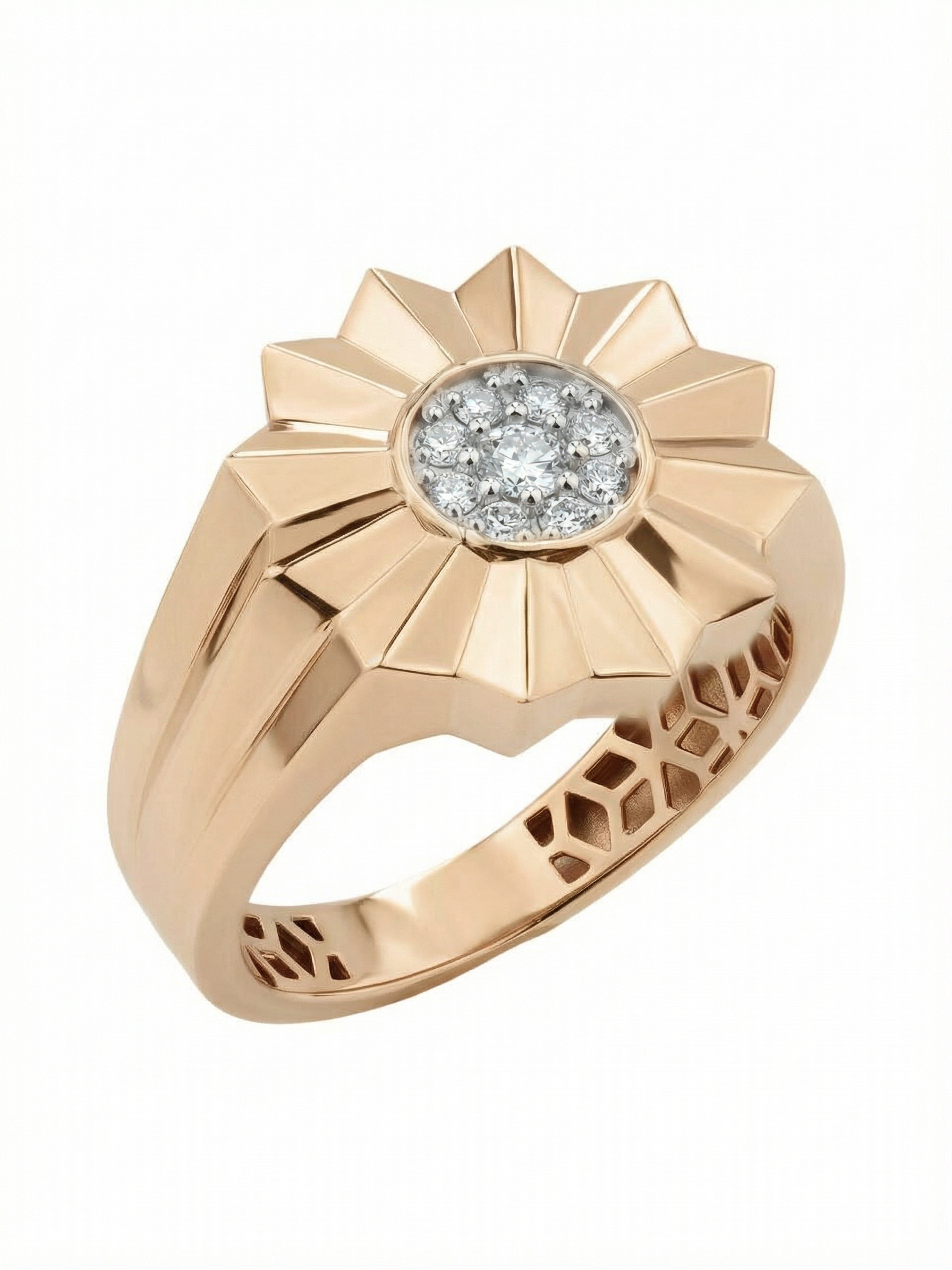 Сердце изделия украшено композицией из 9 ослепительных бриллиантов круглой формы. Белый цвет вставок эффектно контрастирует с теплым оттенком красного золота, создавая яркую игру света при каждом движении. Благодаря своей универсальной эстетике, это кольцо одинаково гармонично дополнит образ как для женщин, так и для мужчин, подчеркивая статус и безупречный вкус своего владельца.