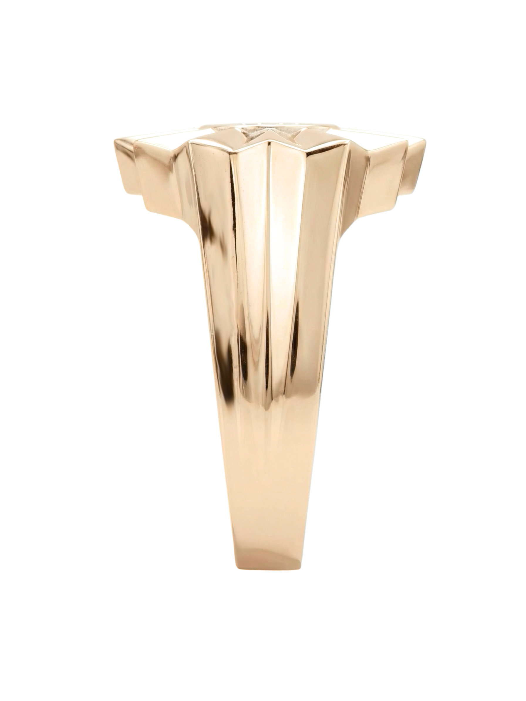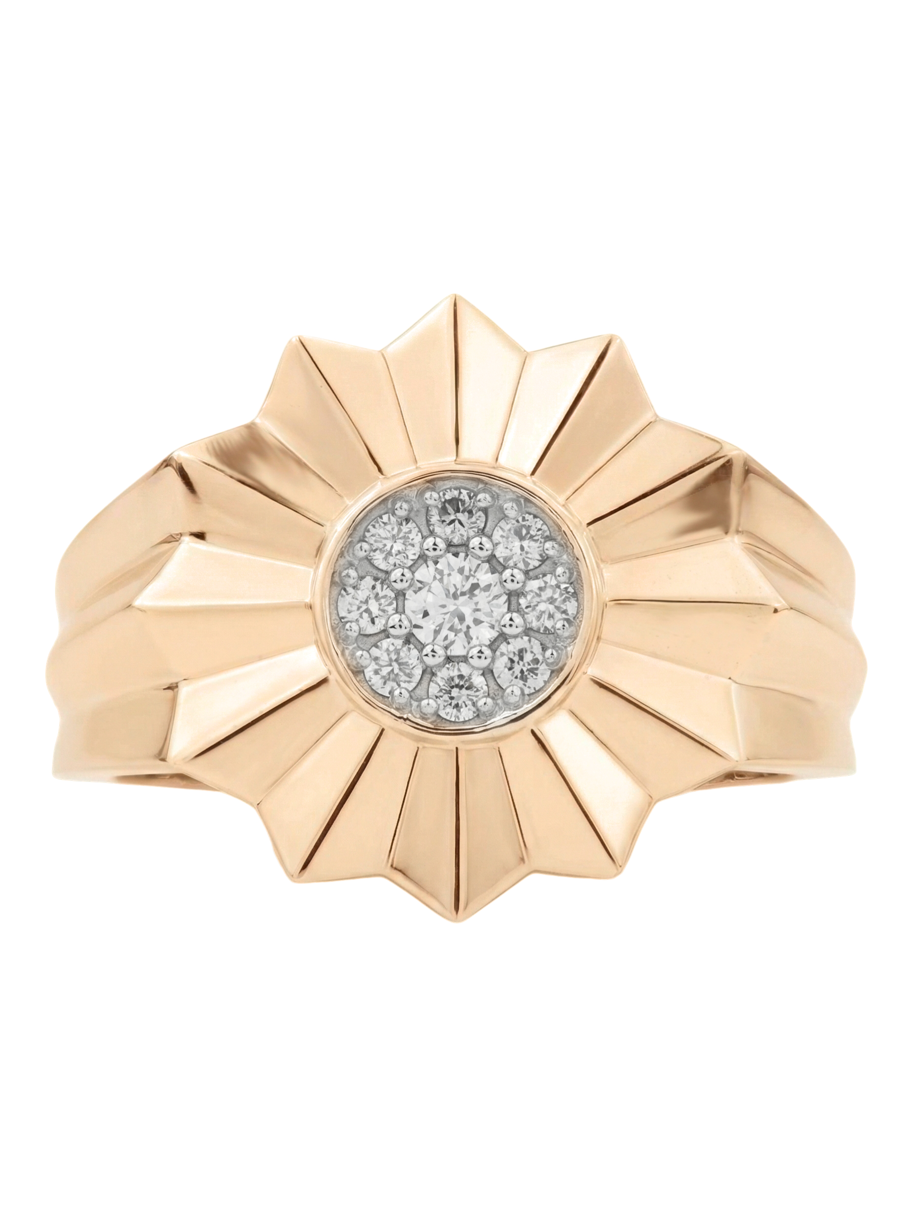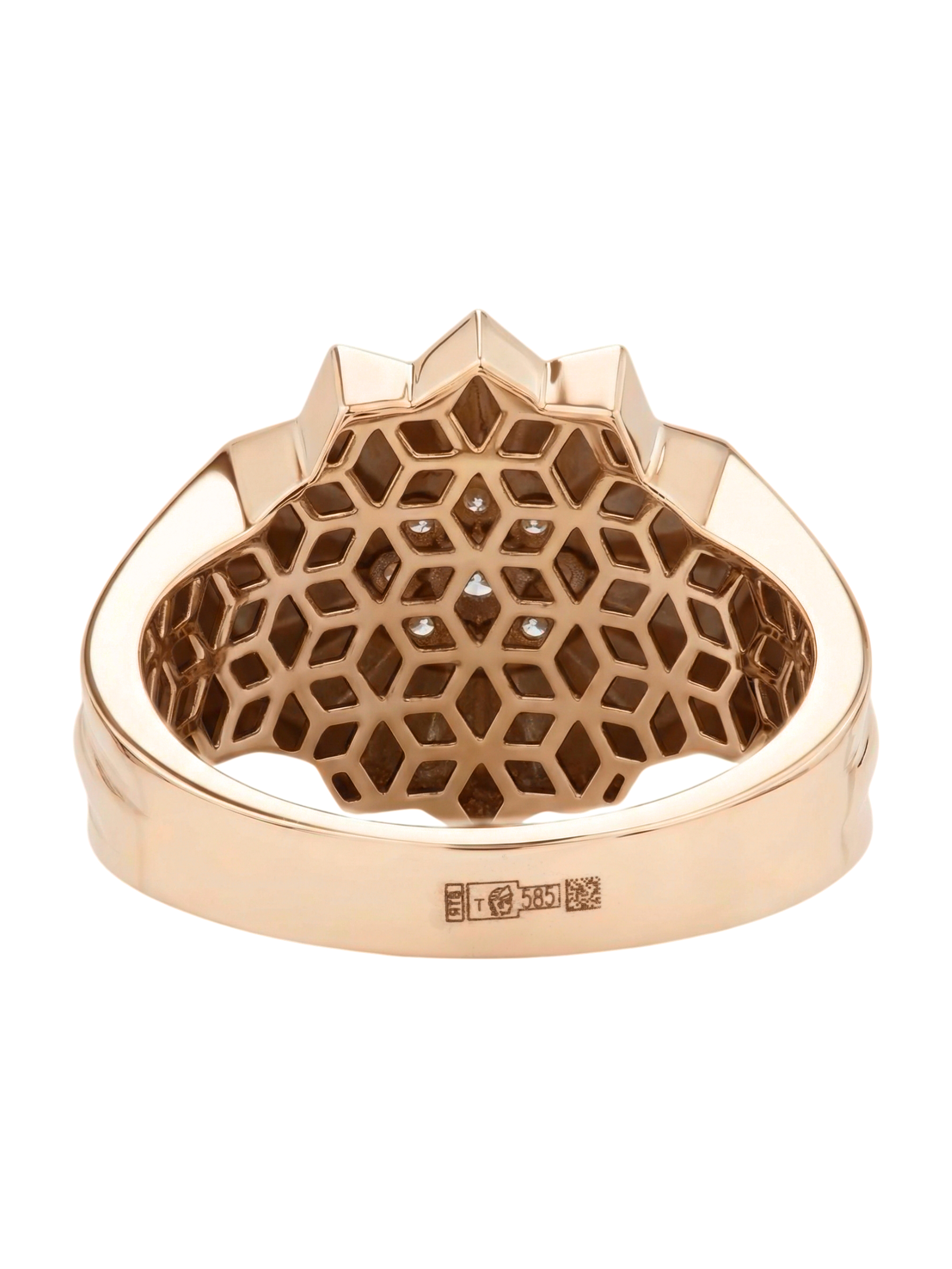Сердце изделия украшено композицией из 9 ослепительных бриллиантов круглой формы. Белый цвет вставок эффектно контрастирует с теплым оттенком красного золота, создавая яркую игру света при каждом движении. Благодаря своей универсальной эстетике, это кольцо одинаково гармонично дополнит образ как для женщин, так и для мужчин, подчеркивая статус и безупречный вкус своего владельца.