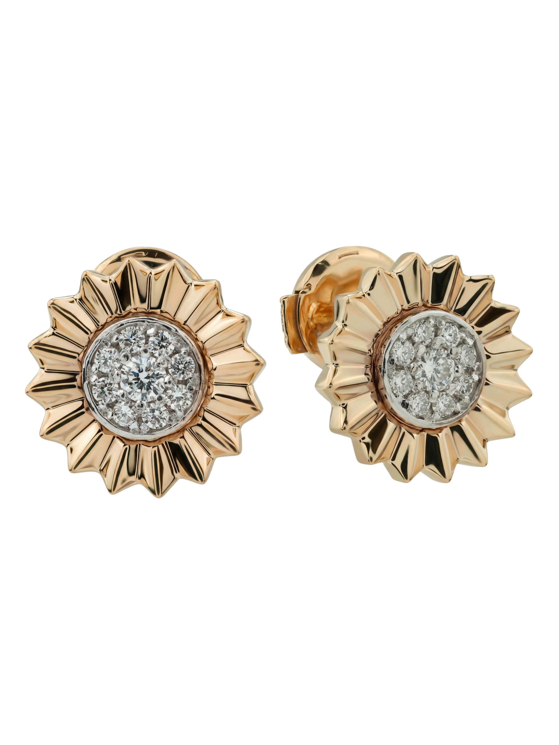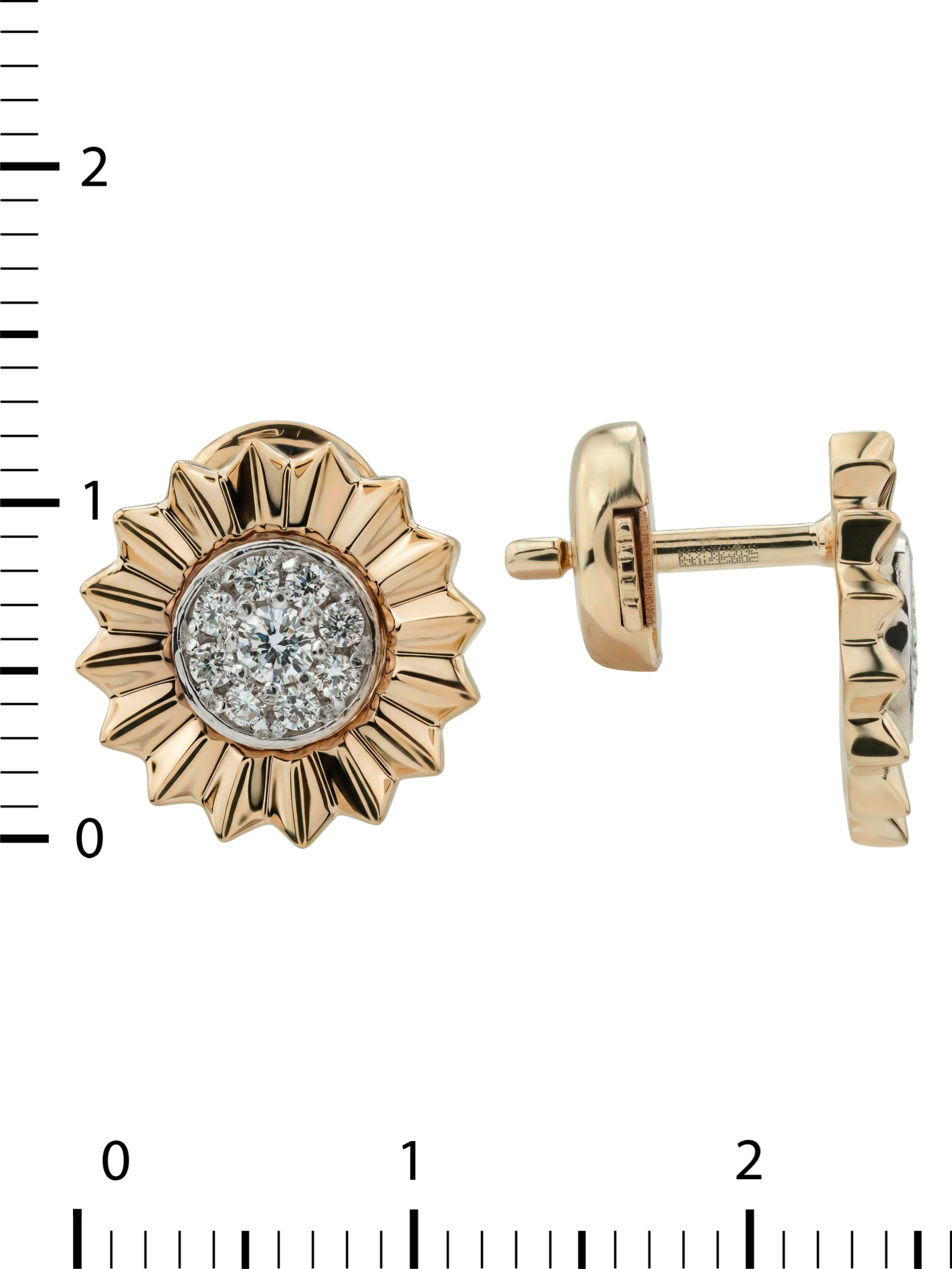 Центральную часть каждого украшения украшает выразительная композиция из 18 бриллиантов круглой формы. Белый цвет вставок эффектно контрастирует с насыщенным красным золотом, создавая игру света при каждом повороте головы. Бриллианты расположены таким образом, что максимально раскрывают свой природный блеск, подчеркивая высокое качество исполнения каждого элемента.