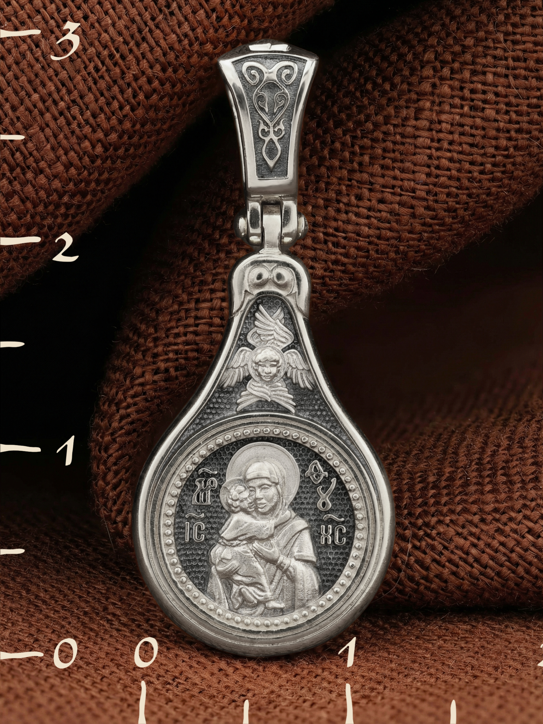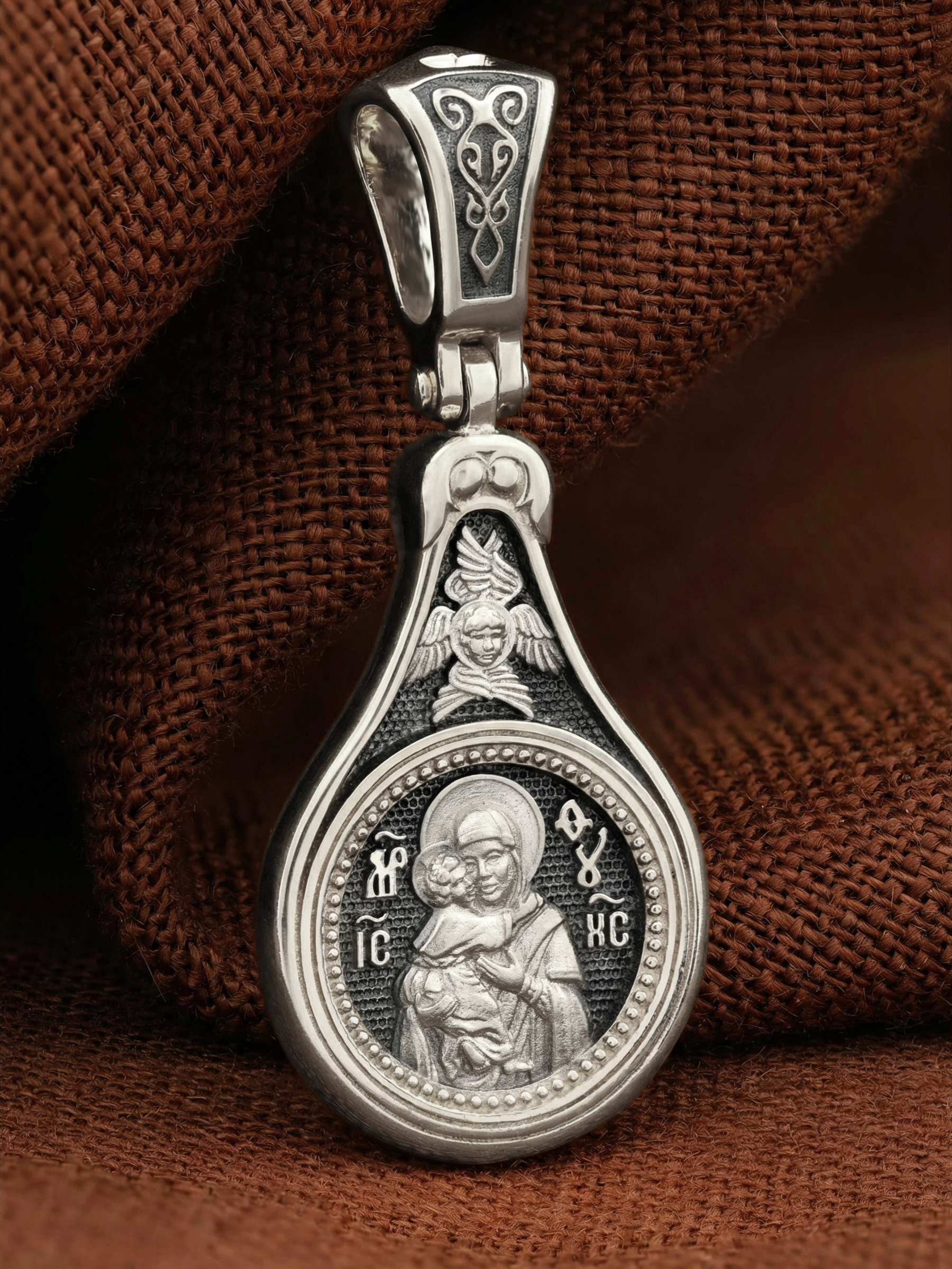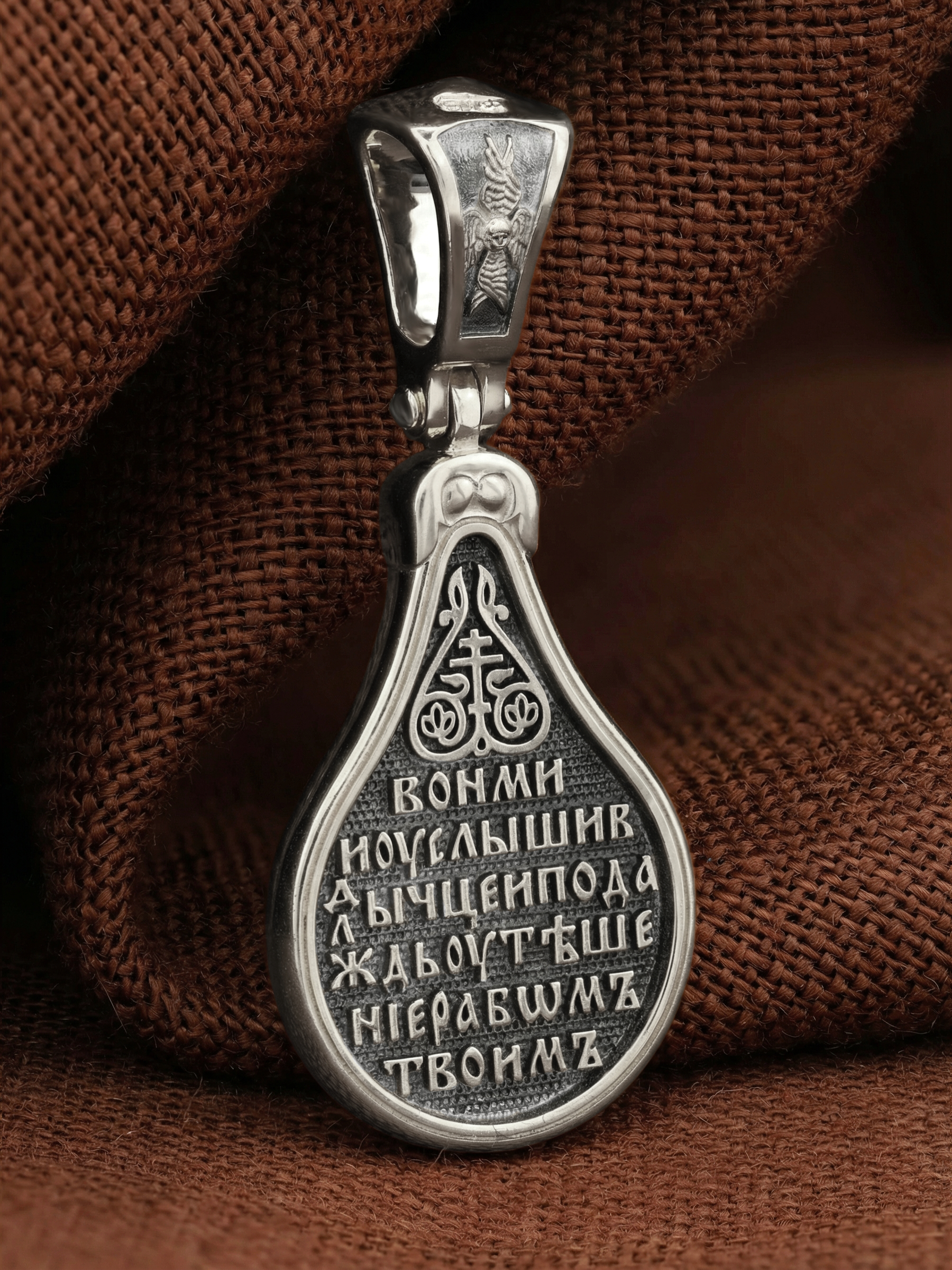 Лицевую сторону образка и кулонное кольцо украшает шестикрылый Серафим — самый приближенный к Господу Ангел.