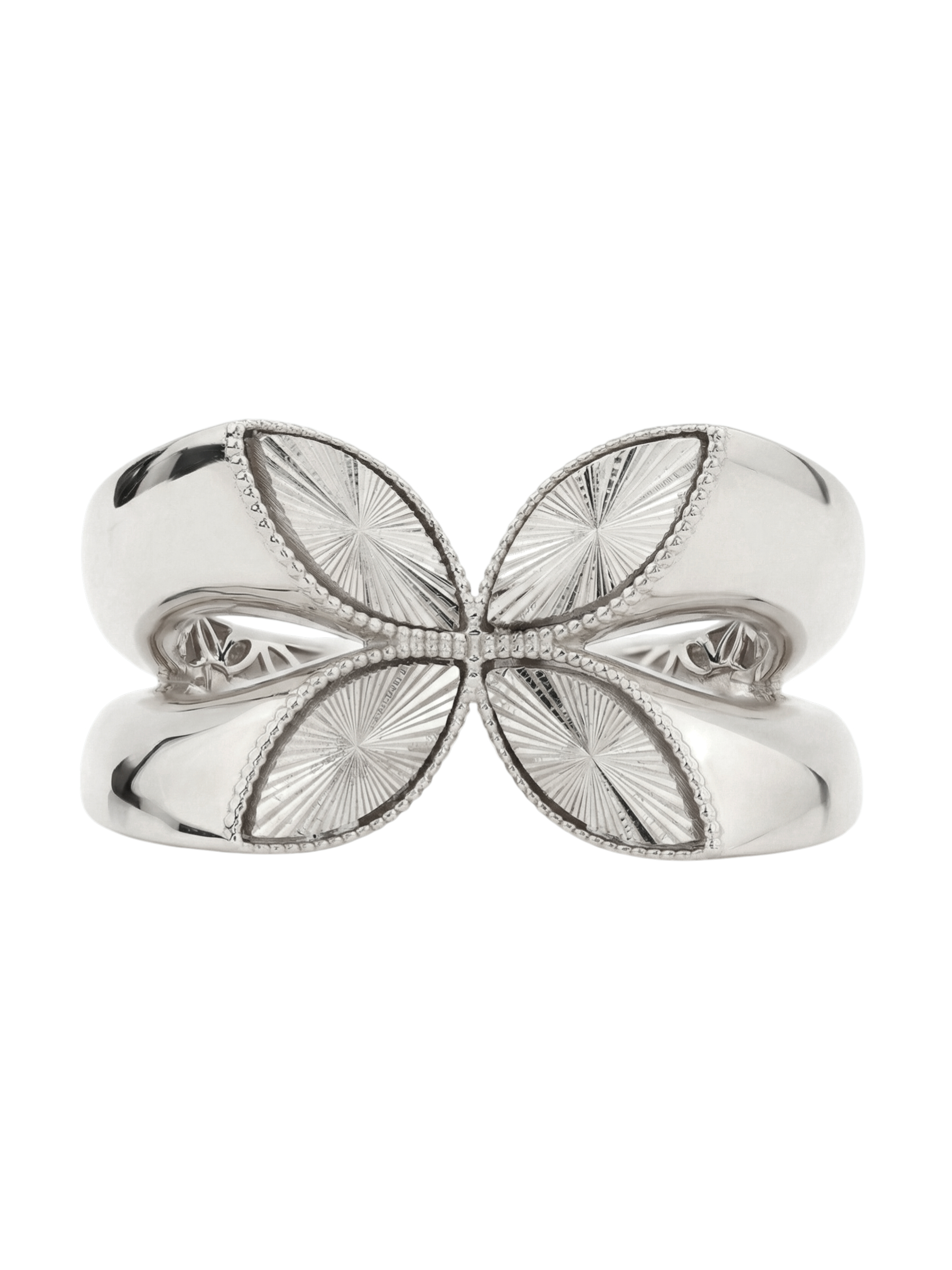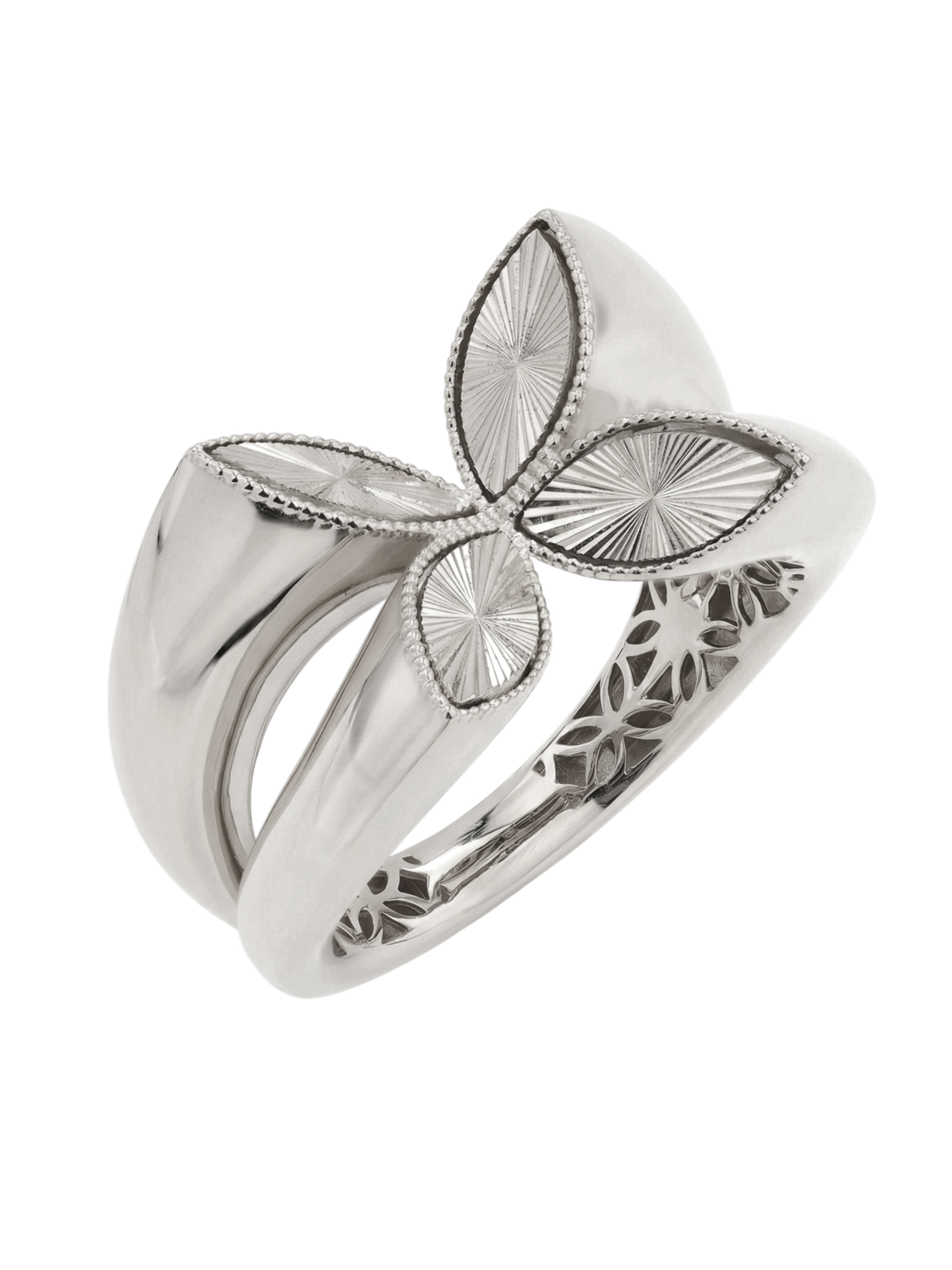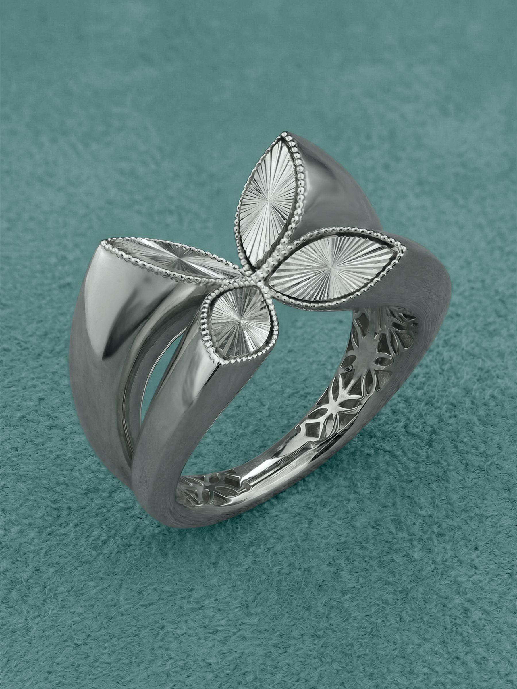 Изящное кольцо из белого золота 585 пробы станет утонченным дополнением вашего образа, подчеркивая безупречный вкус и внимание к деталям. Дизайн украшения, выполненный в форме клевера, привлекает взгляд своей гармоничностью и необычной фактурой. Мастера коллекции Vioretty — Farfalla уделили особое внимание игре света на поверхности металла: центральные элементы декора отличаются выразительной лучевой гравировкой, которая эффектно контрастирует с гладкими, зеркально отполированными линиями шинки.
