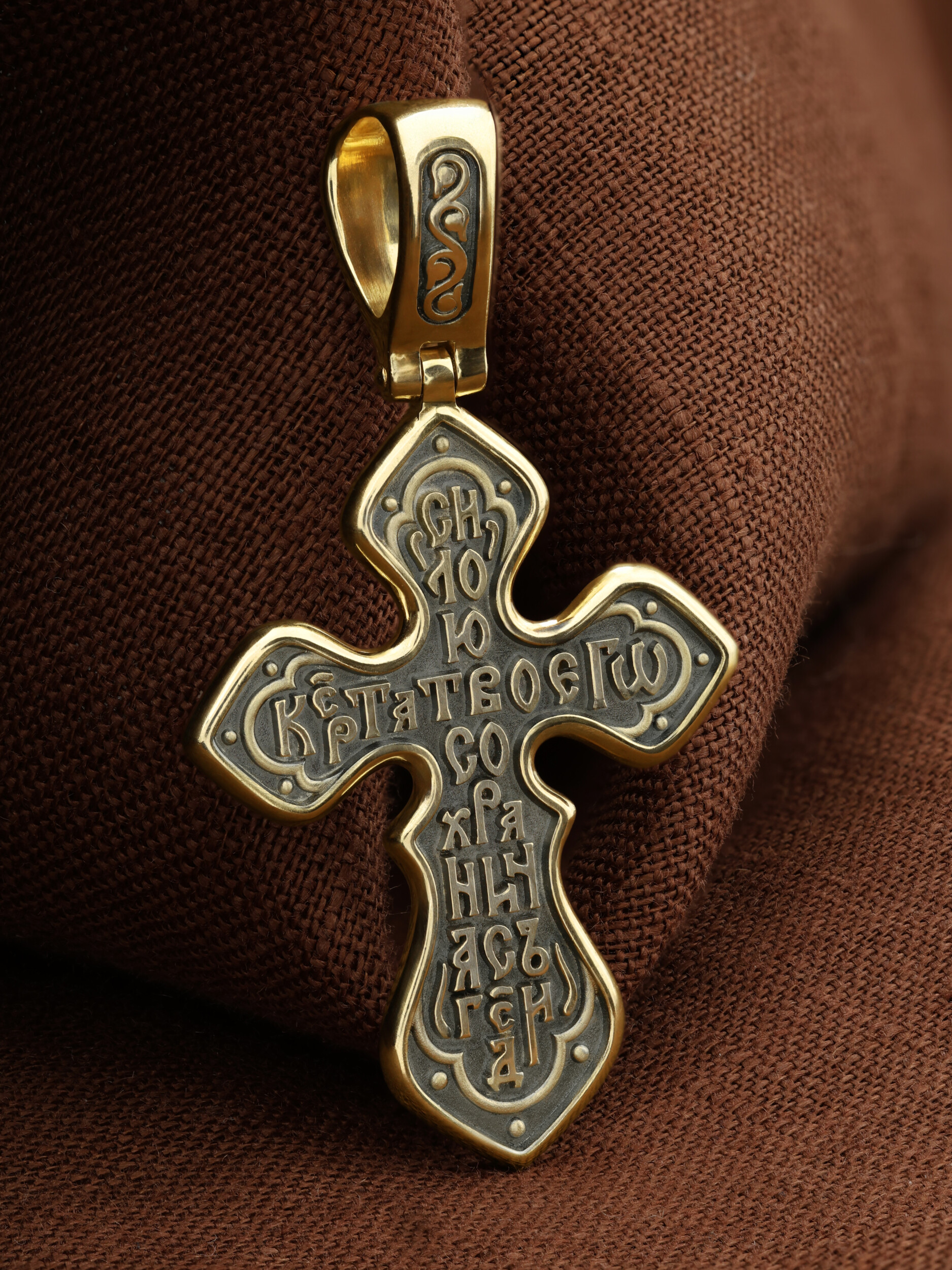 Все пространство оборотной стороны креста занято молитвенным обращением: «Силою Креста Твоего сохрани нас, Господи!»