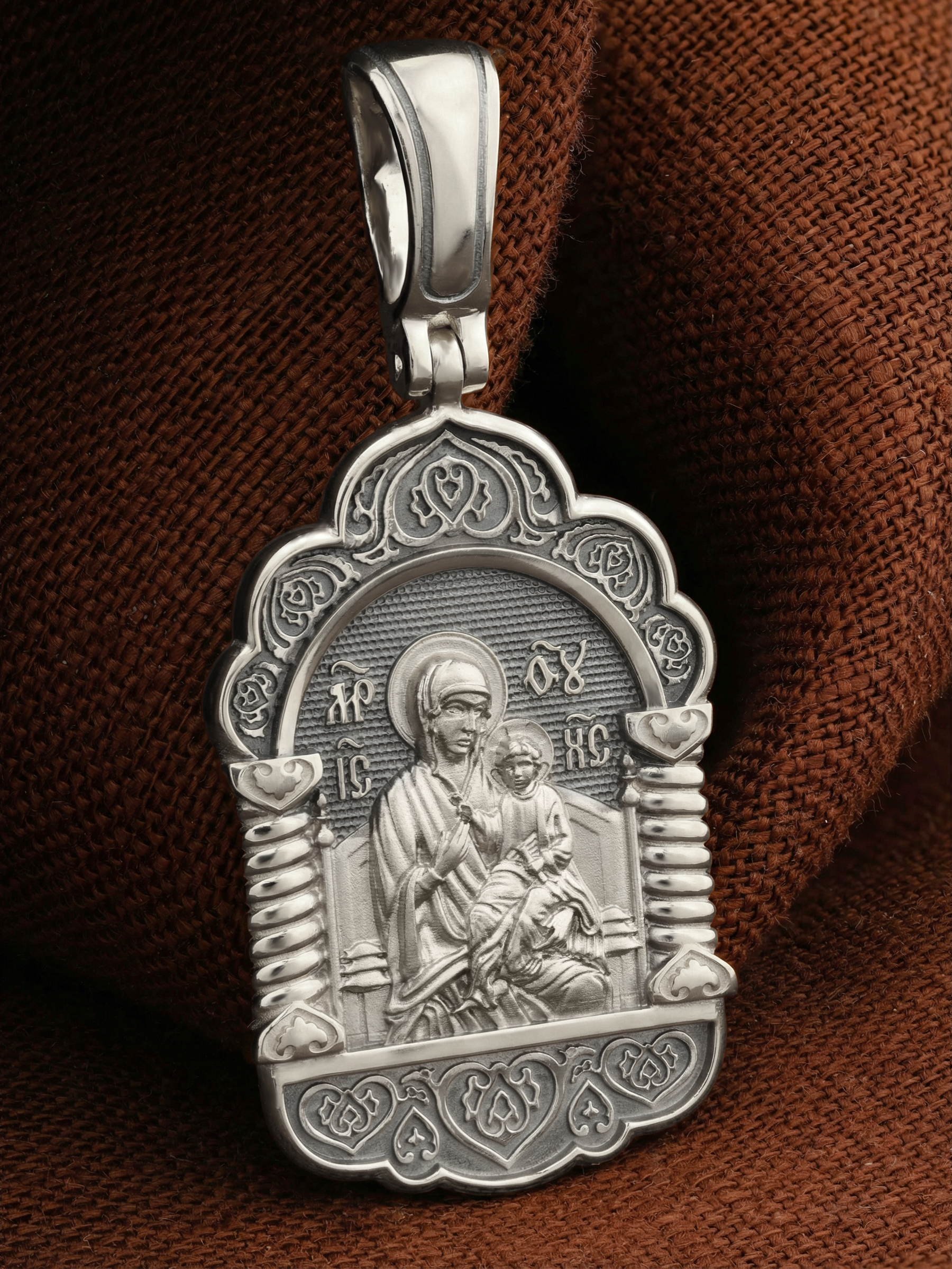 В центр образка помещен образ Божией Матери «Всецарица», восседающая на царском троне. На руках Ее — Богомладенец Иисус Христос со свитком в левой руке. Пальцы Его правой руки сложены в благословляющем жесте.