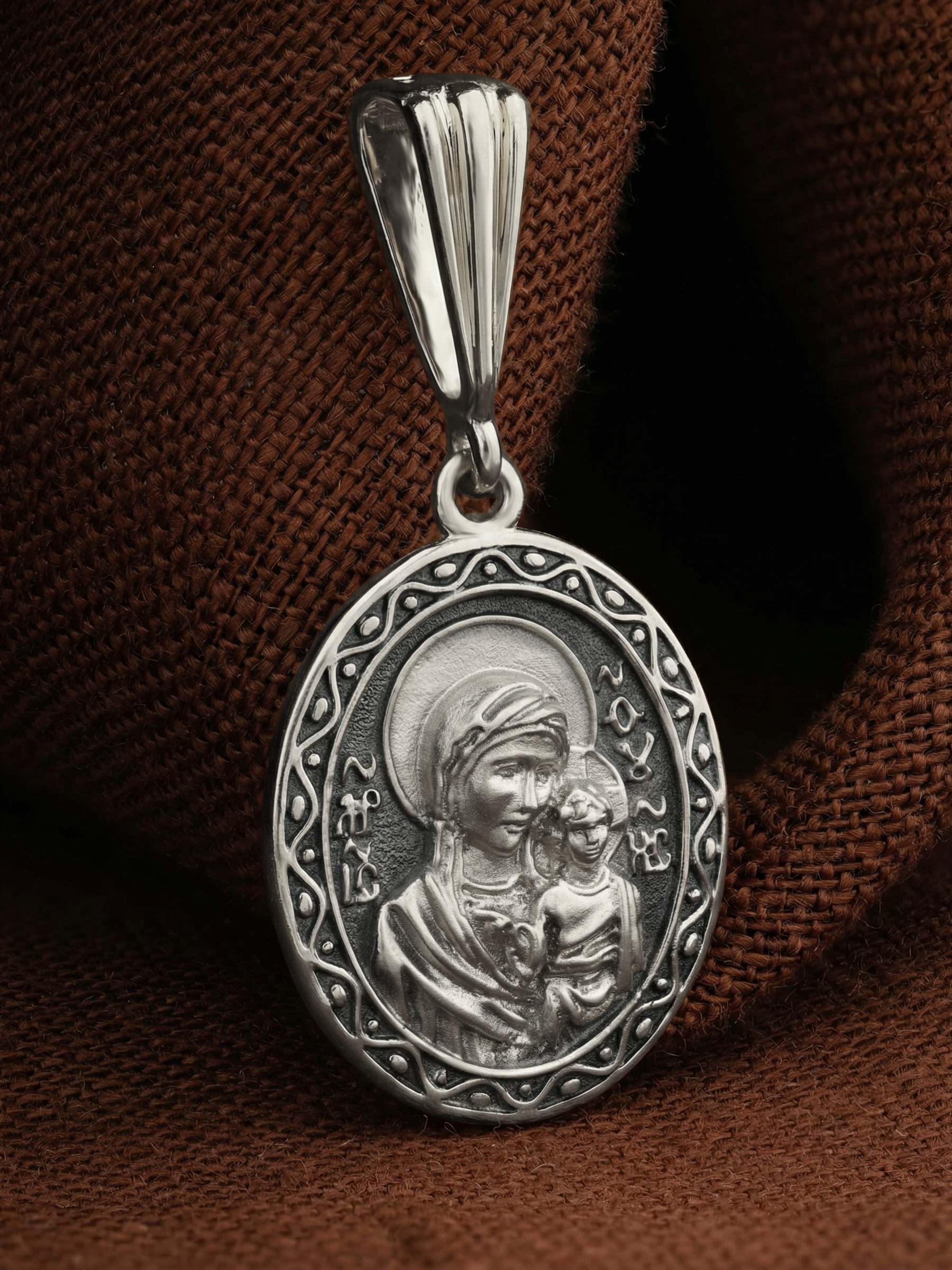 На лицевой части образка изображен Спас Вседержитель или Пантократор (от греч. «панкратос"— всевластный, всесильный) — центральный образ в иконографии Христа, представляющий Его как Небесного Царя и Судию. Господь правой рукой благословляет, а в левой держит Книгу Жизни, в которой для каждого человека есть своя страница.