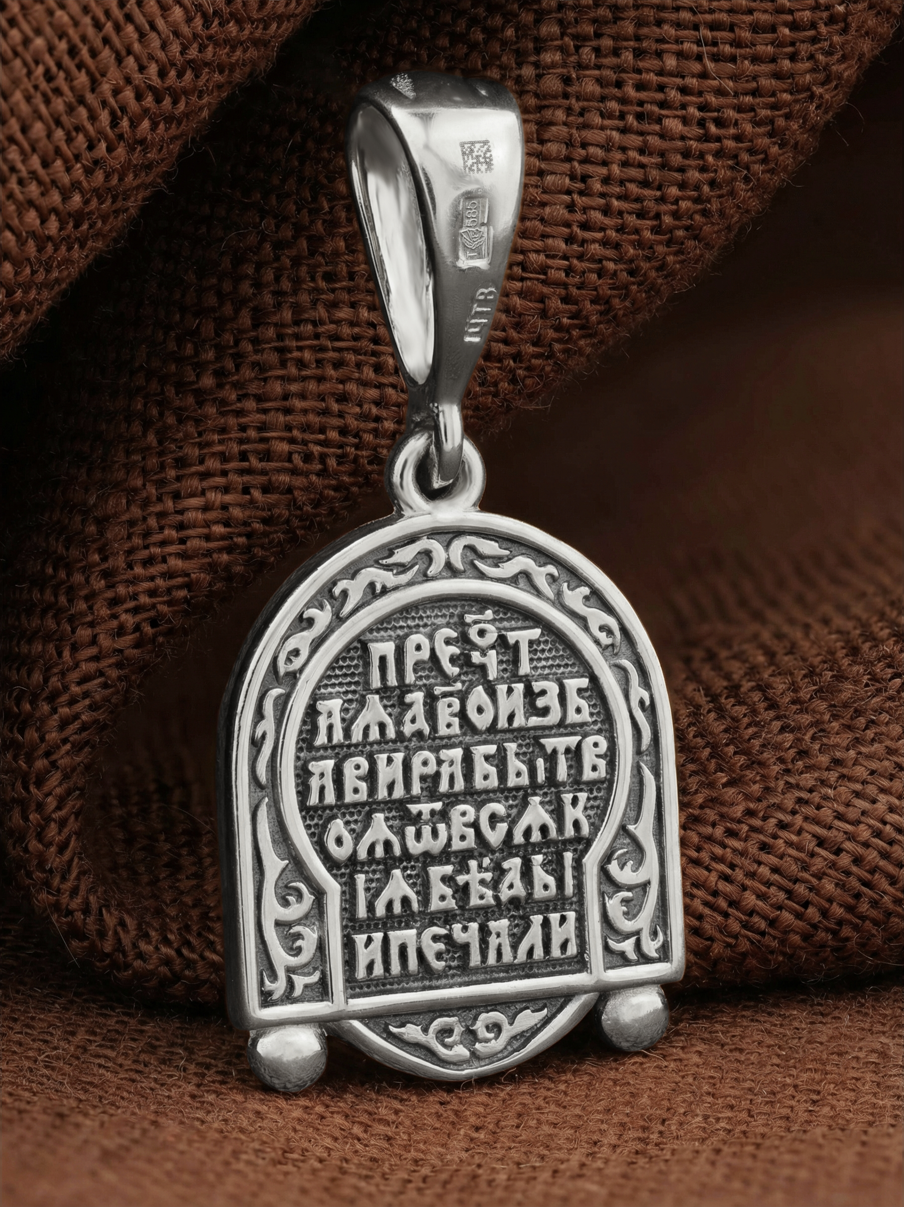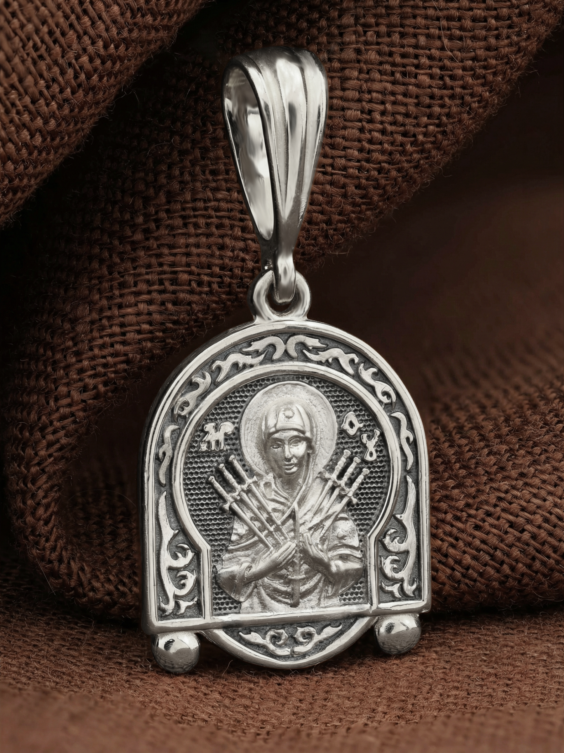 На лицевой стороне образка изображена икона Пресвятой Богородицы «Семистрельная» — одна из самых чудотворных икон на Руси. На протяжении многих веков христиане взывали к Царице Небесной через эту икону, если в стране начинались войны или мятежи.