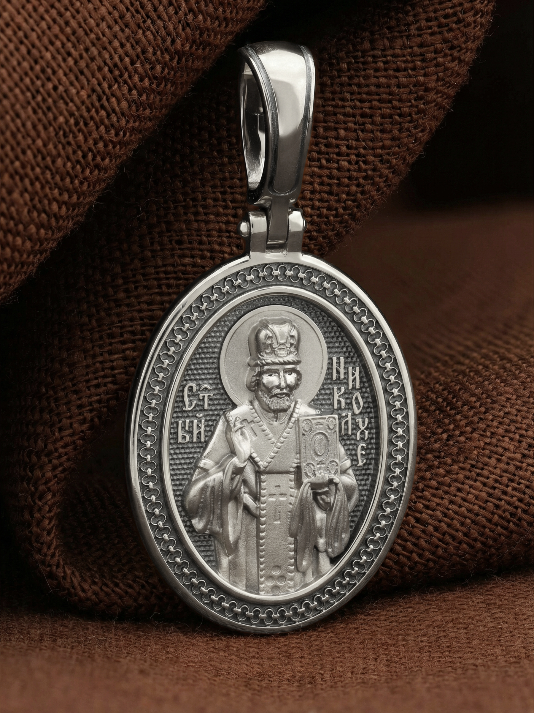 Лицевую сторону возглавляет икона святителя Николая Чудотворца. Святитель Николай родился во второй половине III века в Малой Азии в Ликийском городе Патары. С рождения Божий Угодник проявлял необыкновенные дарования. Сохранилось Предание, что во время крещения он, никем не поддерживаемый, простоял в купели три часа. С детства святитель избегал пустых развлечений, любил молитву, прекрасно учился и проводил свободное время за чтением Священного Писания. По достижении зрелого возраста жители Патар выбрали его своим пресвитером. Несколько лет спустя св. Николай стал епископом в городе Миры, столице Ликии.