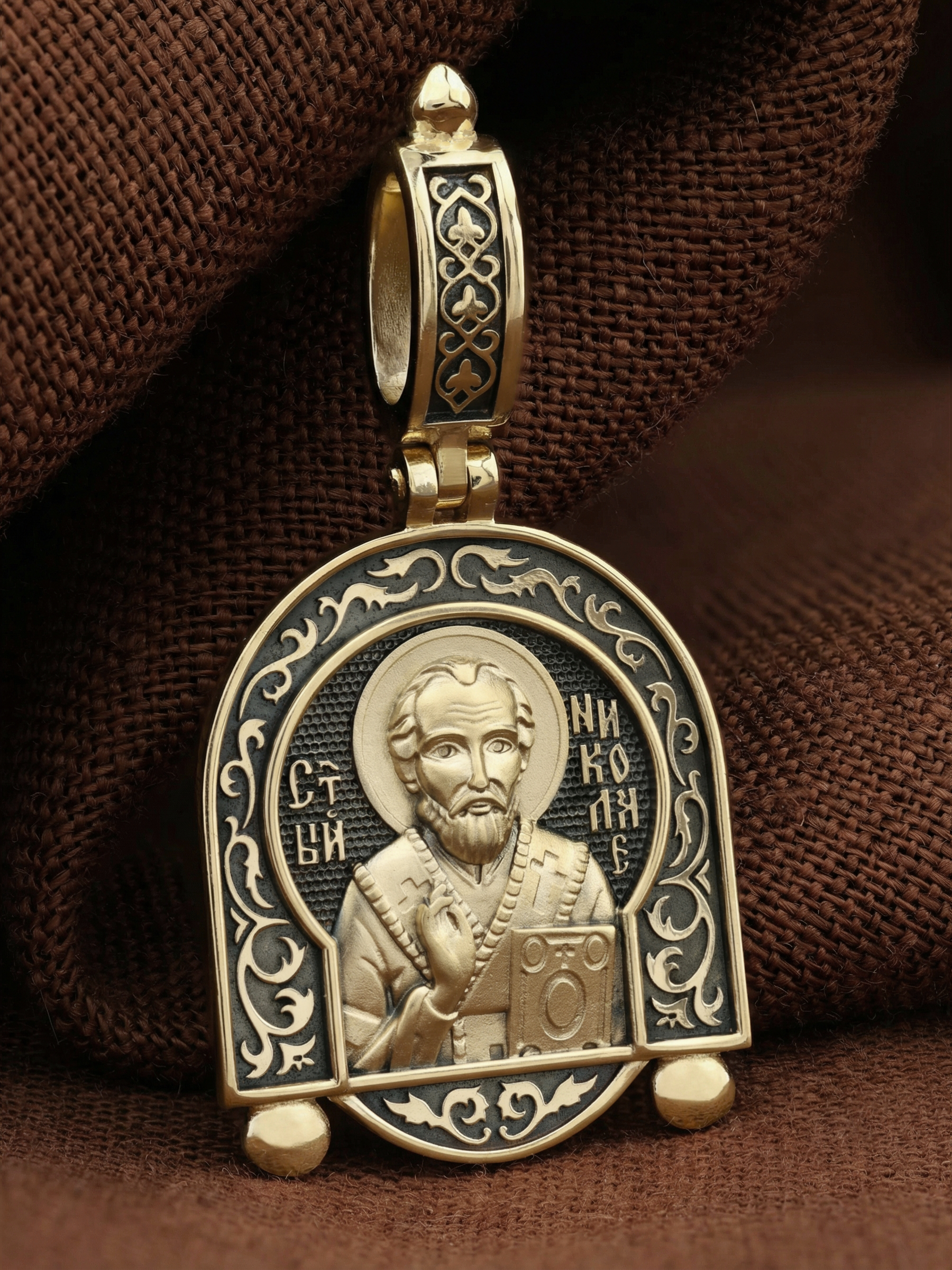 На лицевой стороне образка изображен Святитель Николай архиепископ Мир Ликийских, Чудотворец. Он является одним из самых почитаемых святых в православном мире. Святитель Николай родился во второй половине III века в Малой Азии в Ликийском городе Патары. С рождения Божий Угодник проявлял необыкновенные дарования. Сохранилось Предание, что во время крещения он, никем не поддерживаемый, простоял в купели три часа. Приняв сан священника, святитель Николай стал проводить еще более строгую подвижническую жизнь. Избранник Божий Николай стал вершиной всех добродетелей, поднятой до райской высоты. С кем из величайших праведников не сравнялся он образом духовной красоты, кому из них не последовал в своих деяниях и чудотворениях? Вся жизнь святого Николая — это служение Богу. Много великих и преславных чудес сотворил великий Святитель Николай Угодник. Он помогал сущим в бедах, укрощал штормы, спасал от потопления и выносил на сушу из глубины морской, освобождал из плена и приносил освобожденных домой, избавлял от уз и темницы, защищал от посечения мечом, освобождал от смерти и подавал многим различные исцеления: слепым — прозрение, хромым — хождение, глухим — слух, немым — дар слова.