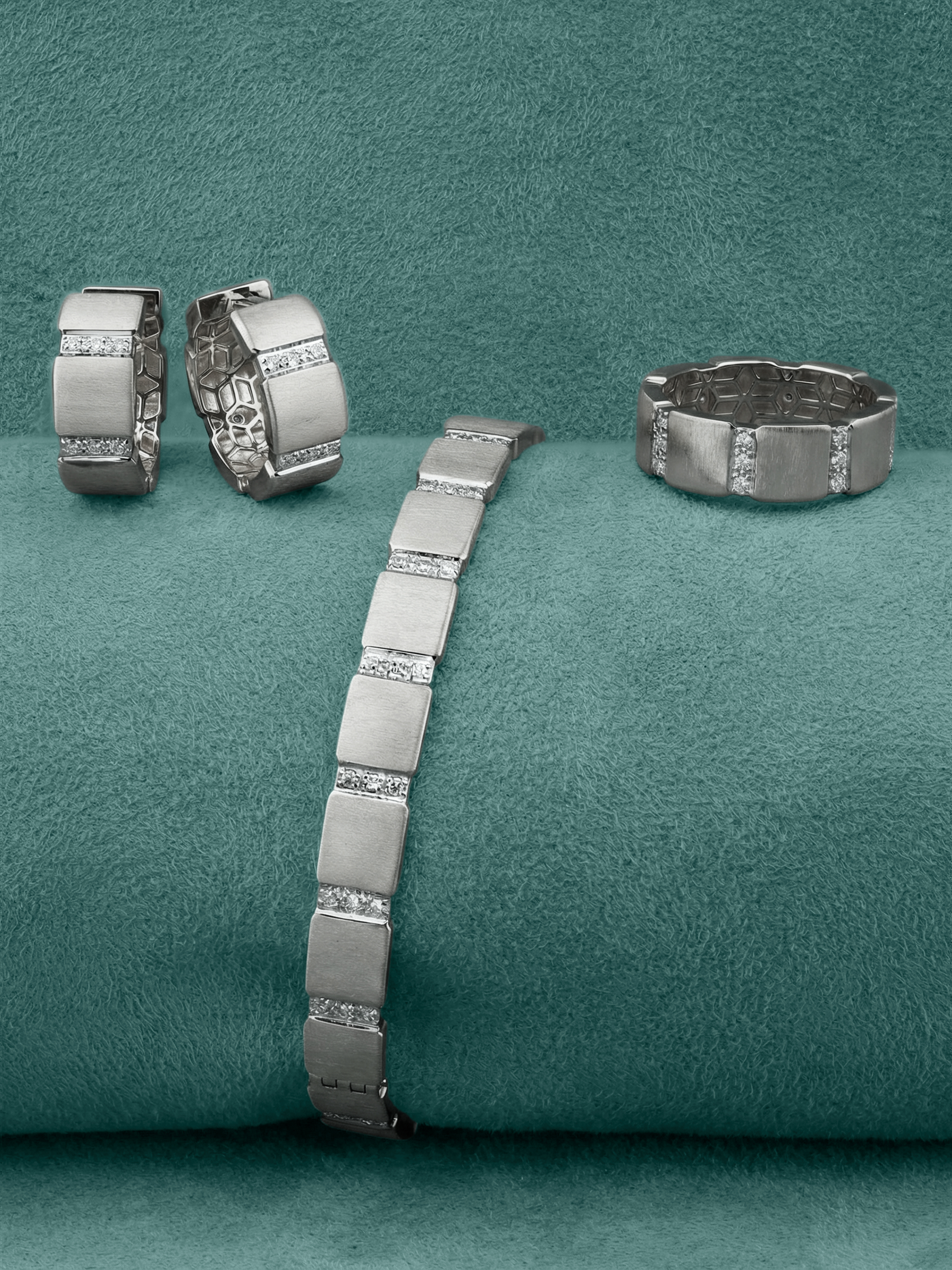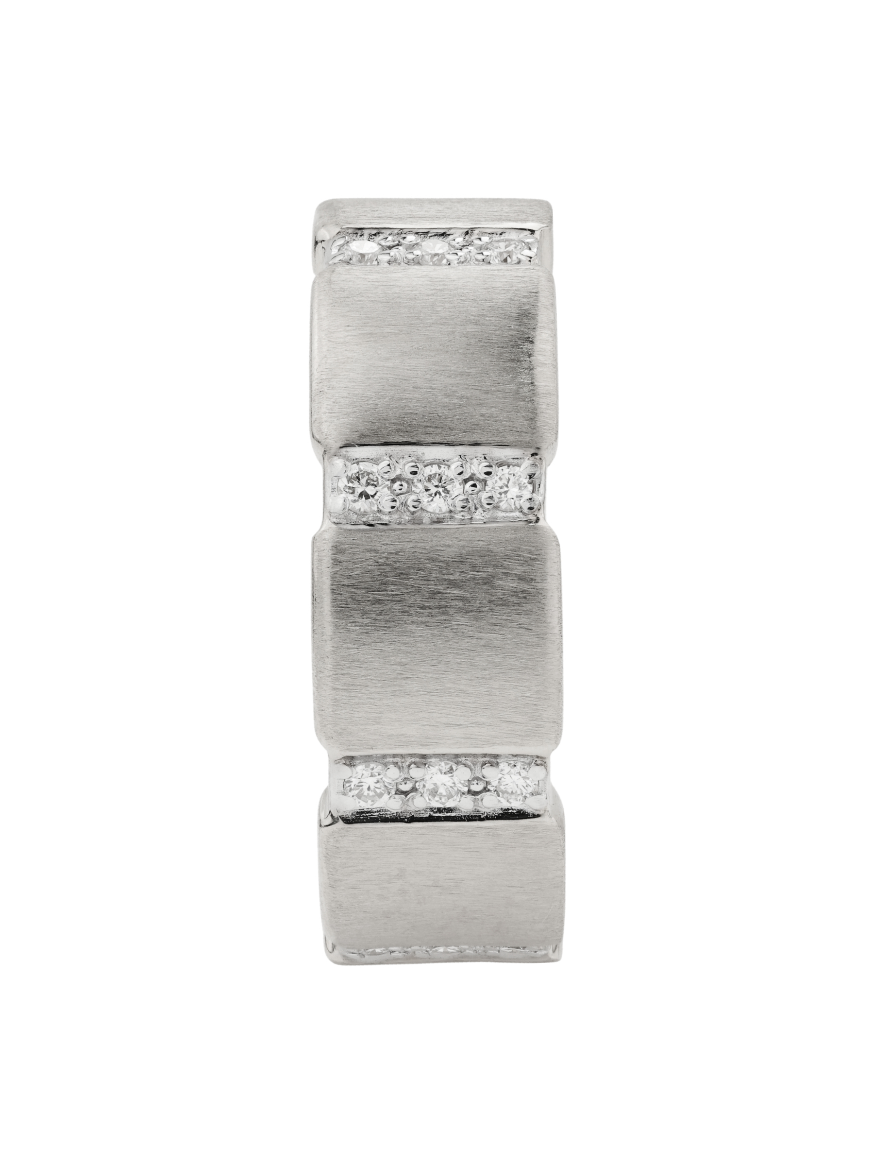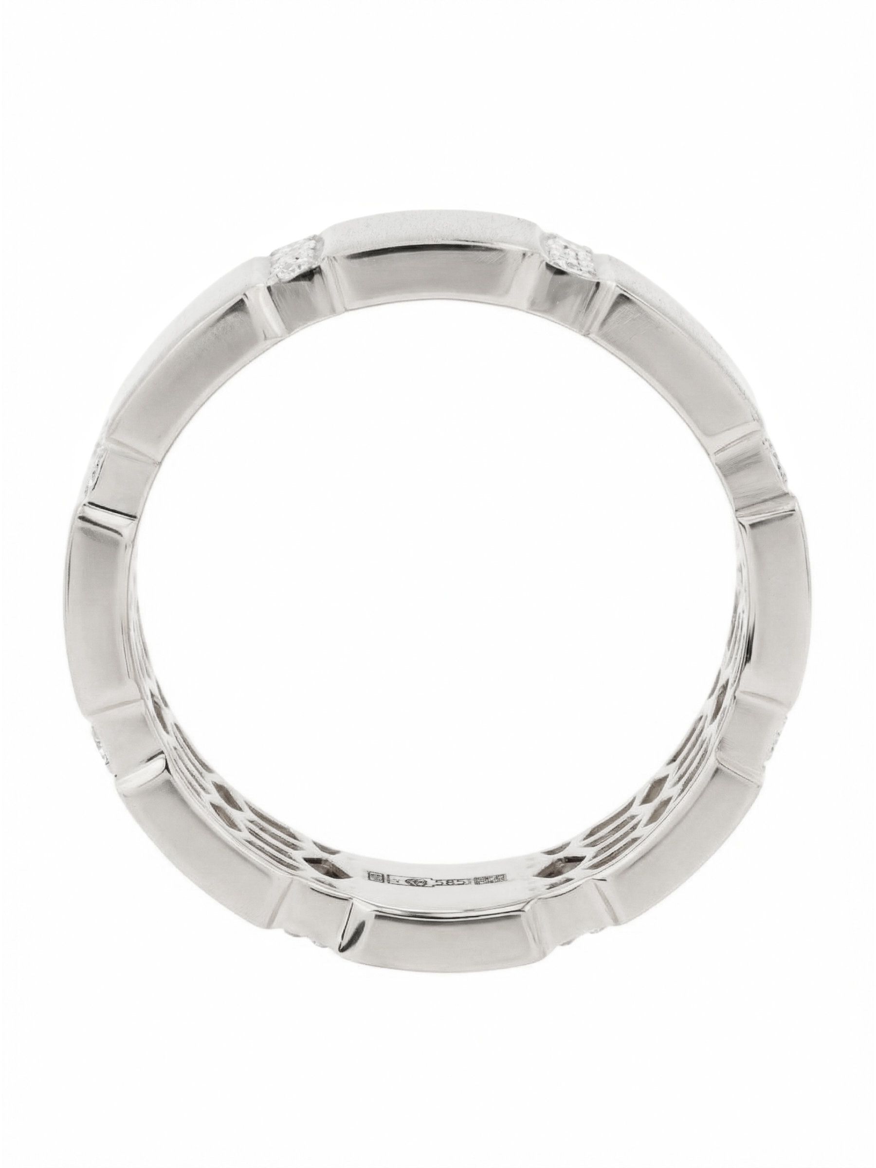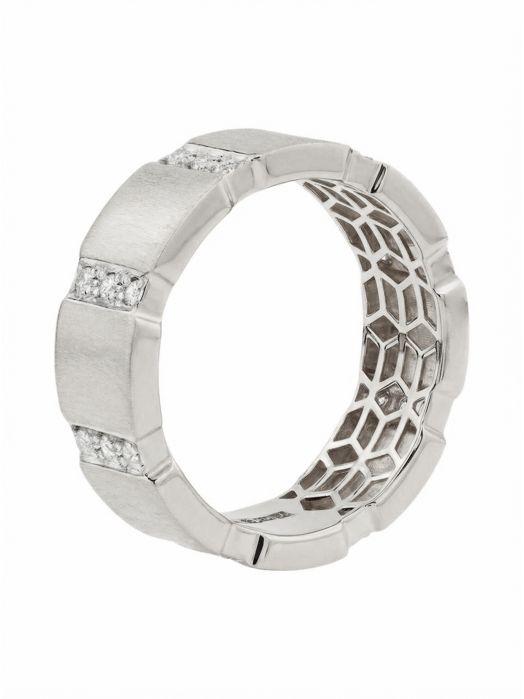 Центральным элементом композиции выступает инкрустация: 24 бриллианта круглой формы с безупречным белым цветом вставок расположены таким образом, чтобы подчеркнуть геометрию изделия. Игра света на гранях камней эффектно контрастирует со строгими линиями основы, придавая украшению динамику и особое очарование. Благодаря продуманной эргономике кольцо удобно носить каждый день.