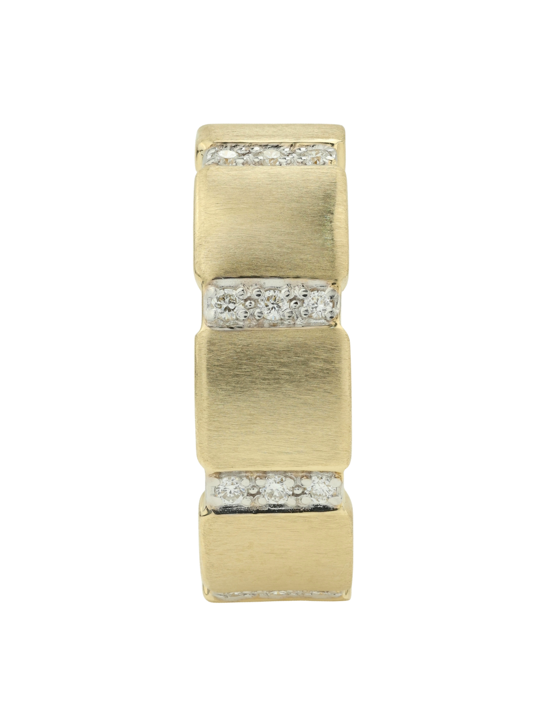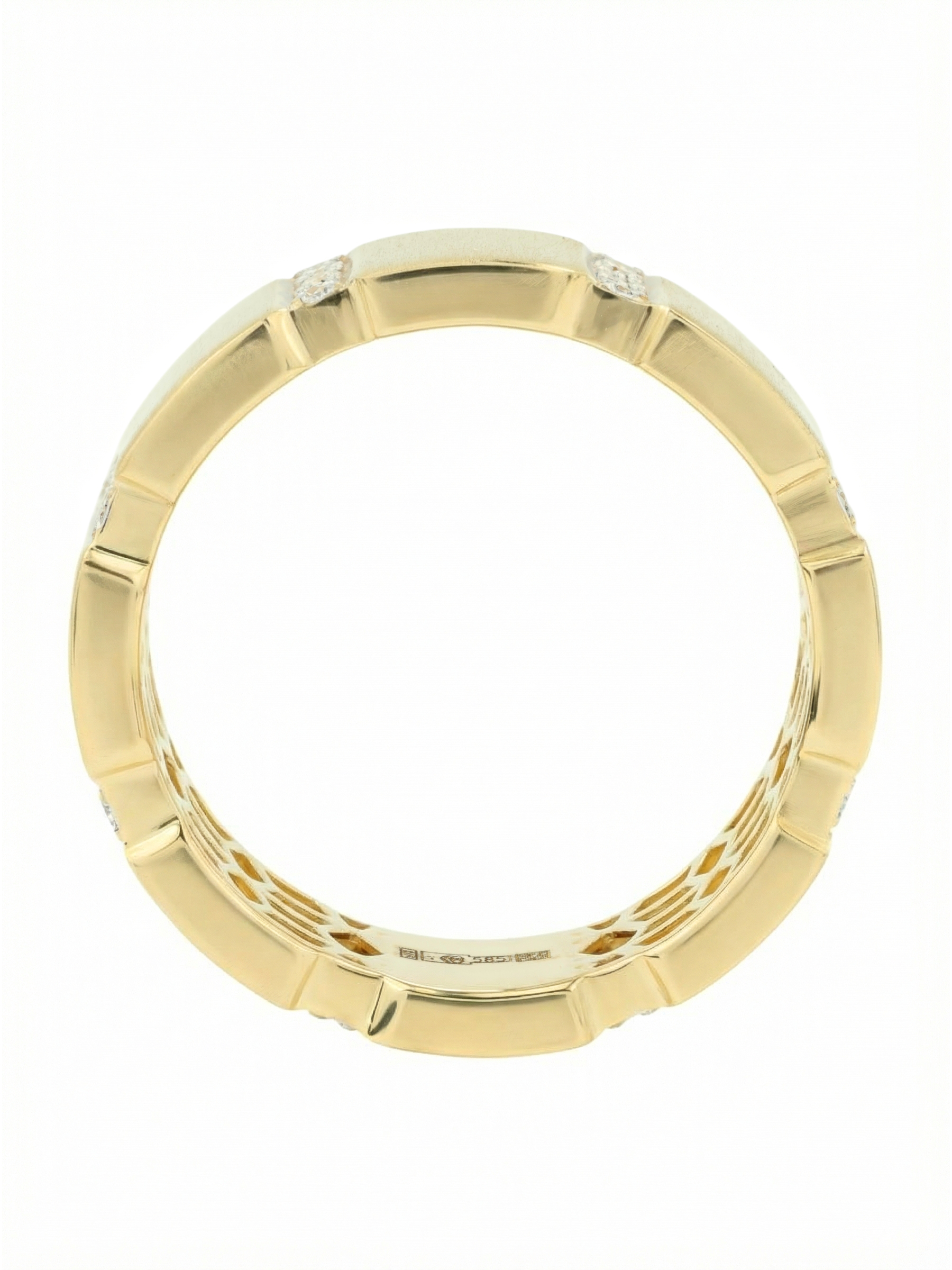 Декоративный акцент модели — 24 бриллианта круглой огранки с сияющим белым цветом вставок. Драгоценные камни деликатно вписаны в структуру изделия, добавляя сдержанный блеск и подчеркивая глубину оттенка лимонного золота. Конструкция кольца продумана до мелочей, обеспечивая комфортную посадку на пальце.