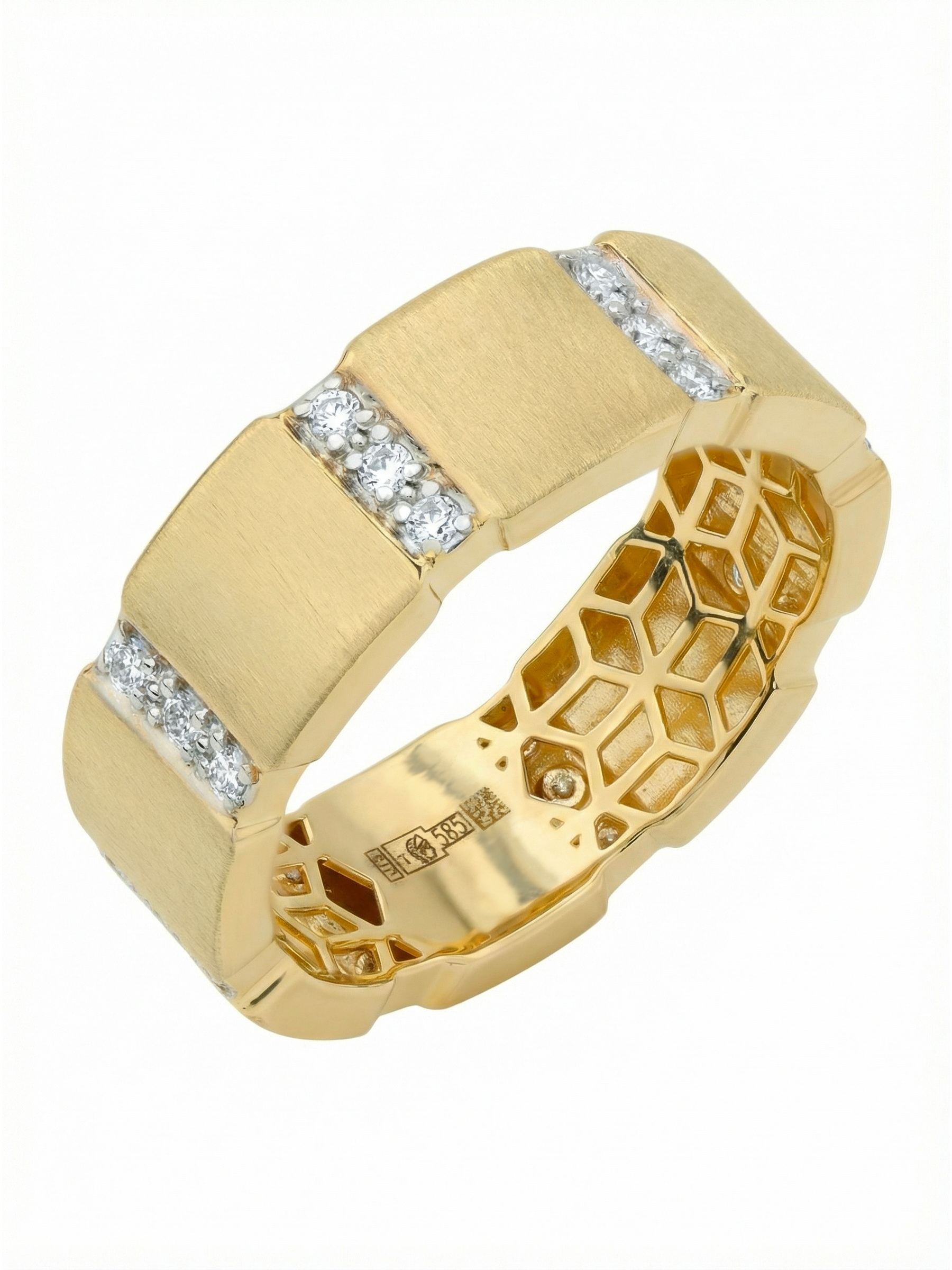 Это универсальное украшение одинаково гармонично смотрится как на женской, так и на мужской руке, что позволяет использовать его в качестве стильного аксессуара или элемента парных комплектов. Широкая размерная сетка, включающая варианты от 15 до 23 размера, поможет подобрать идеальный экземпляр. Кольцо выполнено с вниманием к деталям, где каждый бриллиант надежно закреплен, а внутренняя часть изделия демонстрирует искусную работу ювелиров.