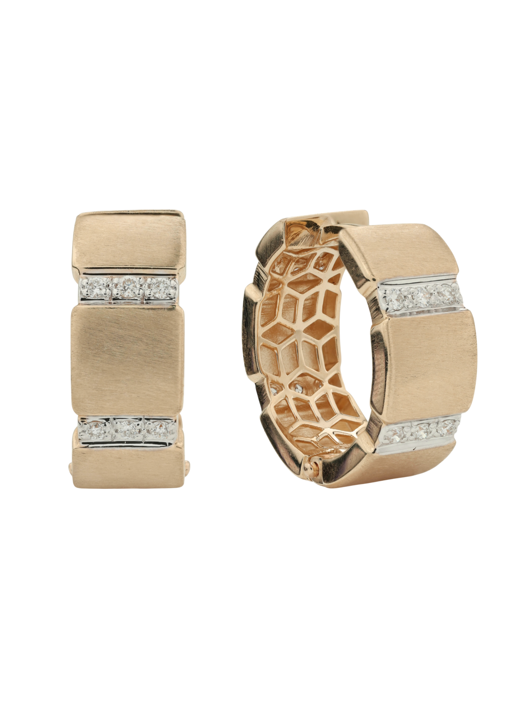 Основу композиции составляет красное золото, которое гармонично дополнено сиянием 24 вставок из бриллиантов. Белый цвет камней круглой формы создает изысканный контраст с теплым оттенком золота, добавляя серьгам особенную выразительность. Геометрическая четкость линий и продуманная фактура делают это украшение универсальным аксессуаром, который одинаково гармонично дополнит как повседневный, так и вечерний образ.