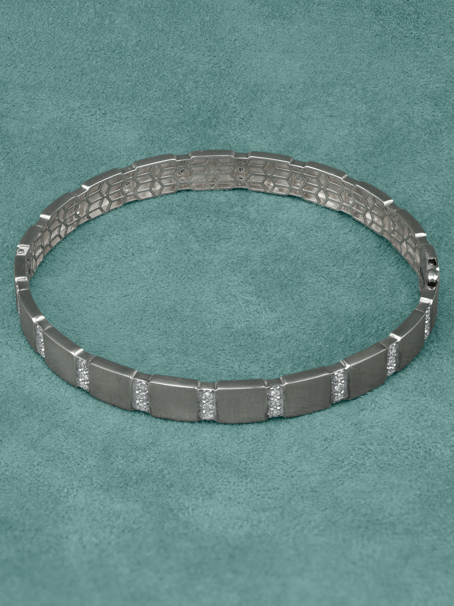 Центральным элементом композиции выступает инкрустация: 54 безупречных бриллианта круглой формы с белым цветом вставок создают завораживающую игру света при каждом движении. Браслет обладает универсальным дизайном, который подойдет как для женщин, так и для мужчин, подчеркивая индивидуальность и статус своего владельца. Размер 17 обеспечивает комфортную посадку на запястье, позволяя изделию выглядеть элегантно и естественно.