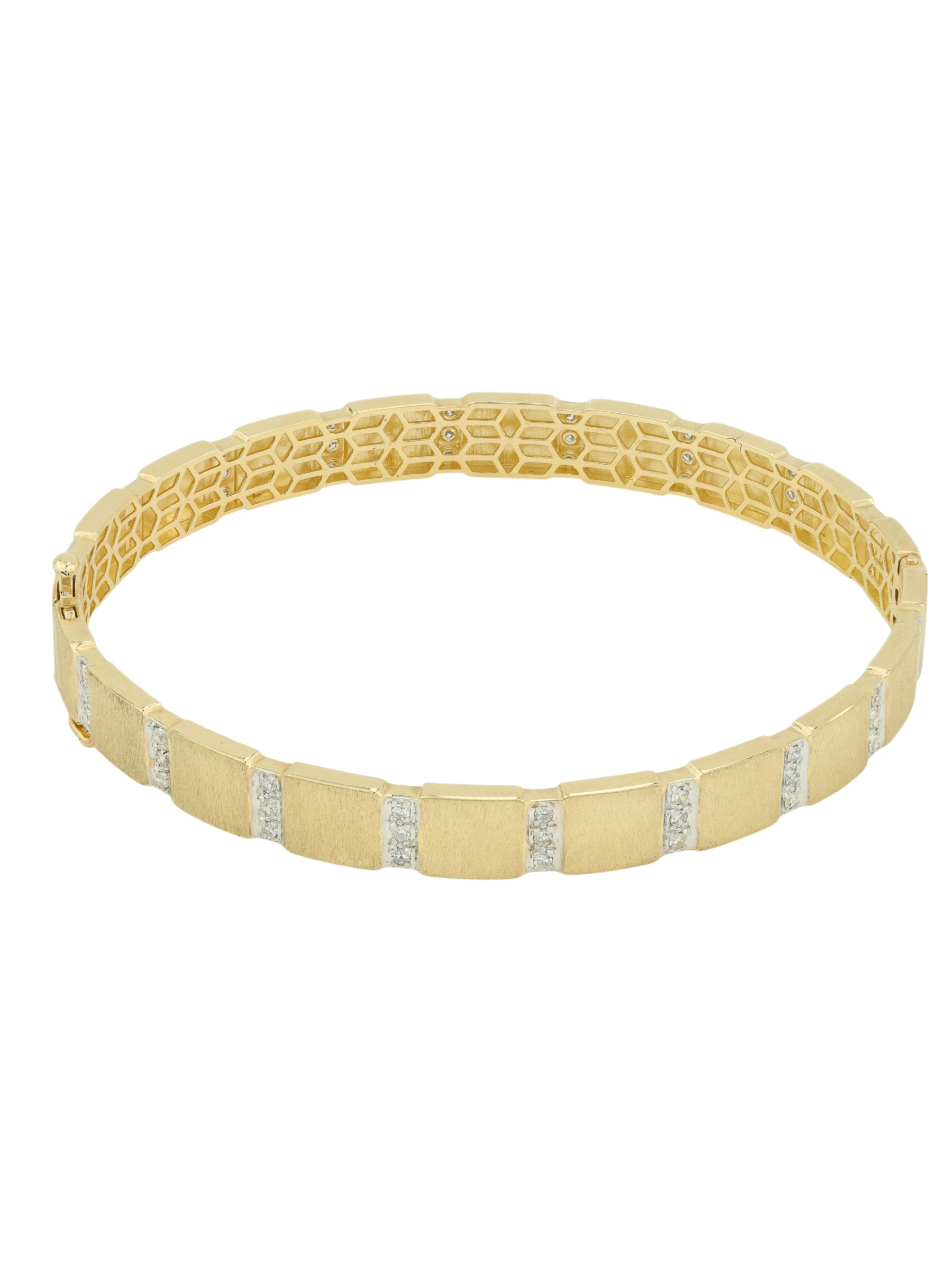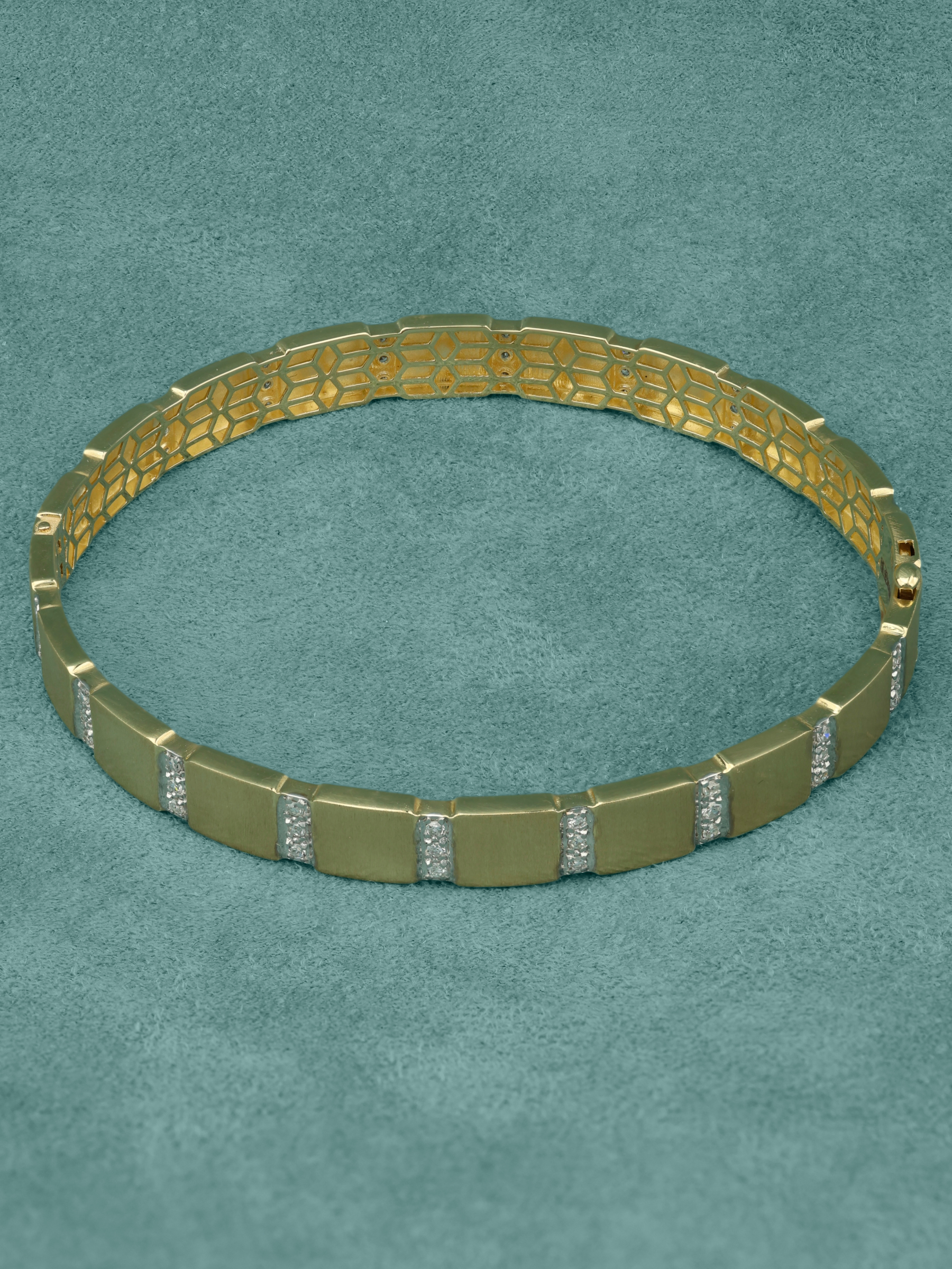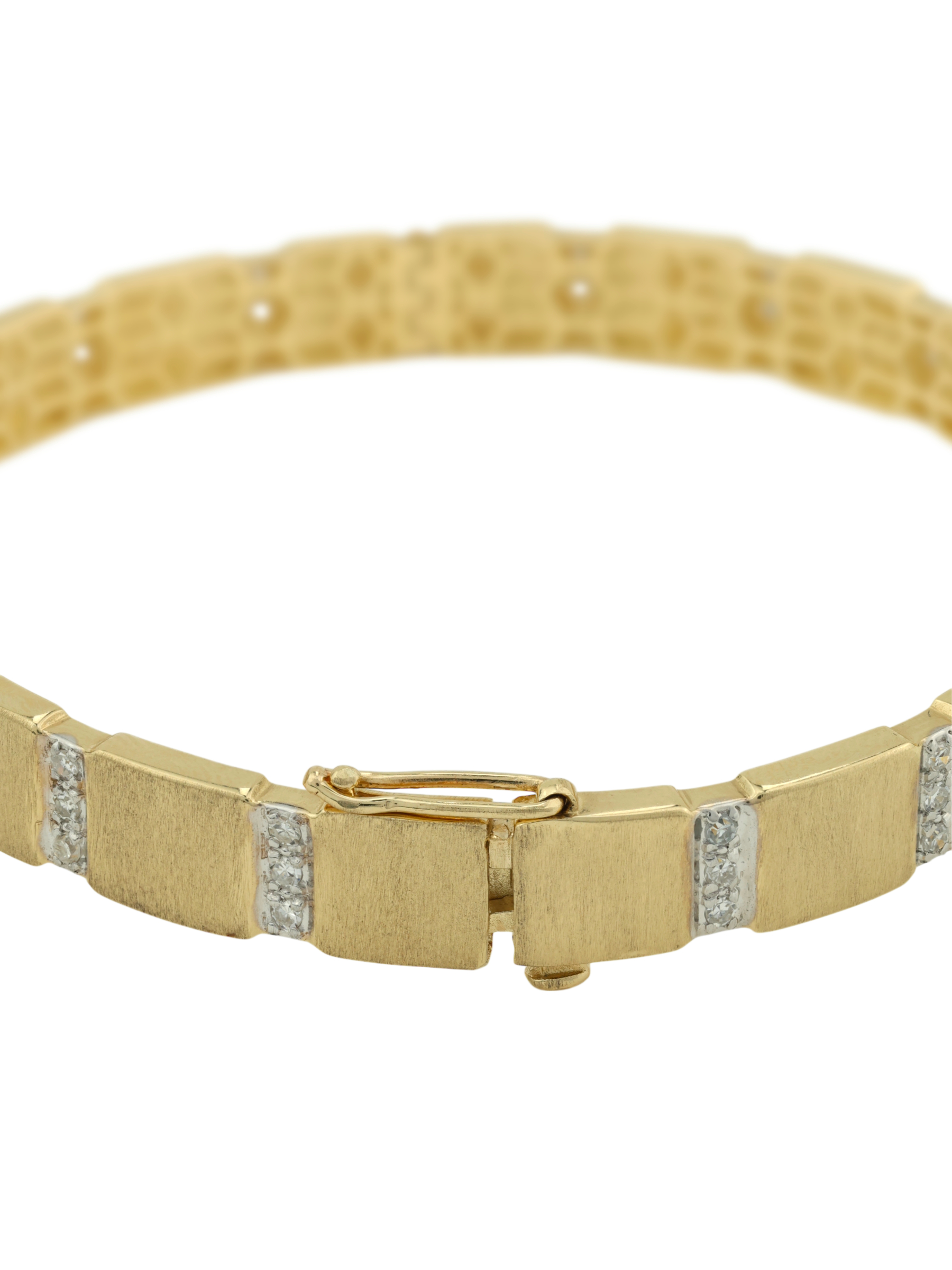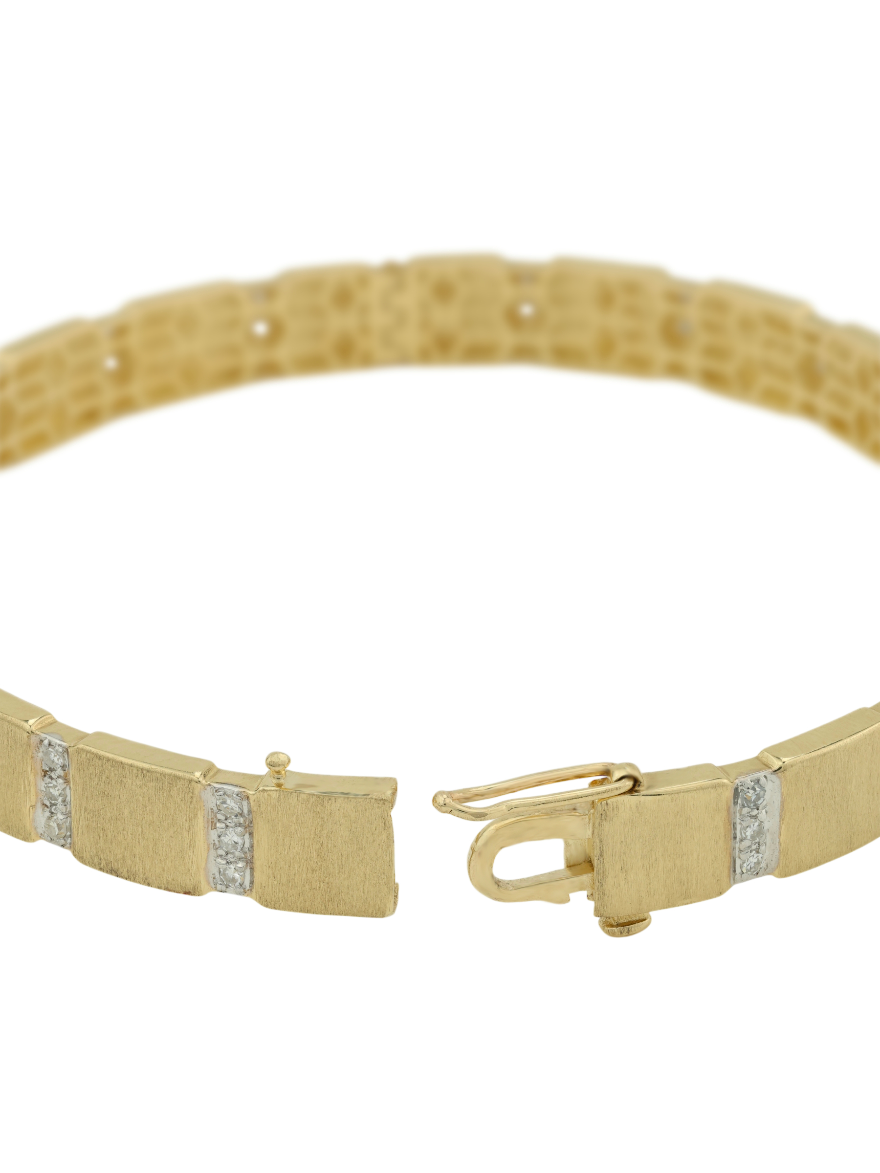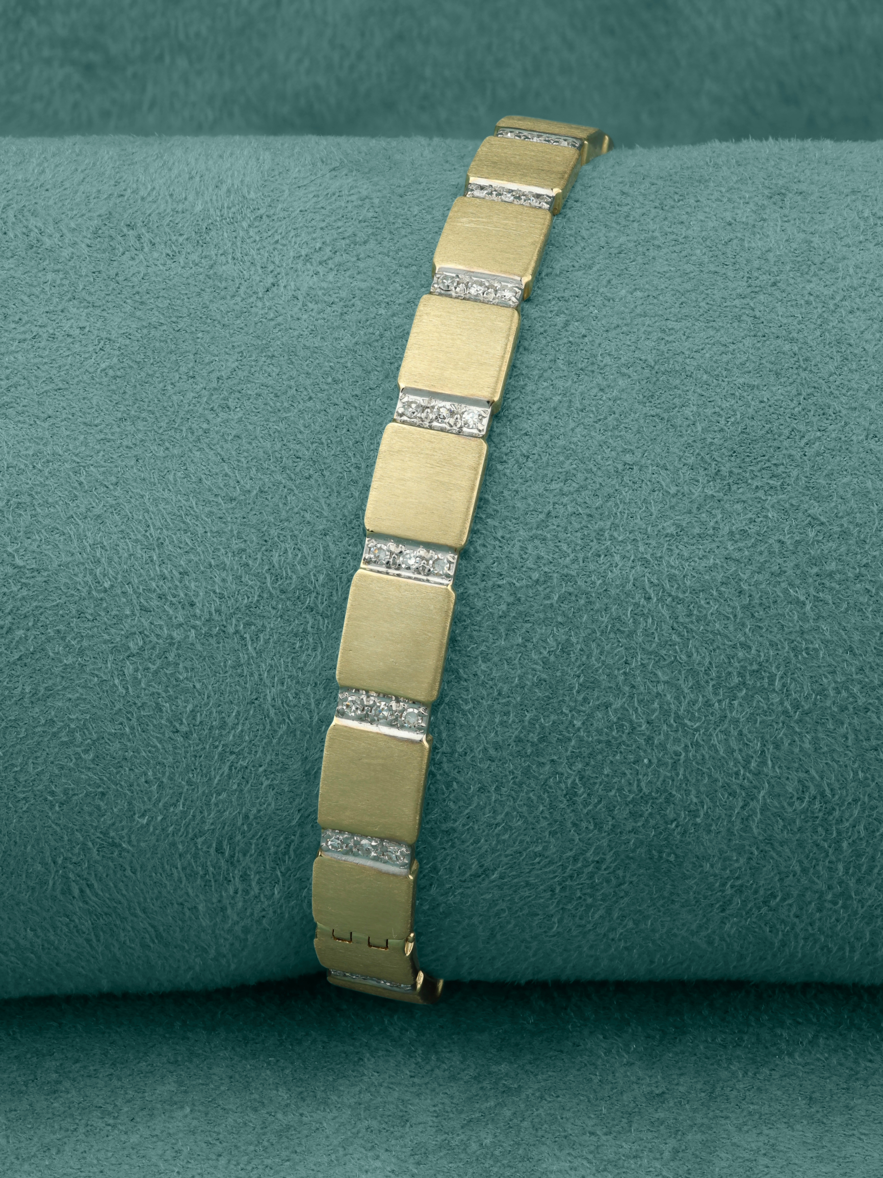 Особую выразительность аксессуару придает роскошная инкрустация — 54 бриллианта круглой формы с ослепительным белым блеском, которые гармонично чередуются с элементами из лимонного золота. Матовое покрытие звеньев создает приглушенный, глубокий отблеск, который выгодно контрастирует с сиянием камней. Благодаря мастерскому исполнению, этот браслет комфортно сидит на запястье, подчеркивая изящество руки. Размер изделия составляет 17.