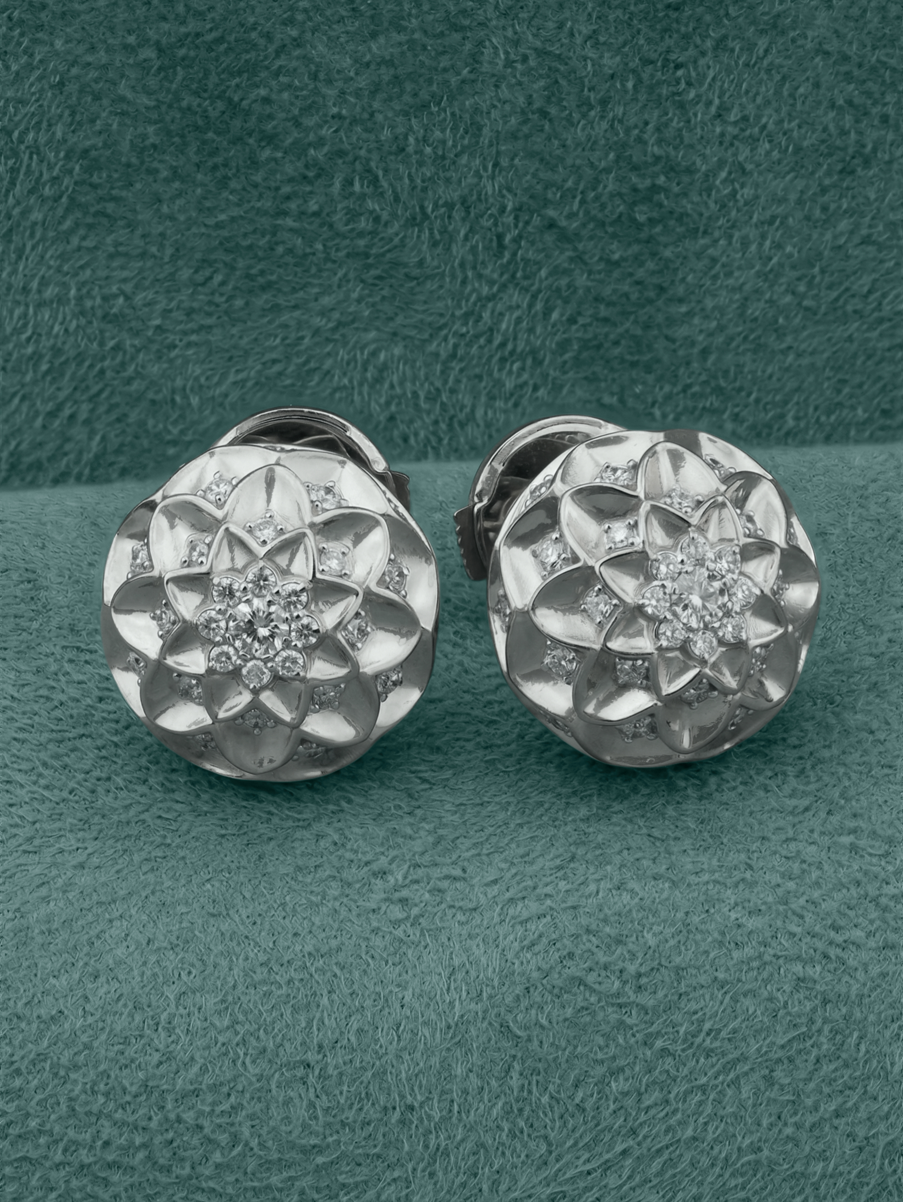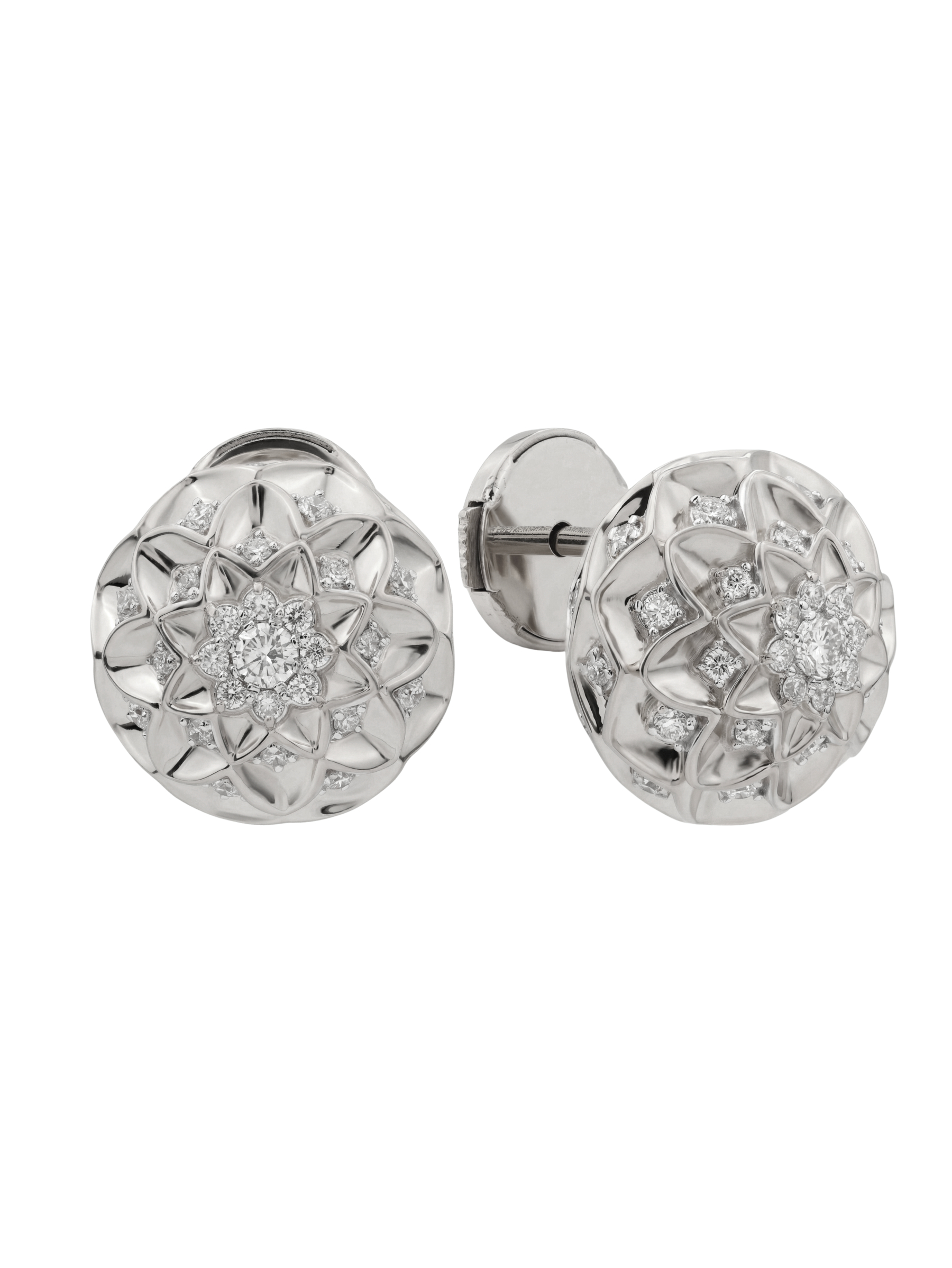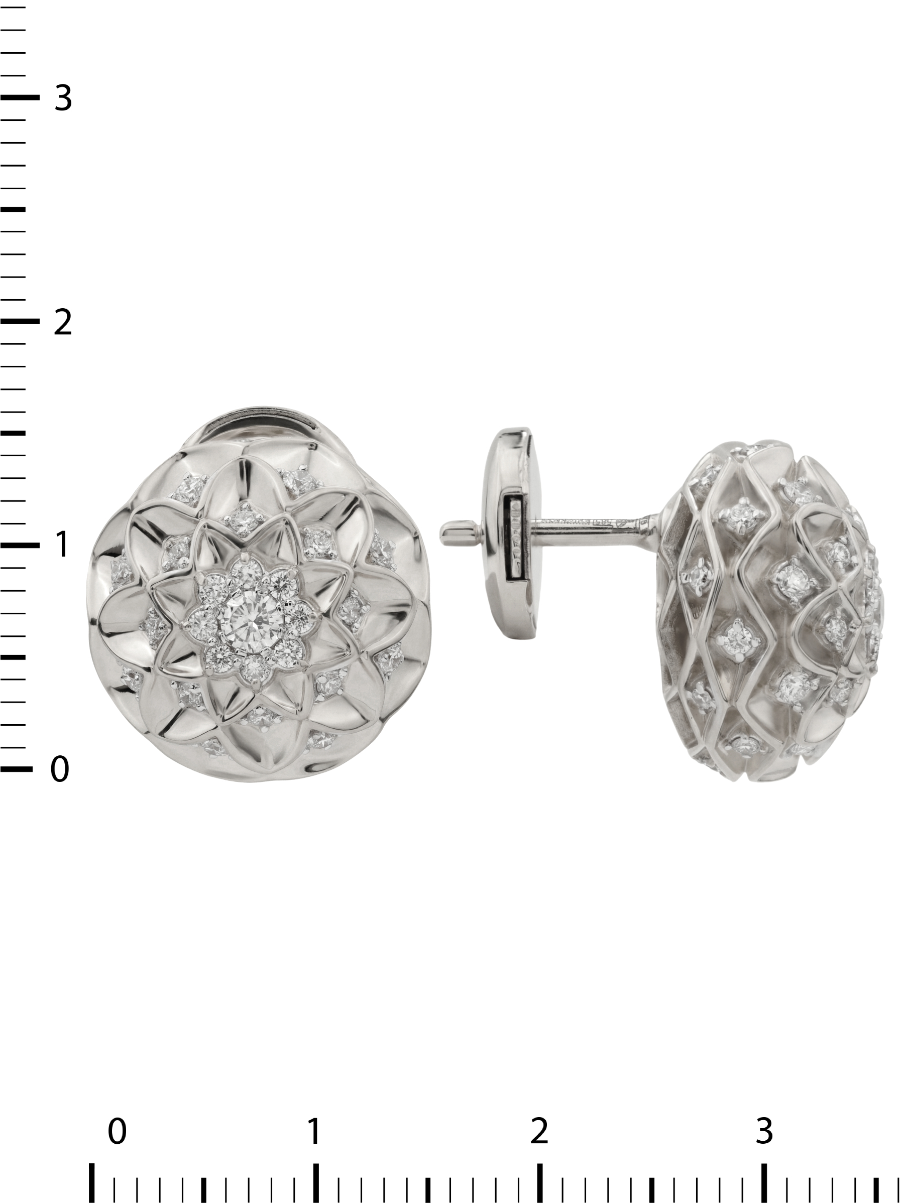 Центральная часть и грани украшения инкрустированы 82 бриллиантами круглой формы с чистым белым цветом вставок. Камень к камню, они создают завораживающую игру света, превращая серьги в произведение ювелирного искусства. Общее оформление изделия в рамках коллекции Vioretty — Georginy подчеркивает его целостность и гармонию. Надежная фиксация вставок гарантирует долговечность и комфорт при повседневном ношении.