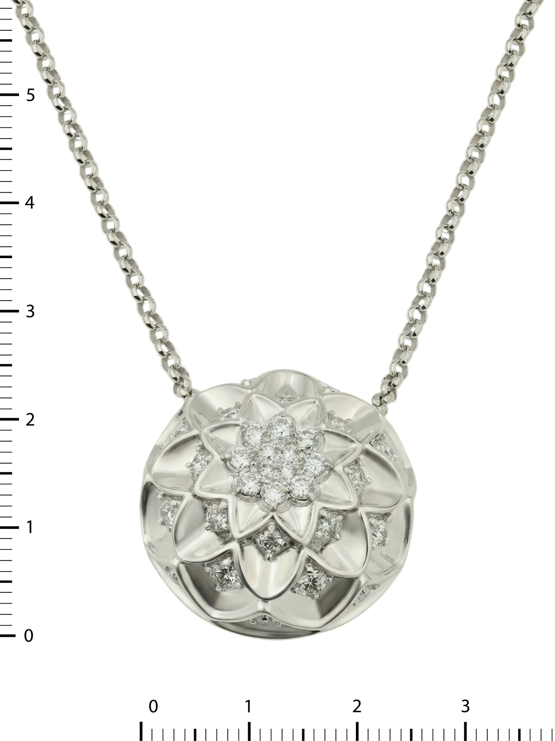 Особую выразительность колье придают 42 сияющих бриллианта. Камни круглой огранки с белым цветом вставок расположены таким образом, чтобы максимально отражать свет при каждом движении, создавая завораживающую игру бликов. Дизайн в форме цветов придает изделию романтичный, но при этом современный и роскошный вид.