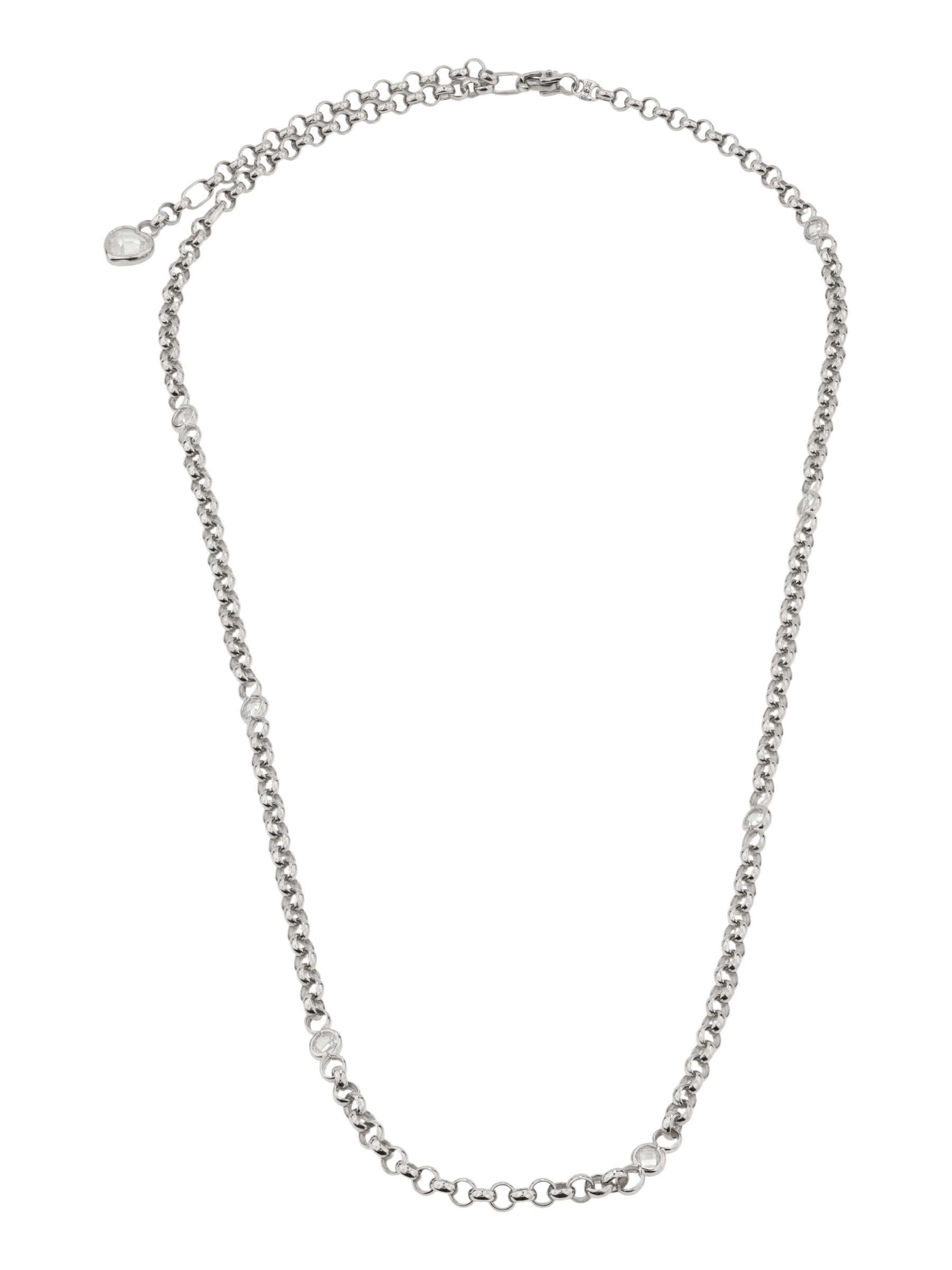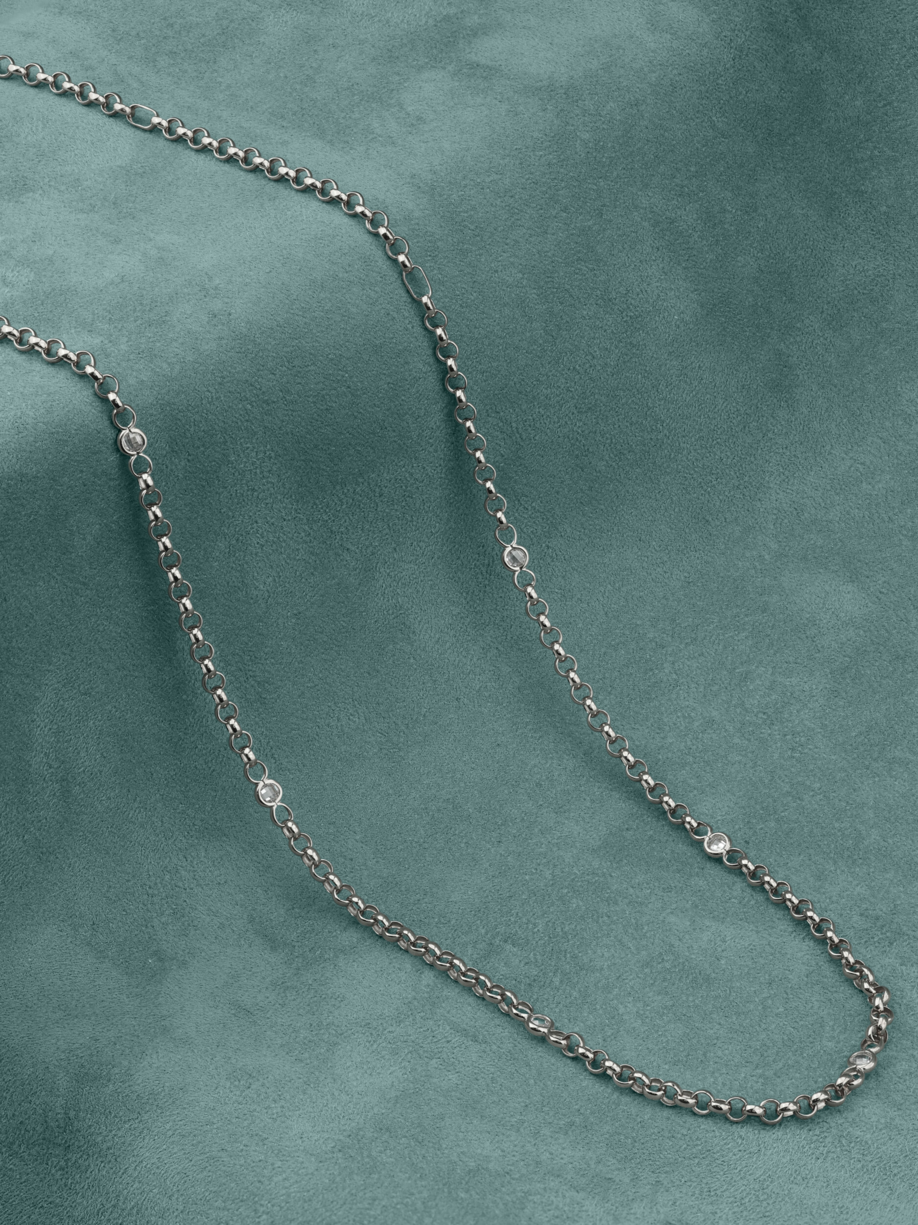 Холодный блеск белого золота гармонично дополнен вставками из сияющих фианитов. В данной модели использовано 8 вставок белого цвета, которые изящно инкрустированы в звенья цепи. Мастера ювелирного дела выбрали для камней классическую форму круг, а также нежные элементы в форме сердце, что придает украшению особую эстетическую привлекательность и глубину. Такое сочетание материалов создает сдержанный, но в то же время роскошный эффект, позволяя изделию красиво переливаться при каждом движении.