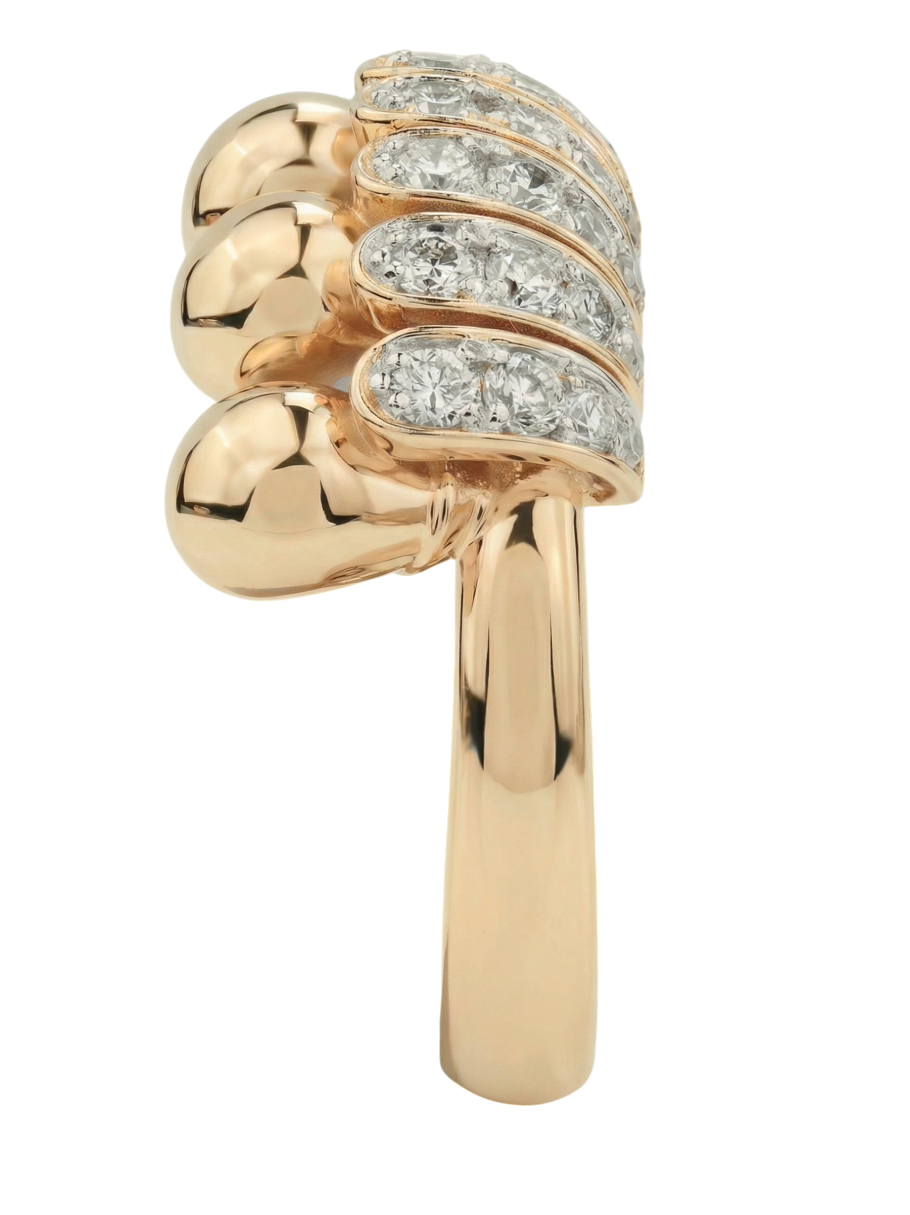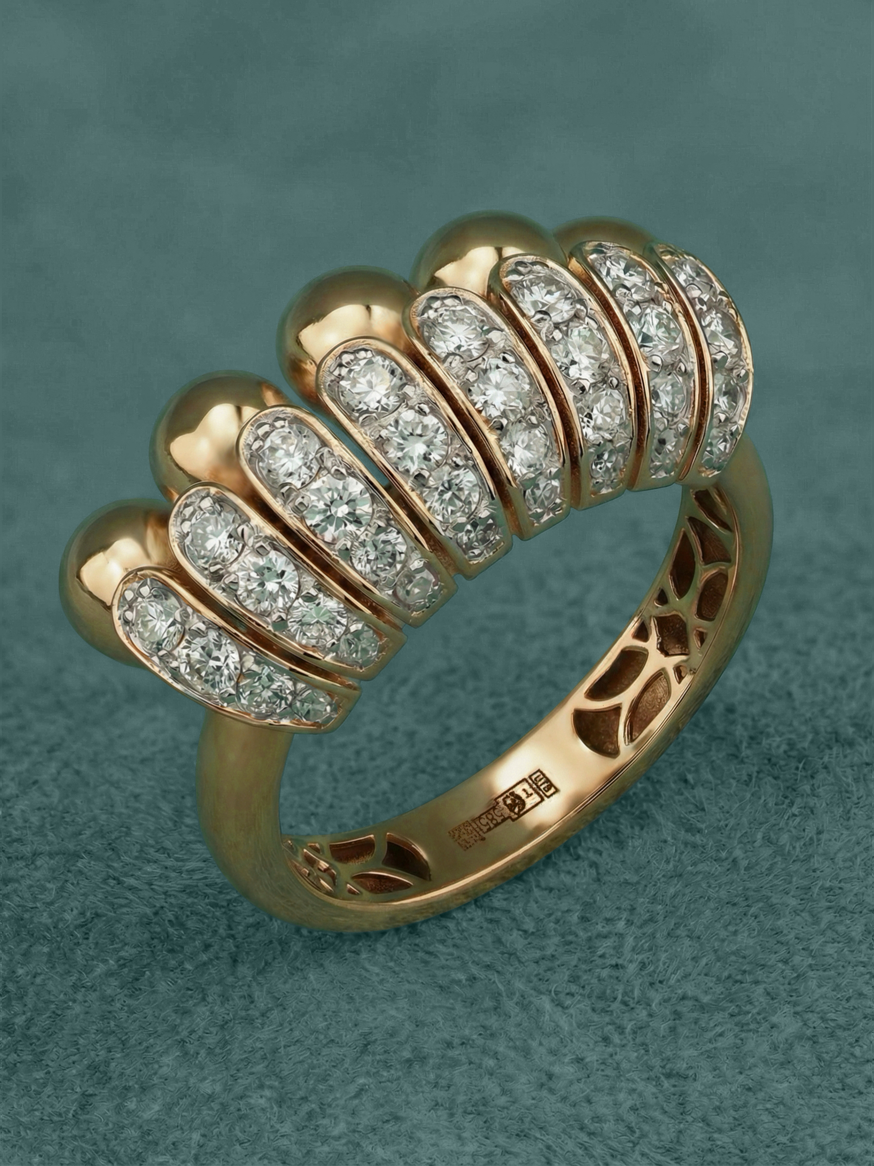 Роскошное кольцо из красного золота 585 пробы — это воплощение изысканности и безупречного итальянского стиля. Мастера ювелирного дела создали украшение, в котором благородный блеск драгоценного металла гармонично сочетается с выразительным дизайном. Центральная часть изделия представляет собой эффектную композицию из объемных золотых сегментов, подчеркнутую сиянием вставок.