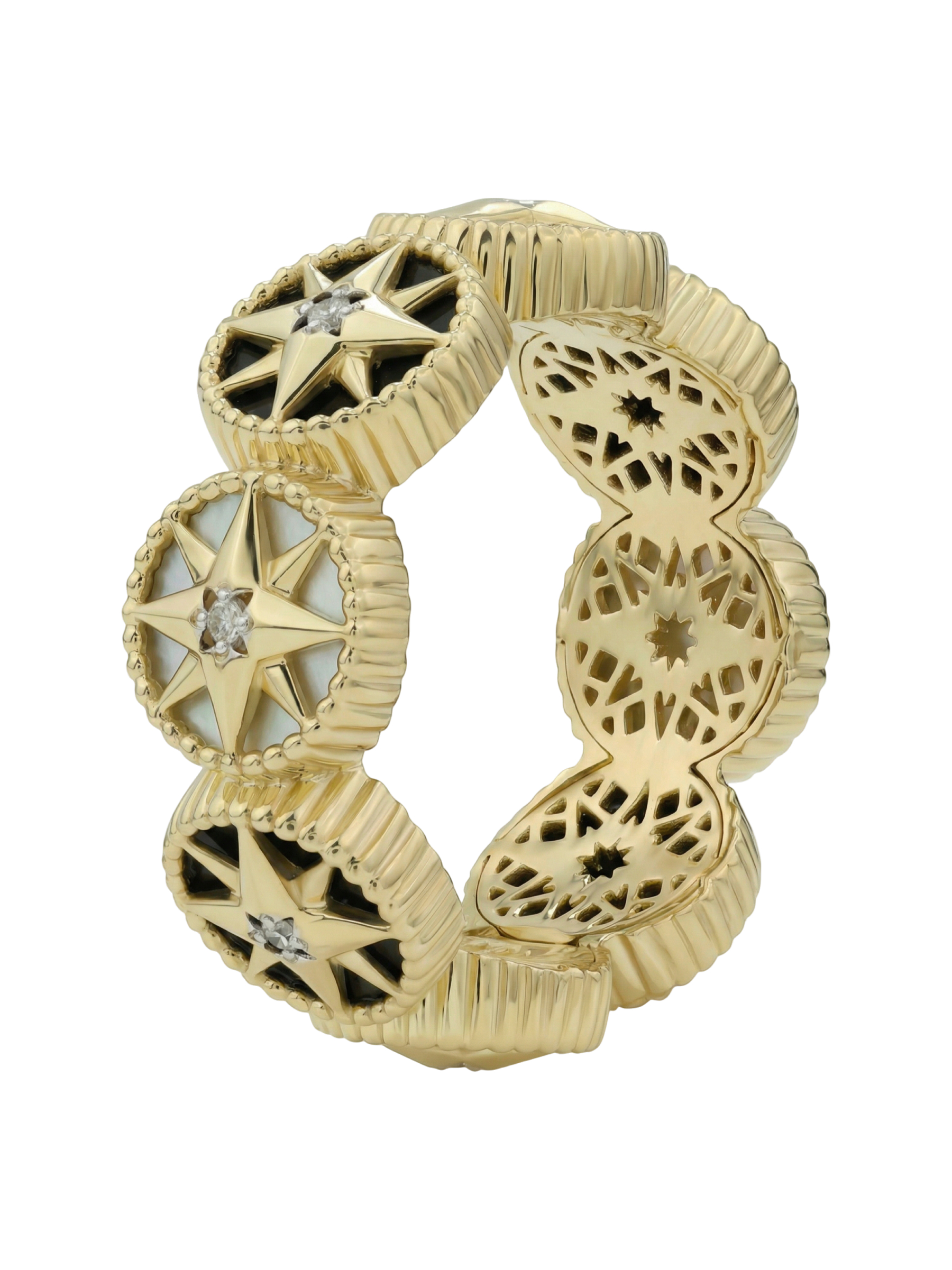 Центральным элементом композиции стали вставки из оникса черного цвета и нежного перламутра, которые контрастируют друг с другом и создают завораживающую игру света. Каждая деталь подчеркнута 12 бриллиантами круглой огранки, сияющими в самом центре звездных мотивов. Использование вставок разной фактуры — белого перламутра и глубокого черного оникса — придает кольцу особую выразительность и глубину.