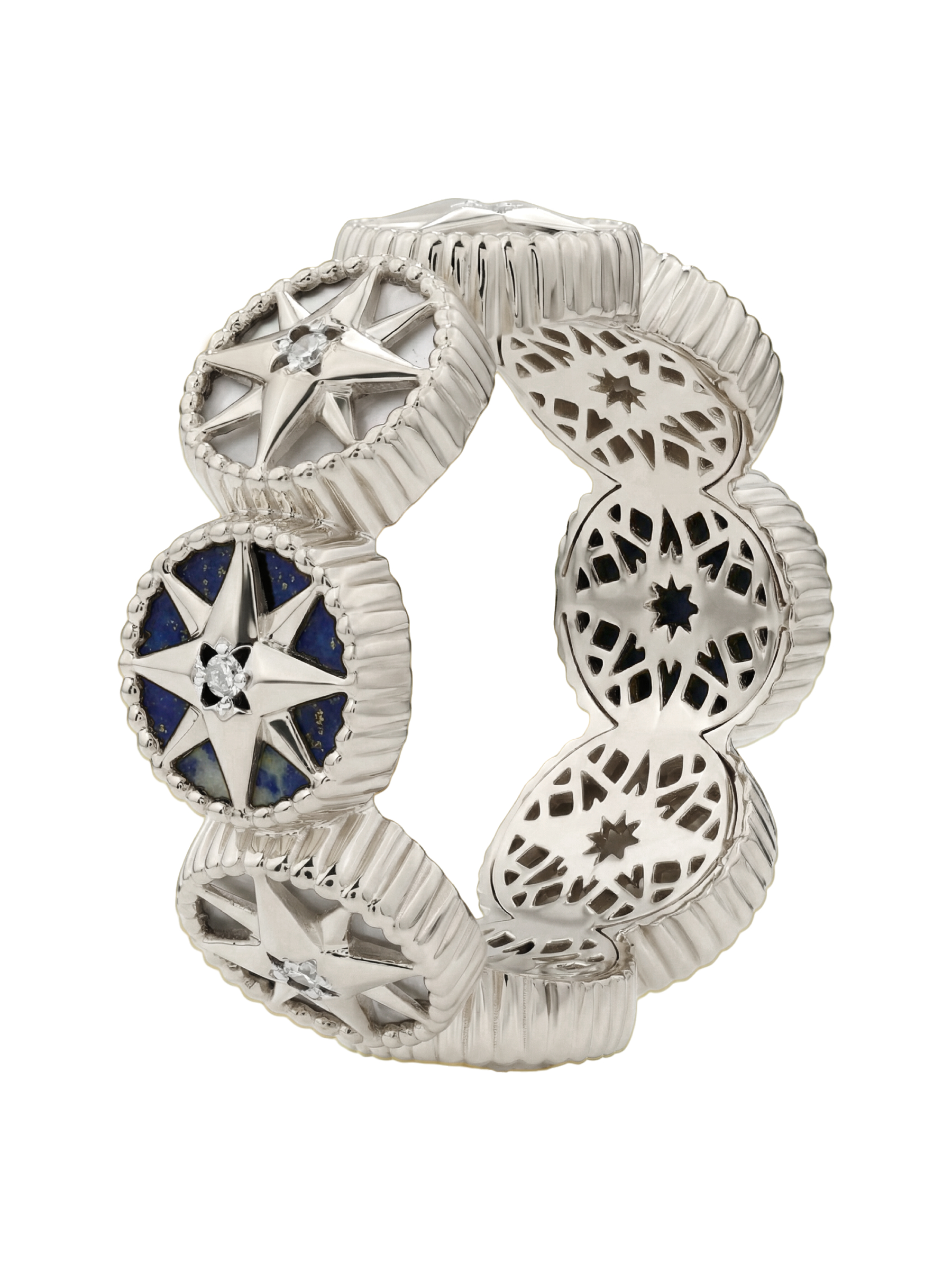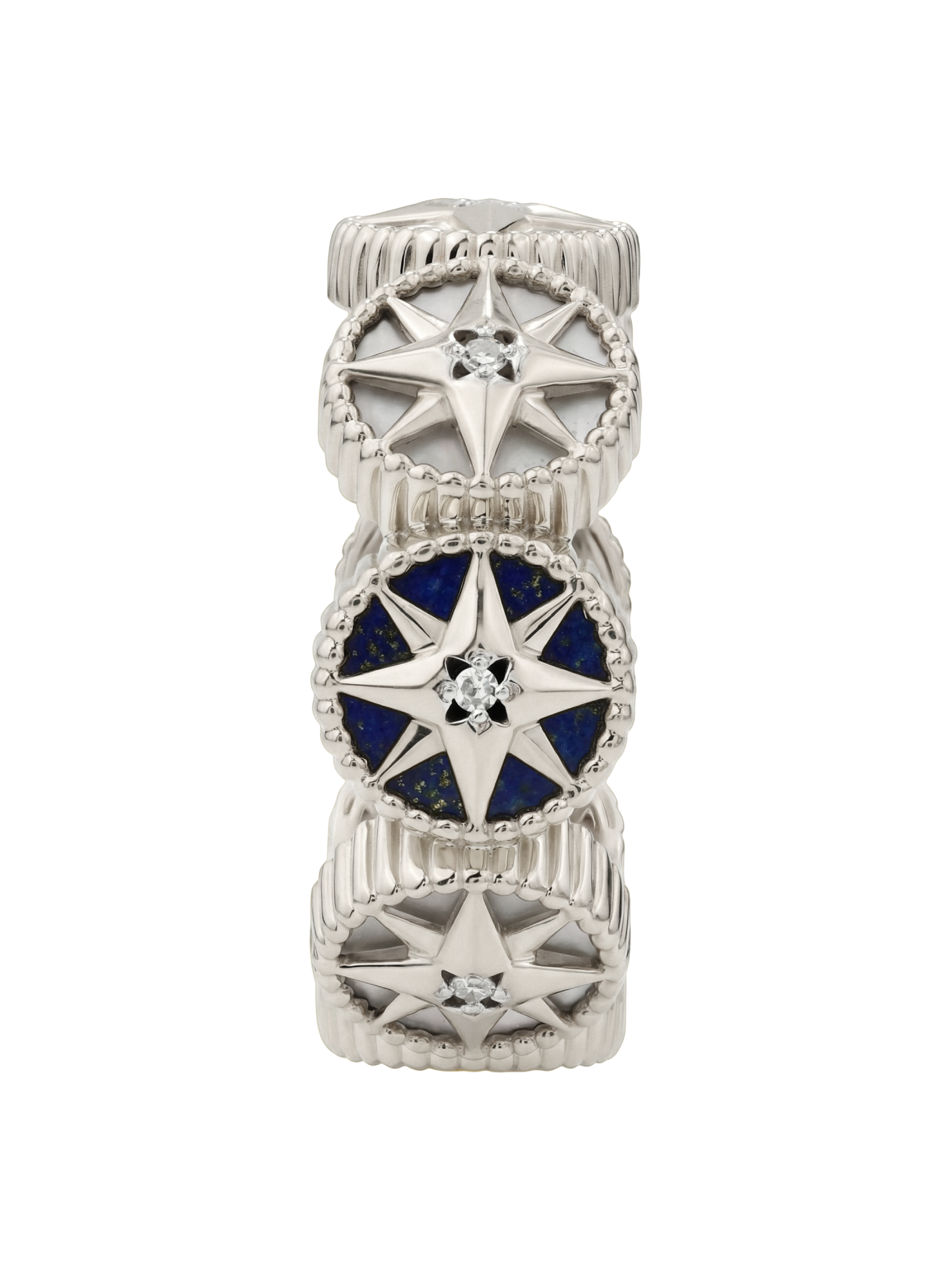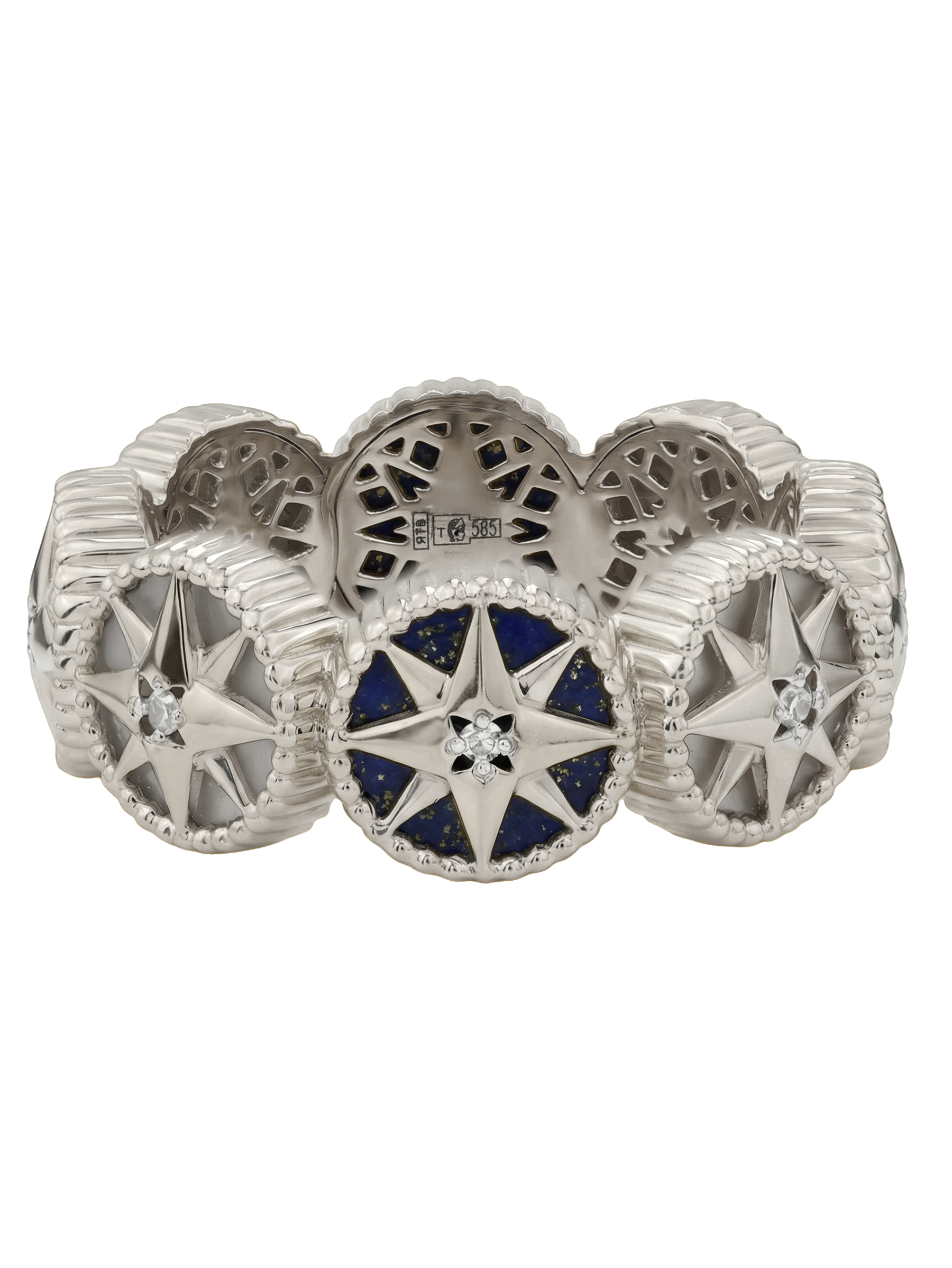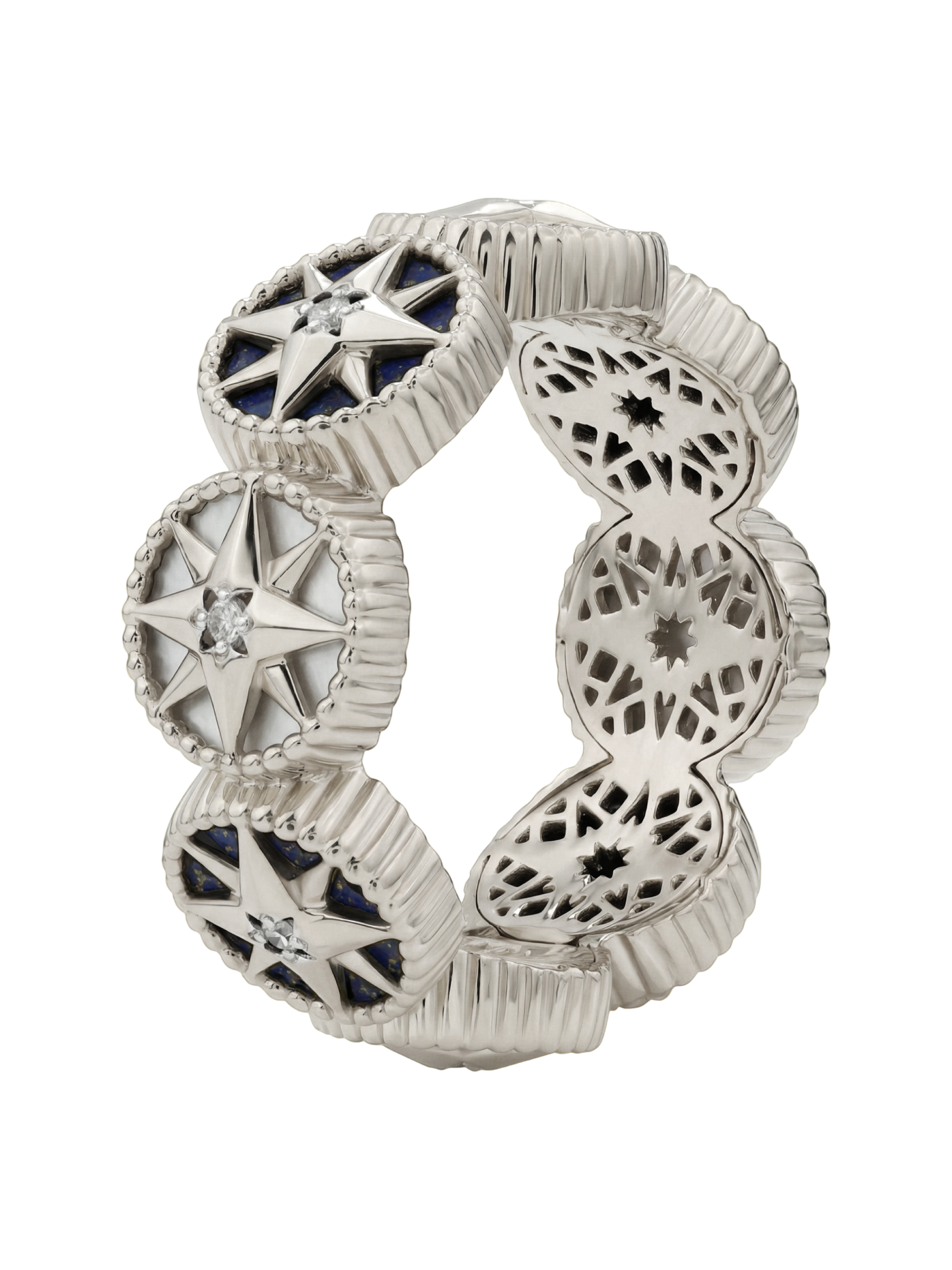 Кольцо из белого золота 585 пробы из коллекции De Luxe — Звёзды — Бриллианты станет безупречным акцентом вашего образа. Дизайн украшения, выполненный в форме звезд, завораживает своей глубиной и продуманными деталями. Мастера ювелирного дела объединили холодный блеск драгоценного металла с роскошным сочетанием вставок: глубоким синим лазуритом и нежным переливчатым перламутром. В центре каждого элемента композиции сверкает бриллиант, придавая изделию особую выразительность.