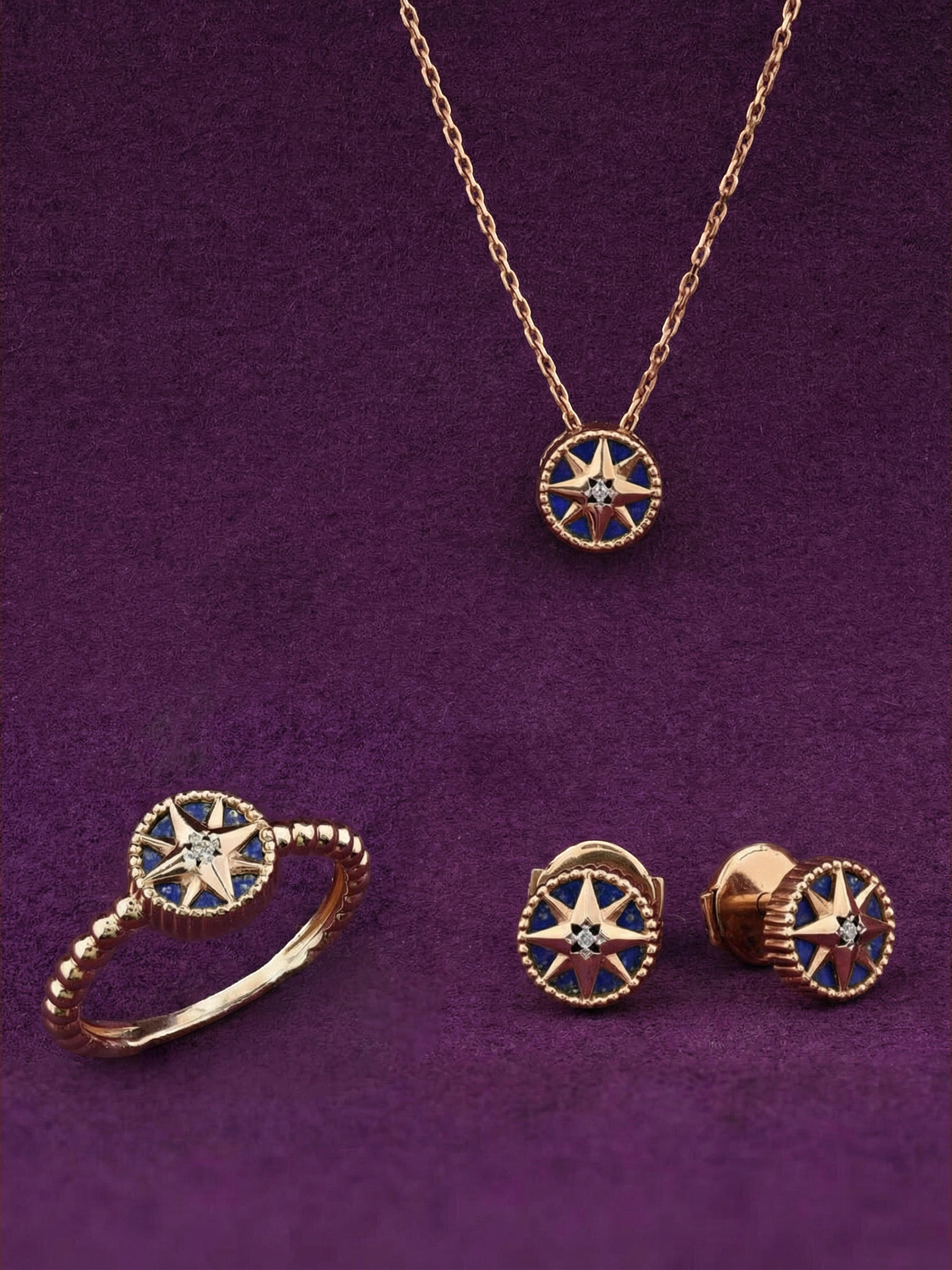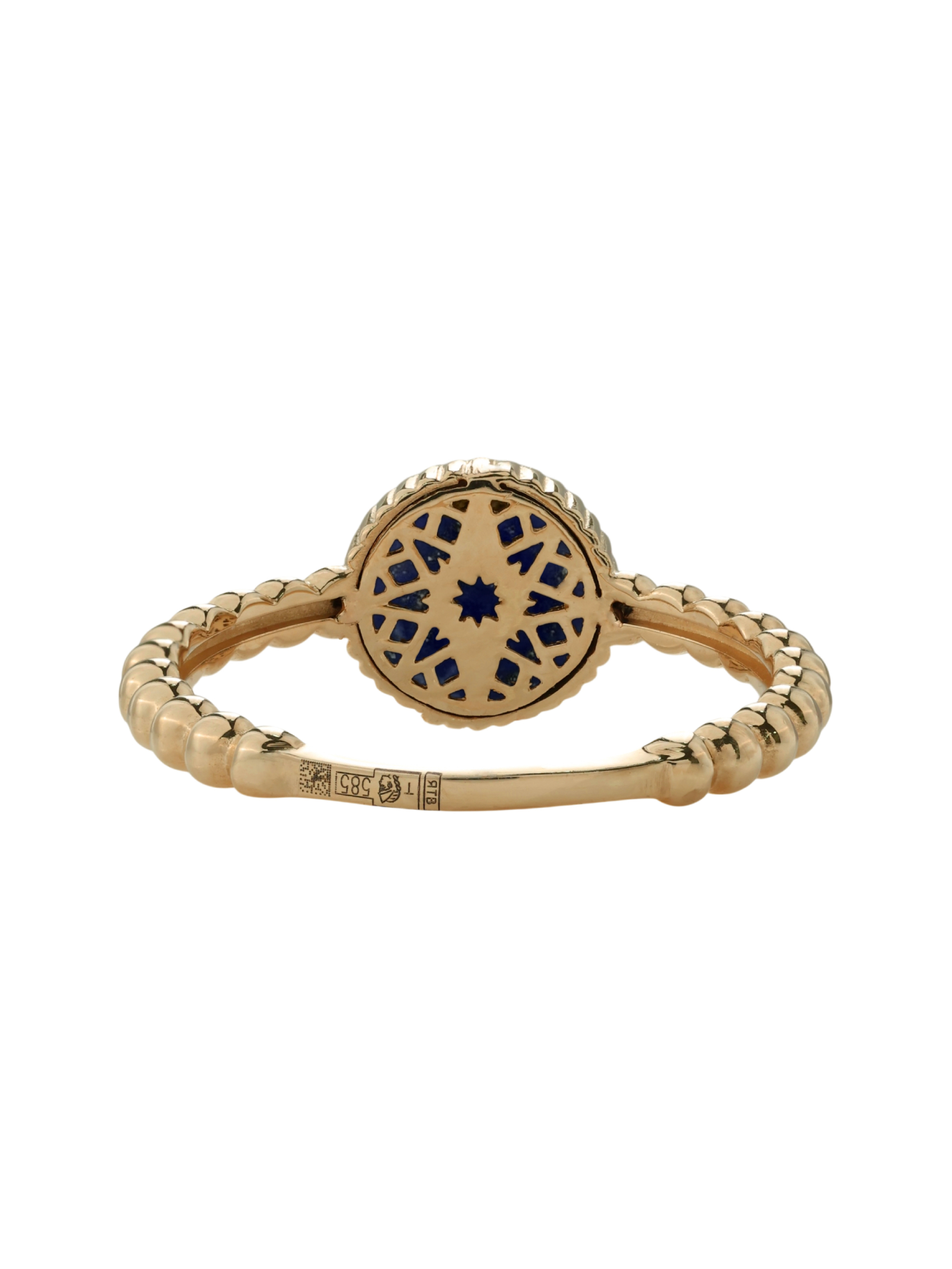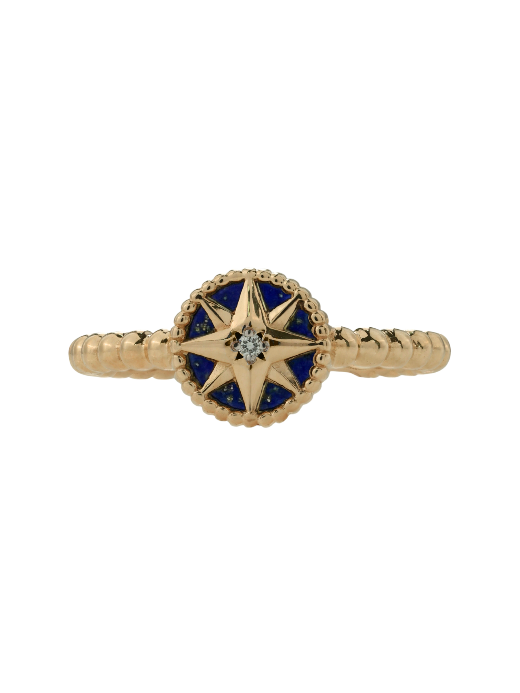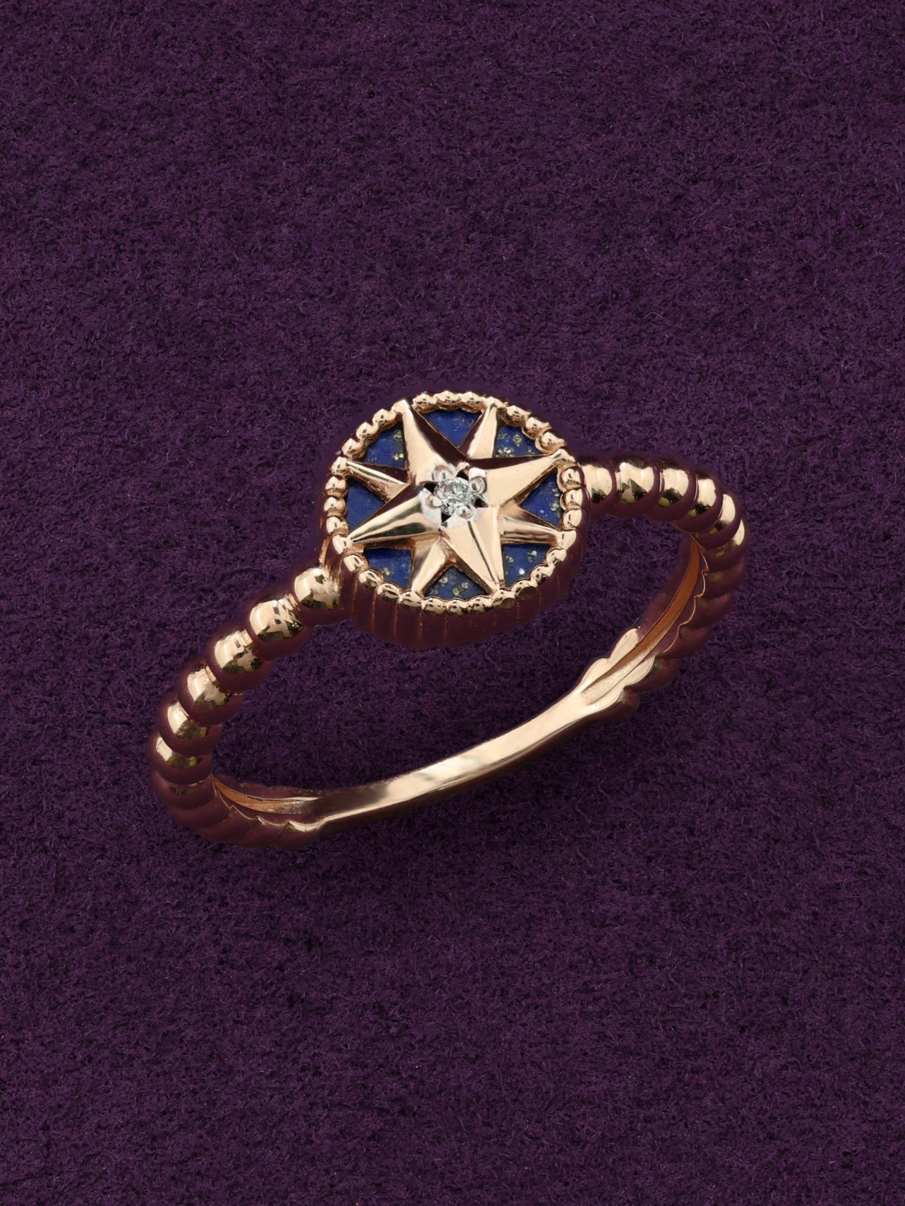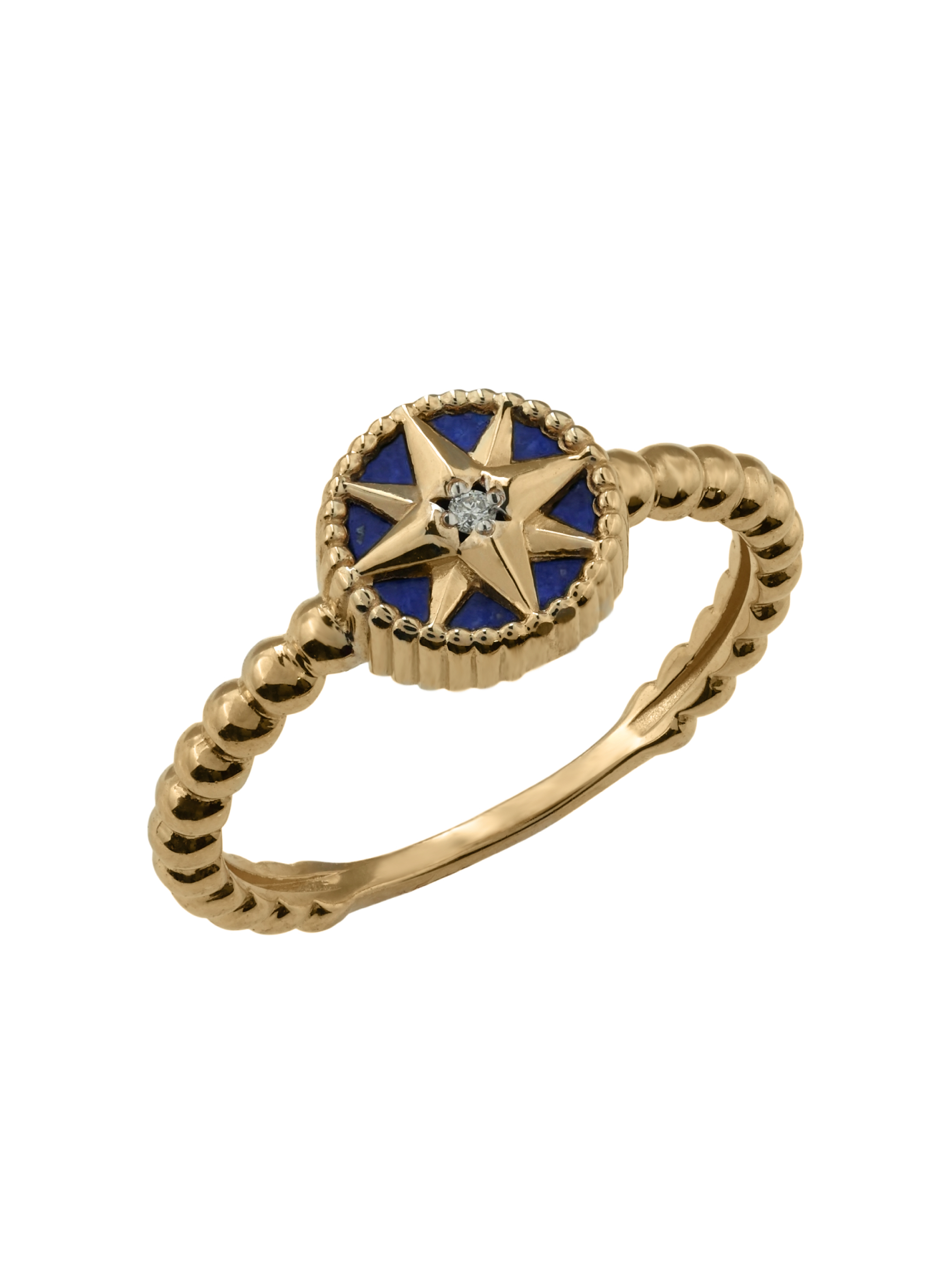 В центре звезды сияет белый бриллиант круглой формы, дополненный глубоким синим оттенком натурального лазурита. Сочетание благородного металла, сверкающего камня и насыщенного минерала создает гармоничный контраст, который выглядит эффектно и современно. Кольцо выполнено в лаконичной, но притягательной стилистике, что делает его универсальным аксессуаром.