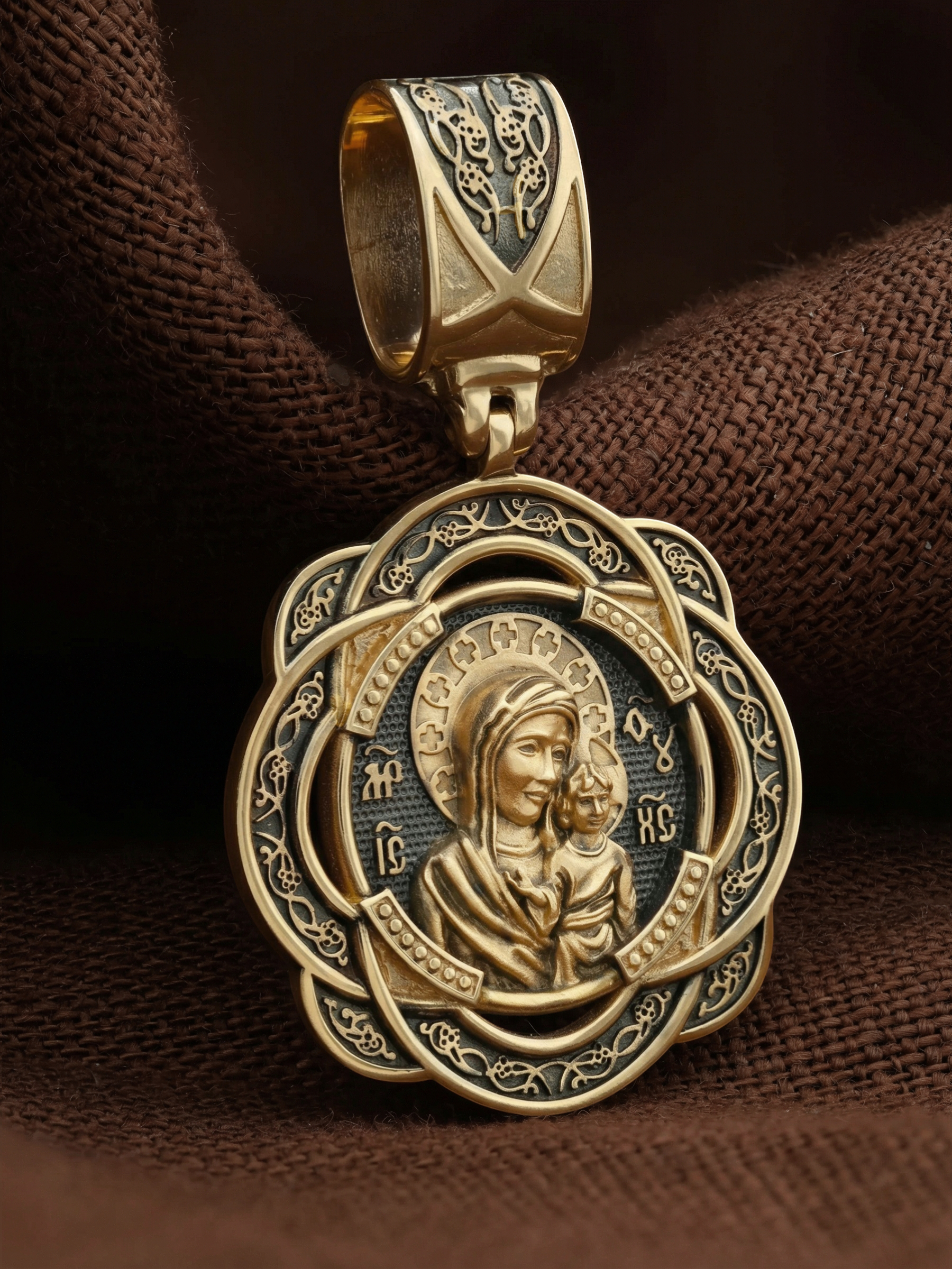 На лицевой части образка изображена Казанская икона Пресвятой Богородицы — одна из самых почитаемых в России чудотворных икон Богородицы. Богословское значение Казанской иконы — указать верующим истинный Путь к спасению, который лежит через Христа. Только Божия Матерь имеет настолько сильное дерзновение к Спасителю, что может ходатайствовать перед Ним за всех верных. Именно этот образ дарится новой повенчанной паре, как хранитель очага и семейная реликвия. Молитва перед Казанской иконой Божьей Матери помогает во всех сложных случаях жизни, в болезнях, во всех печалях, невзгодах, скорбях. Уникальная история появления, чудеса, случившиеся по молитвам православных людей возле образа — все это делает Казанскую Богородицу особенной, среди тысяч других икон.